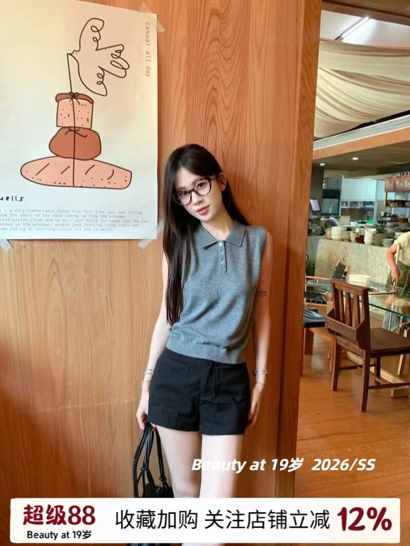 한 부서 미니멀리즘 POLO 칼라 민소매 니트 조끼 맨위 여름 2026 새로운 검정색 몸매 가꾸기 슬림해 보이는 반바지 세트