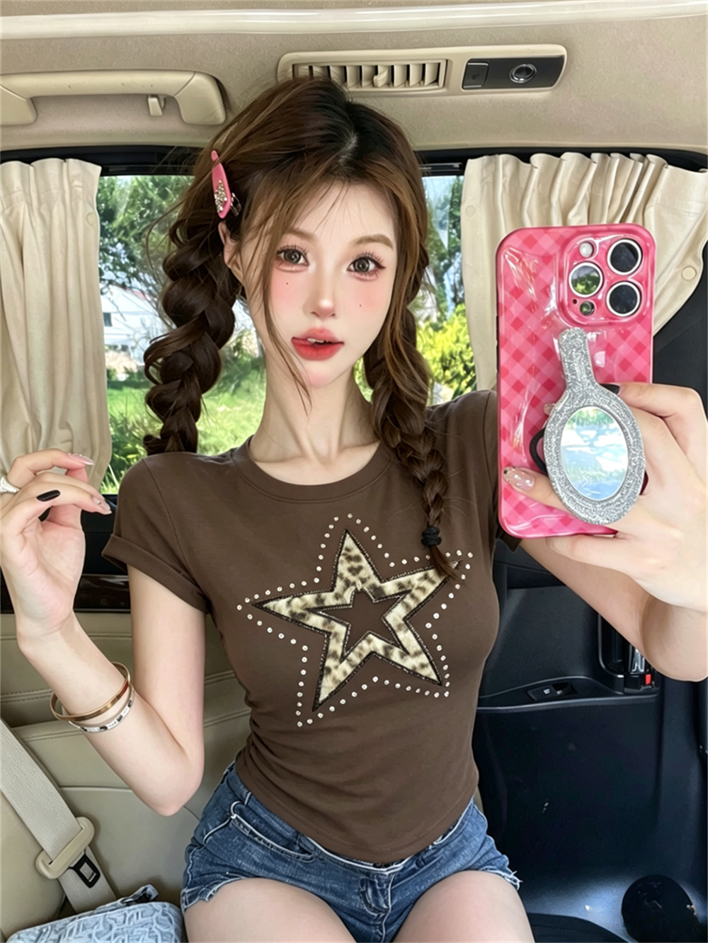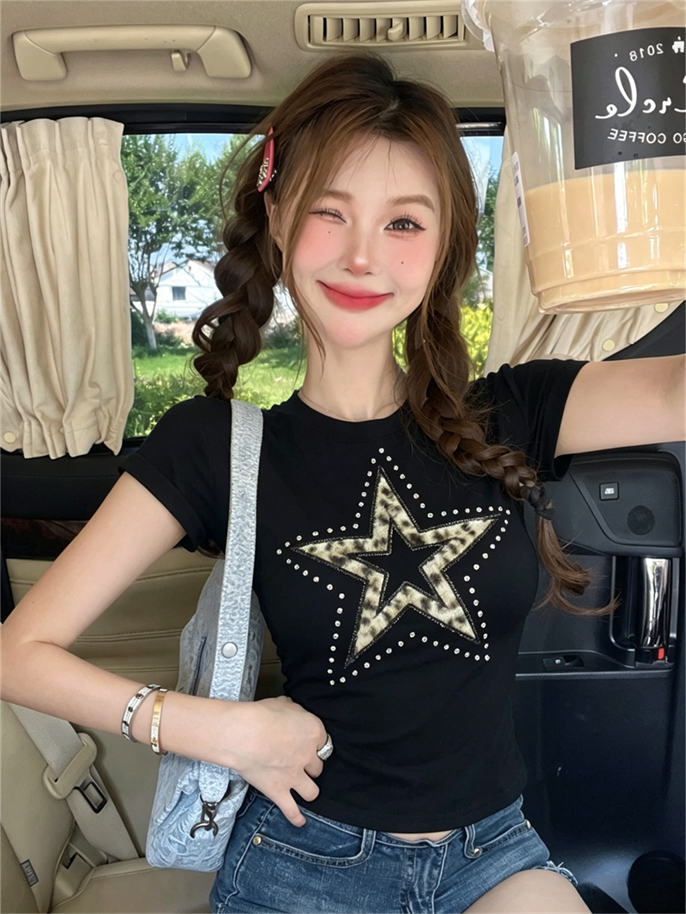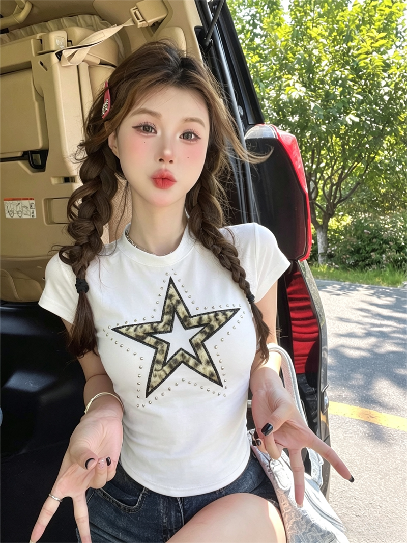 실사 여름 디자인 센스 라운드 넥 패치워크 오각형 별 프린트 몸매 가꾸기 반팔 맨위 핫걸 쇼트 스타일 품격 티셔츠