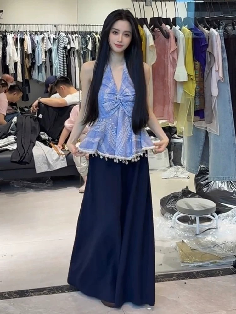 자이언트 잘 생긴 ~ 중 여름 세트 작은 키 아메리칸 핫걸 레이스 조각 V넥 티셔츠 맨위 플리츠 스커트 투피스 세트