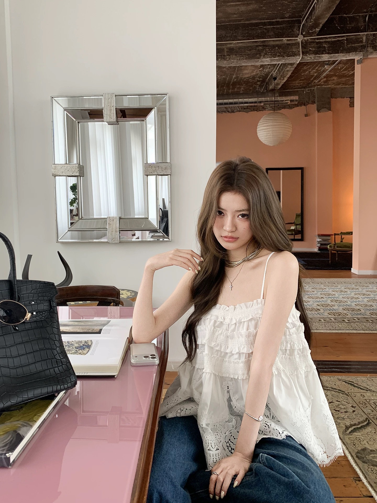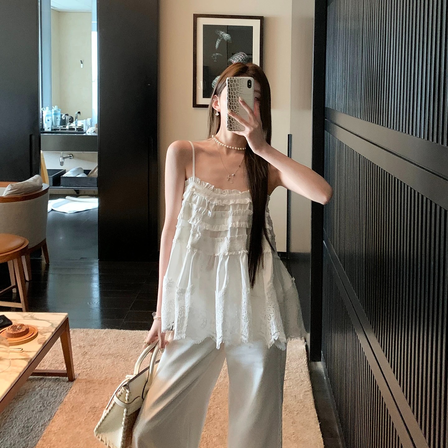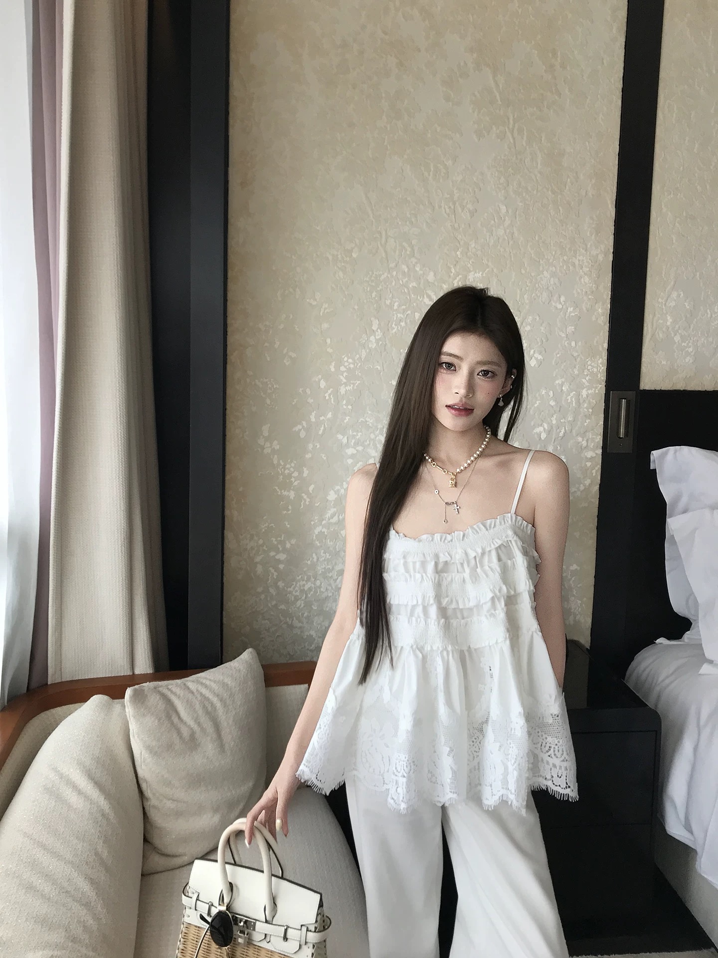 지구 가게 Chic 요정 가스 레이스 레이스 홀로우 아웃 화이트 튜브탑 맨위 여성 여름 외출용 주름 캐미솔