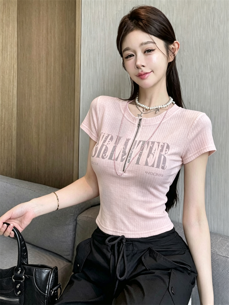 실사 여름 한국 스타일 반 개방 칼라 패치워크 지퍼 몸매 가꾸기 알파벳 반팔 풀오버 핫걸 쇼트 스타일 스트라이프 티셔츠