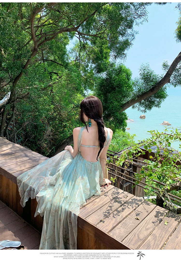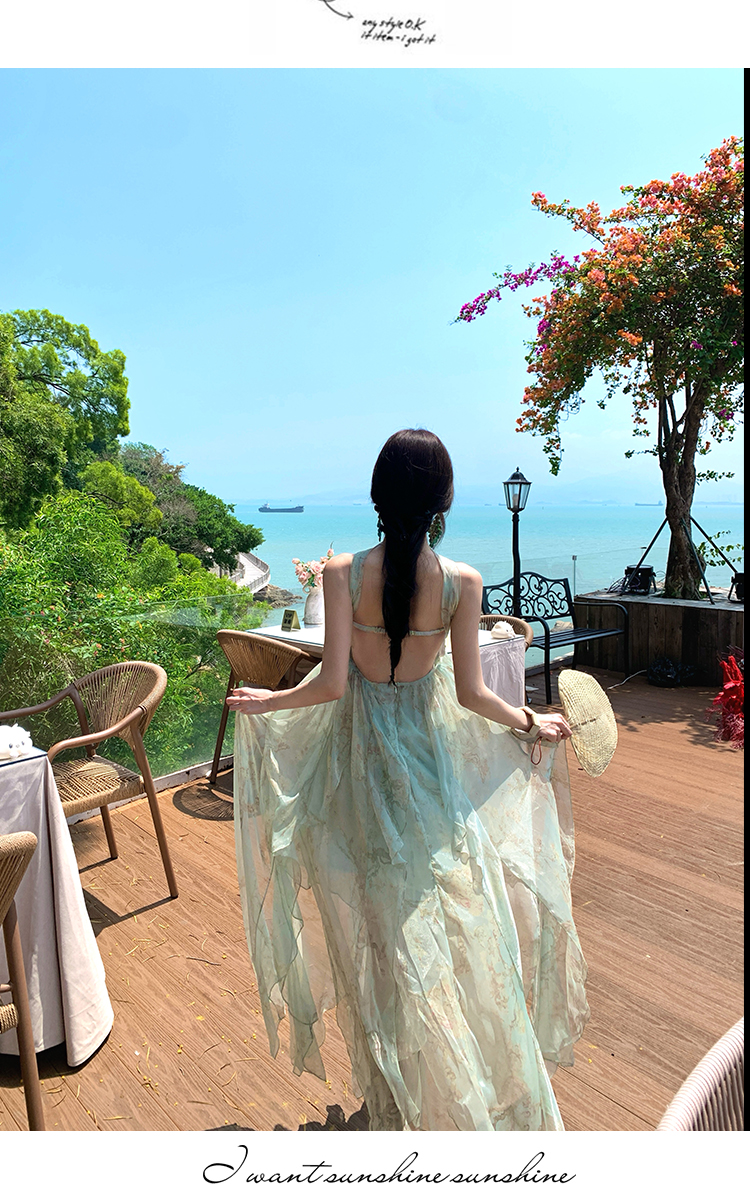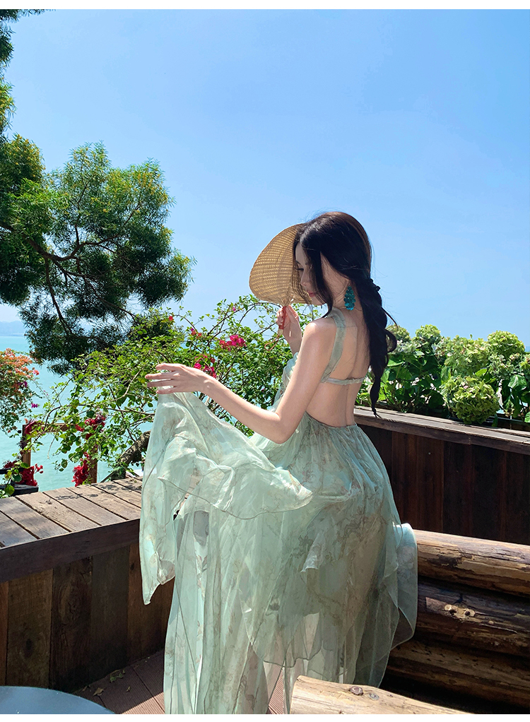 레이스 조각 백리스 슬립 여성 드레스 여름 허리 수축 슬림해 보이는 빅 플레어 스커트 부드러운 휴가 바람 한 마디 롱 스커트