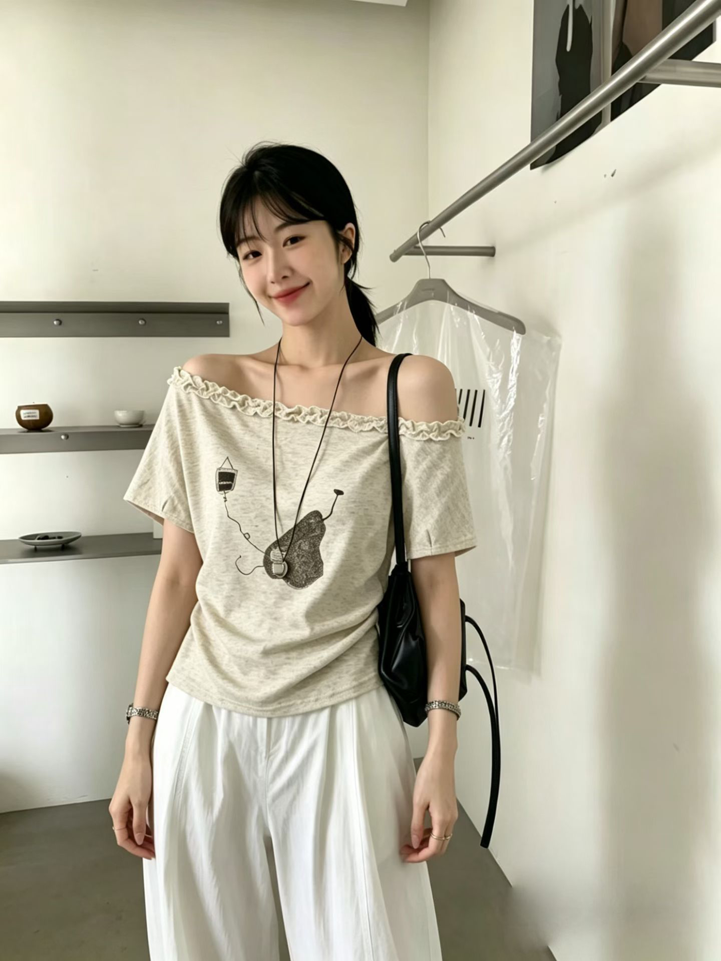 한 부서 레트로 알파벳 프린트 비스듬한 어깨 긴팔 티셔츠 여성 2026 여름 연령 감소 캐주얼 자외선 차단 세트