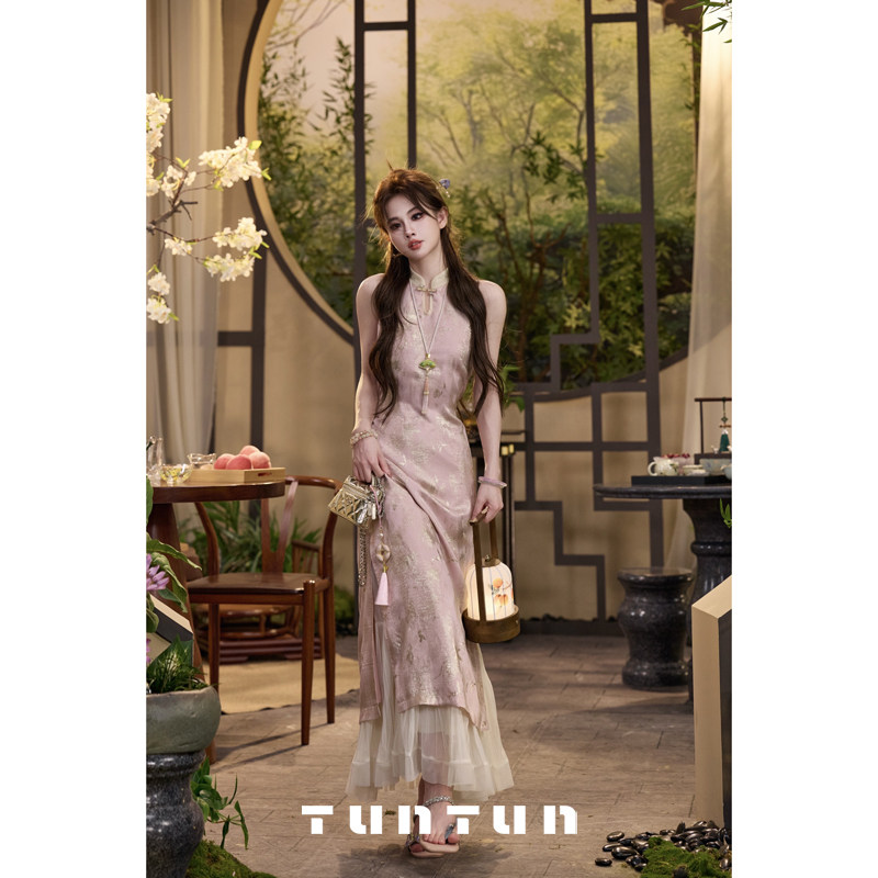 삼키기 tunt 봄 여름 20 치파오 새로운 중식 개선 다림질 금박 자카드 작은 스탠드 칼라 민소매 드레스