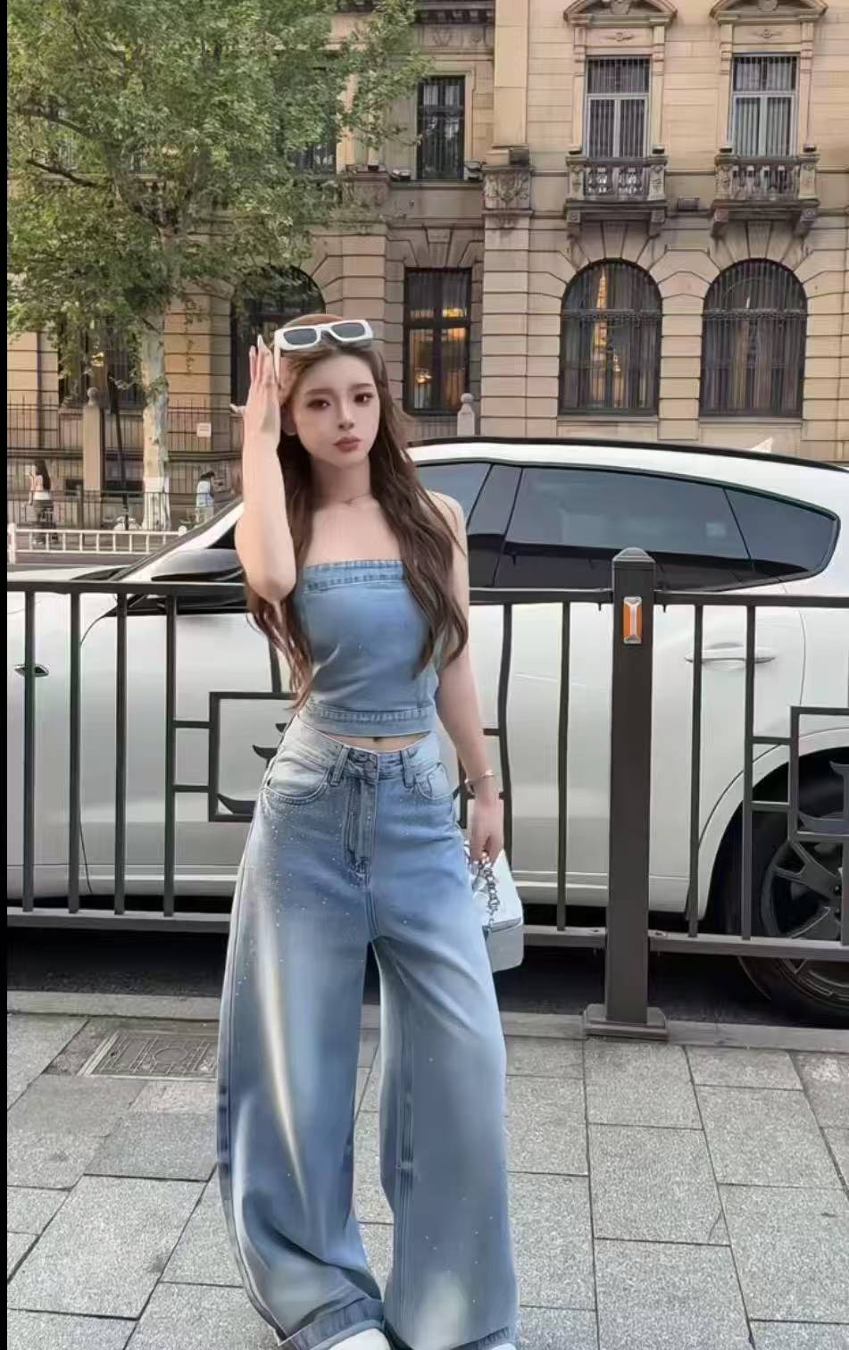 한국 스타일 한국 스타일 핫걸 디자인 센스 튜브탑 조끼 하이웨이스트 슬림해 보이는 폭발 플래시 넓은 다리 청바지