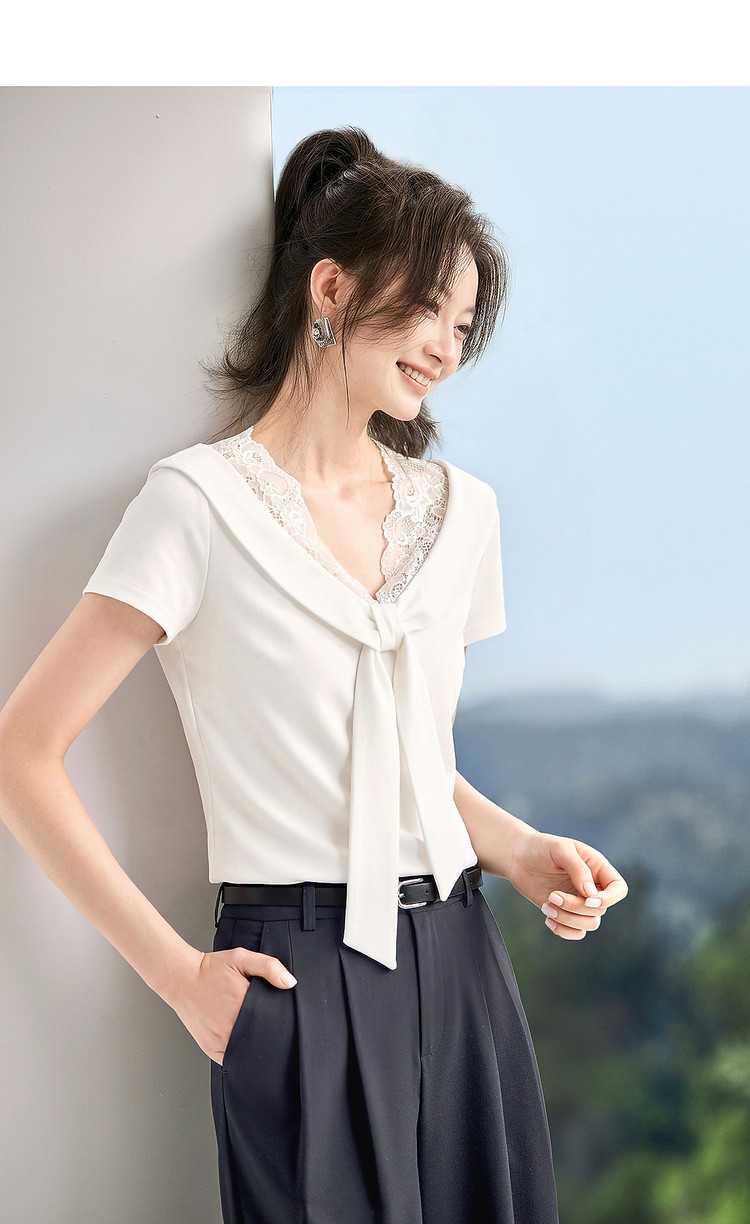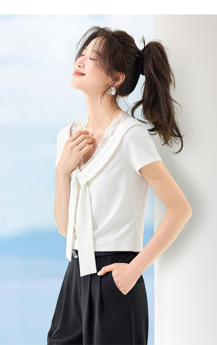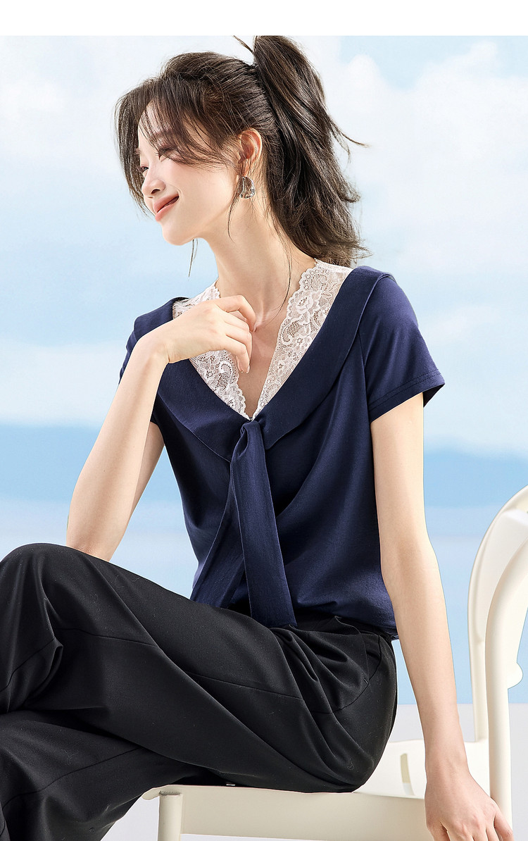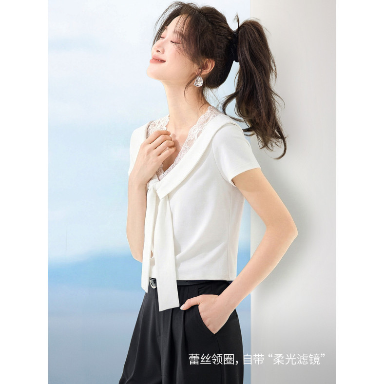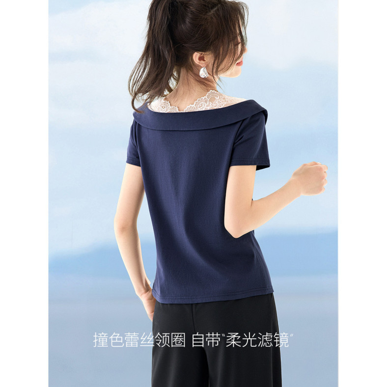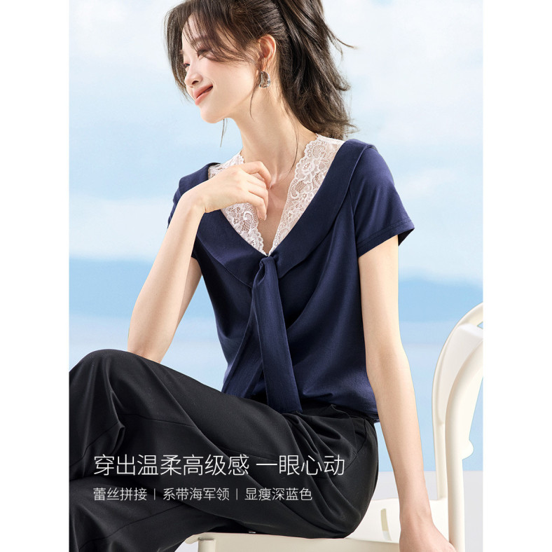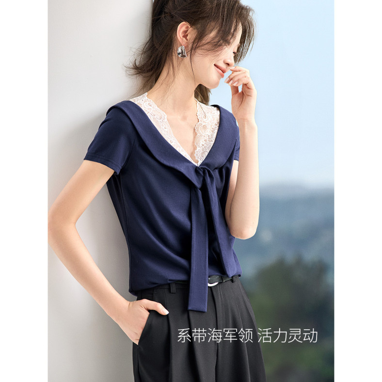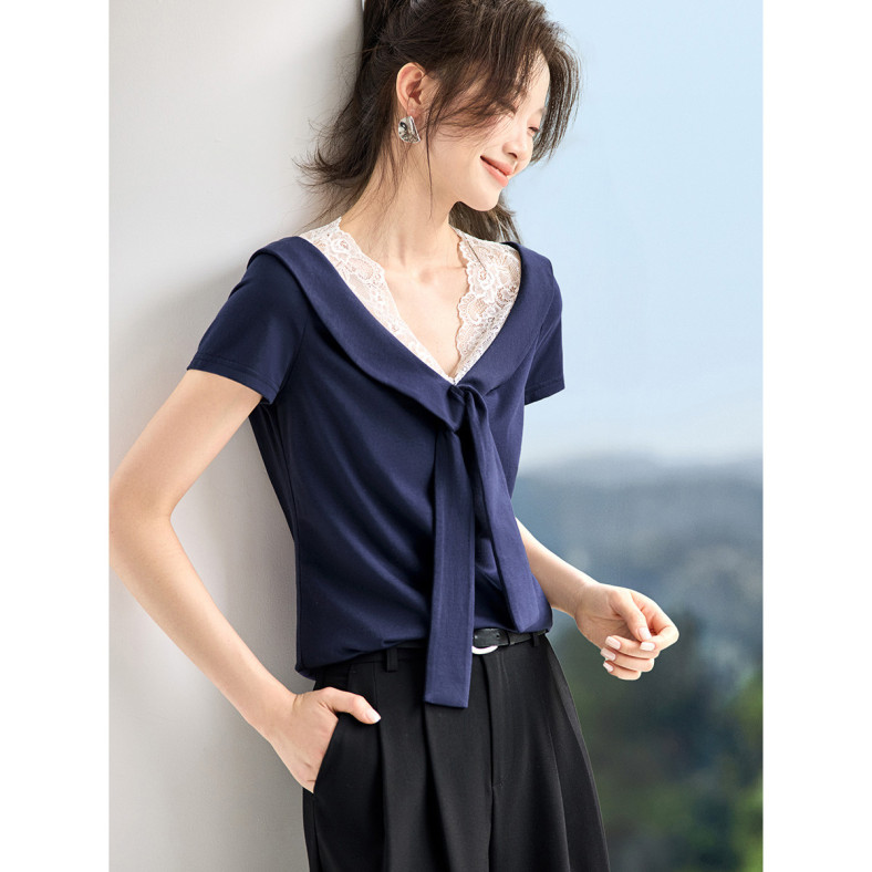 부드러운 부서 해상 바람 2026 여름 새로운 패치워크 레이스 해군 칼라 레이스업 긍정적 인 어깨 맞춤 티셔츠