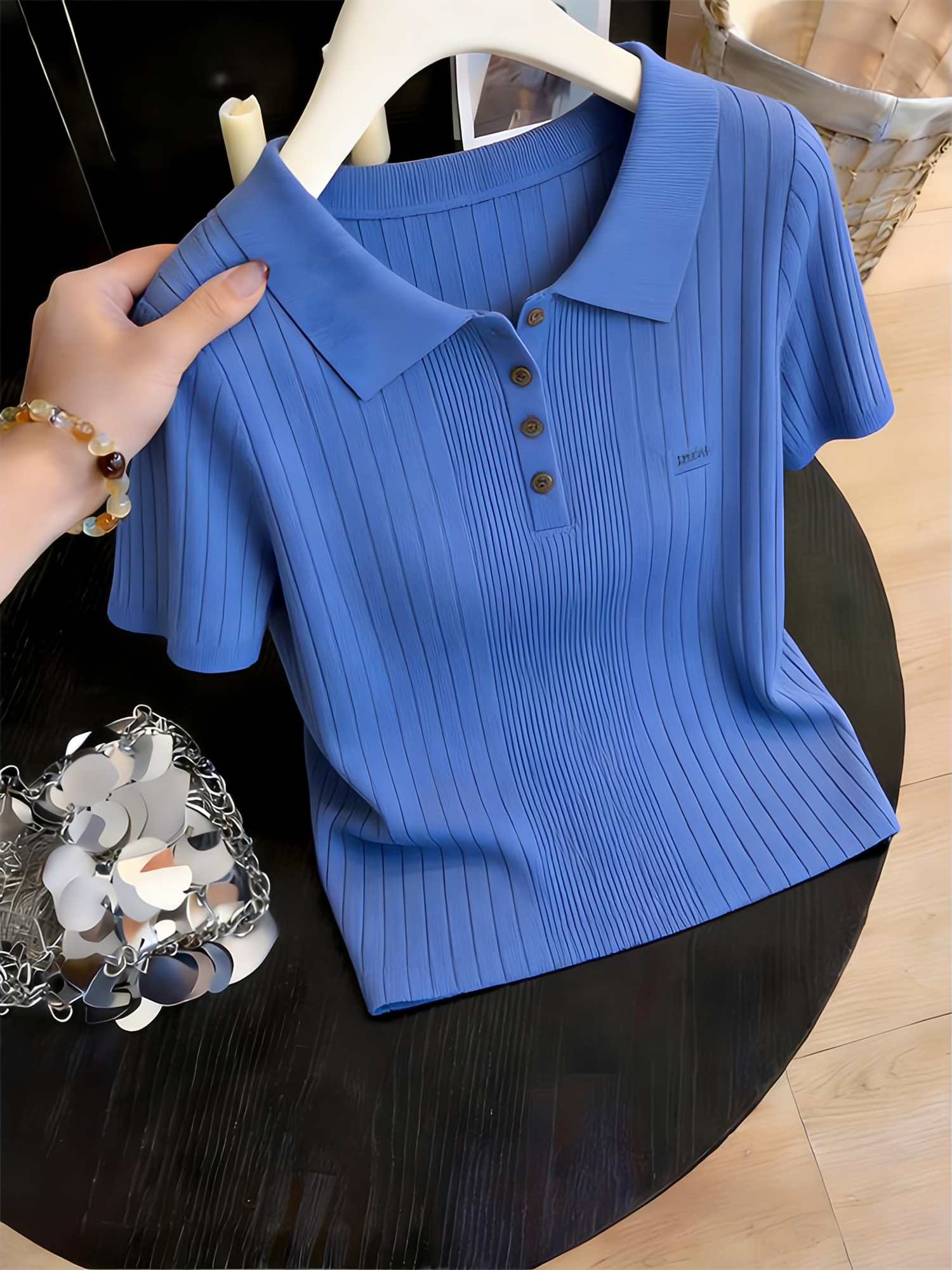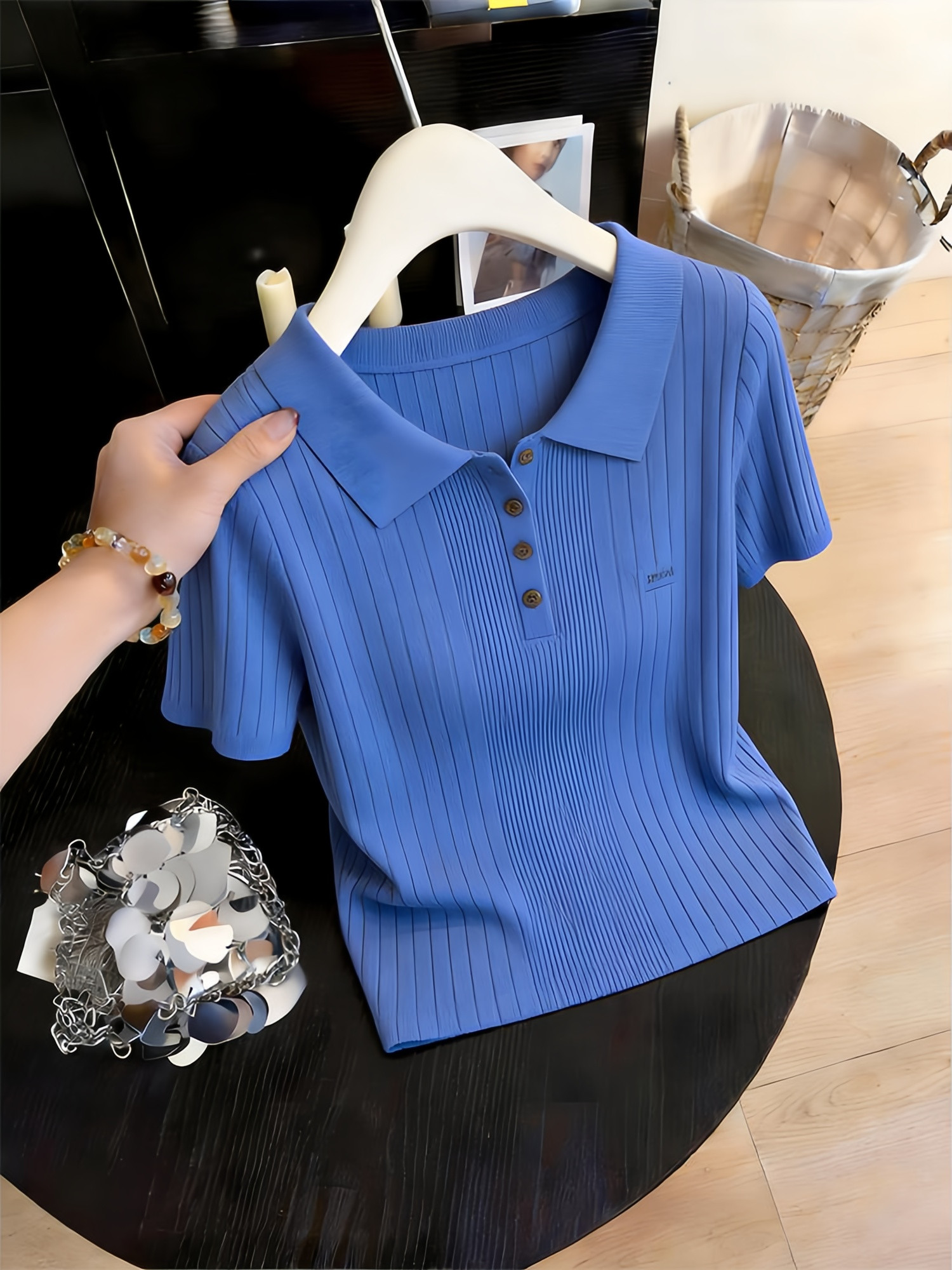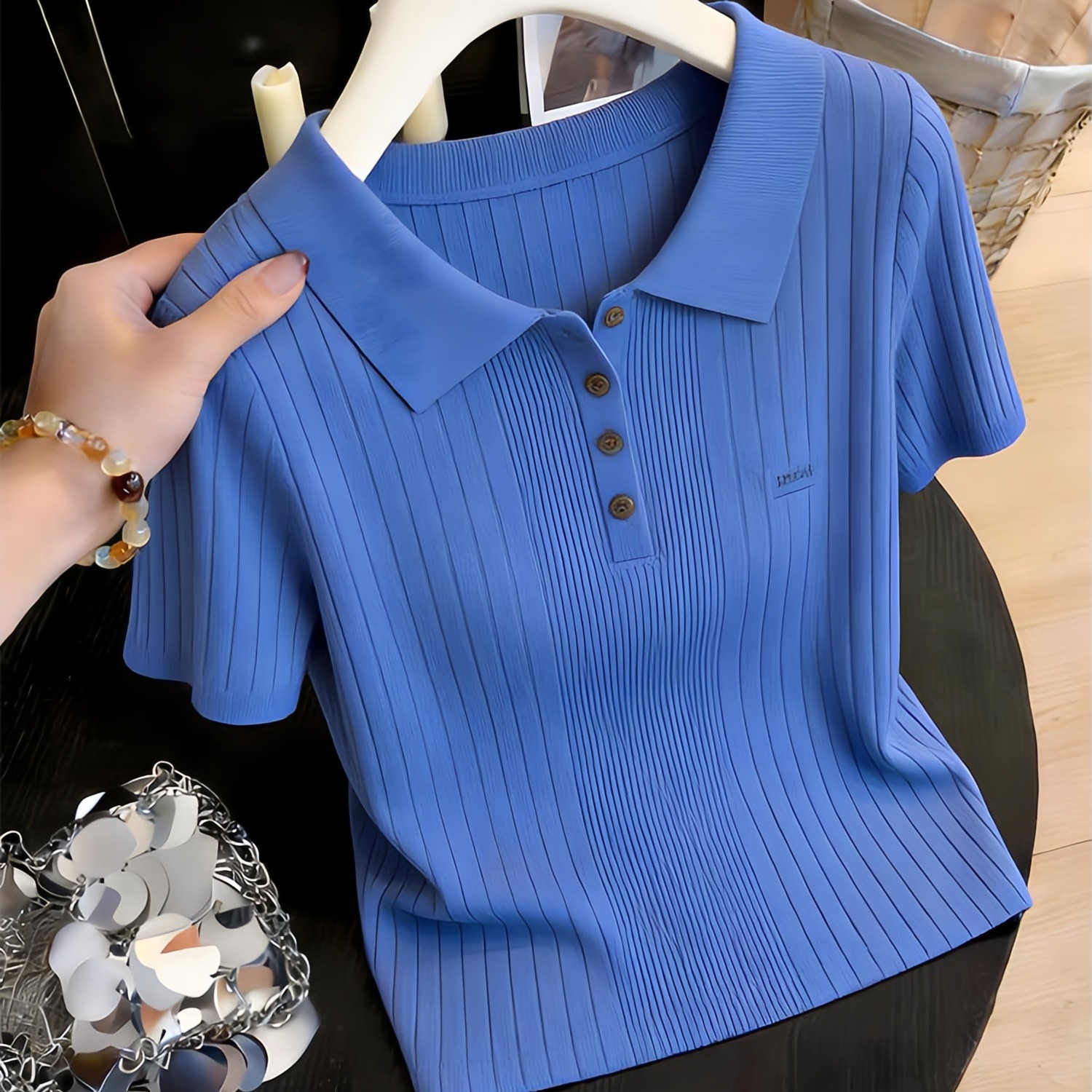 고급 센스 미니멀리즘 품격 파란색 슬림해 보이는 V넥 니트 스웨터 티셔츠 여성 여름 작은 날다 소매 POLO 셔츠 얼음 실크 맨위