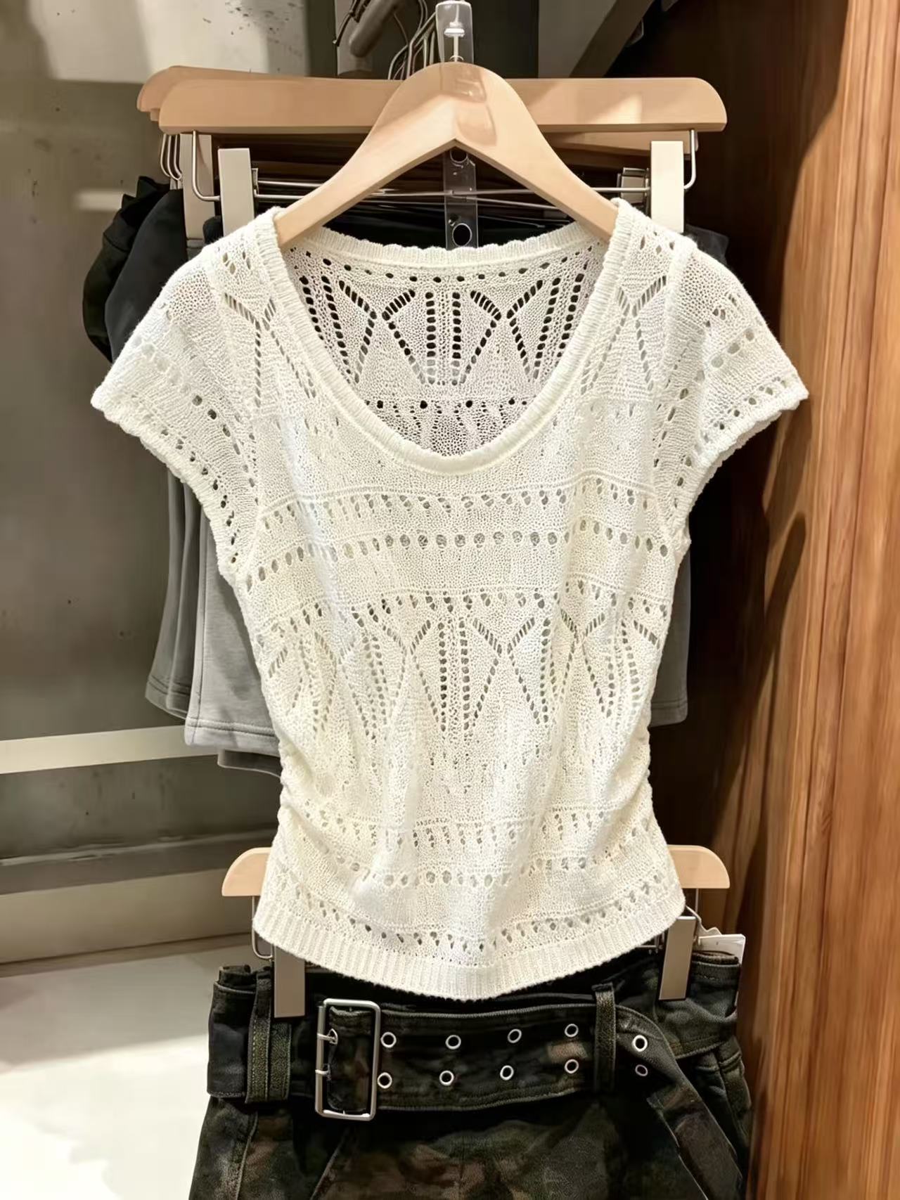 실사 작은 대중 홀로우 아웃 자수 니트 반팔 다용도 맨위 여성 여름 새로운 chic