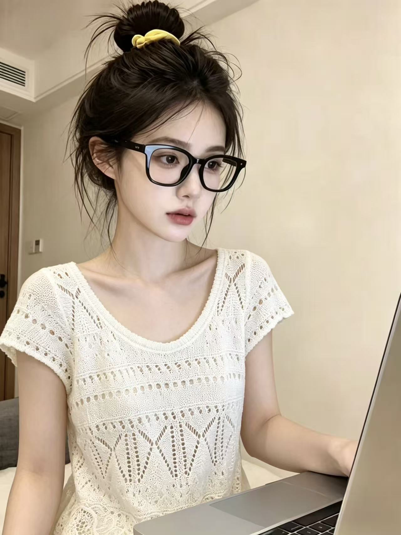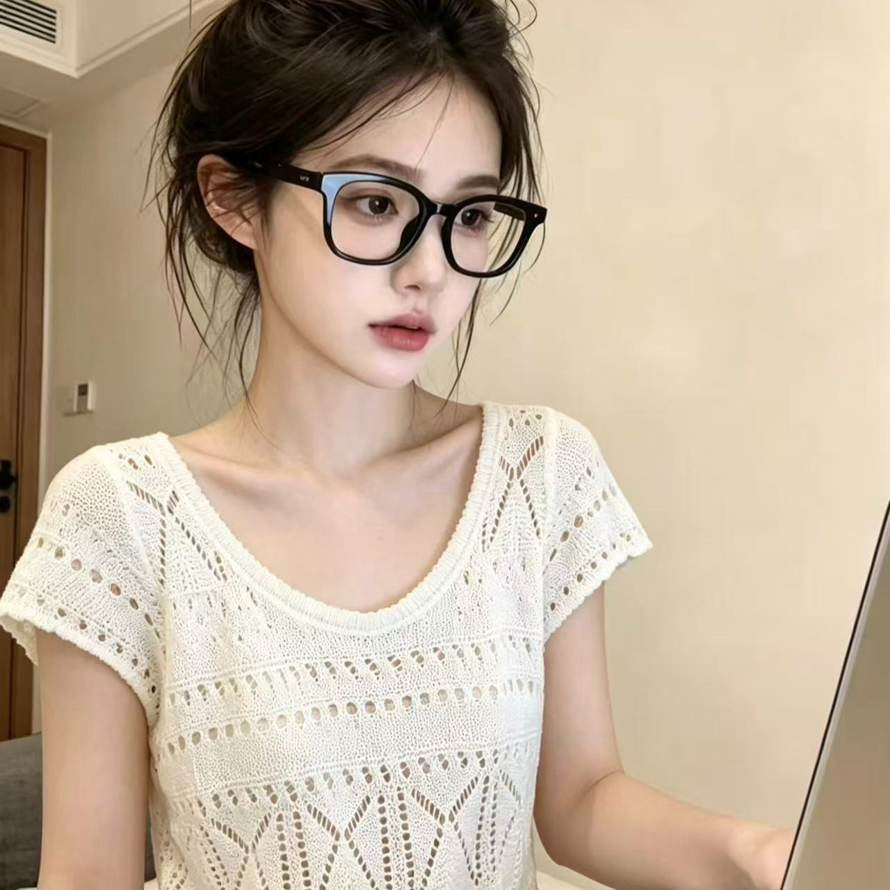 실사 배색 라운드 넥 반팔 티셔츠 나비 매듭 자수 몸매 가꾸기 슬림해 보이는 얼음 실크 니트 스웨터 홀로우 아웃 맨위 chic
