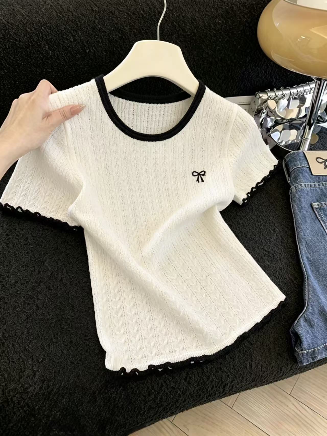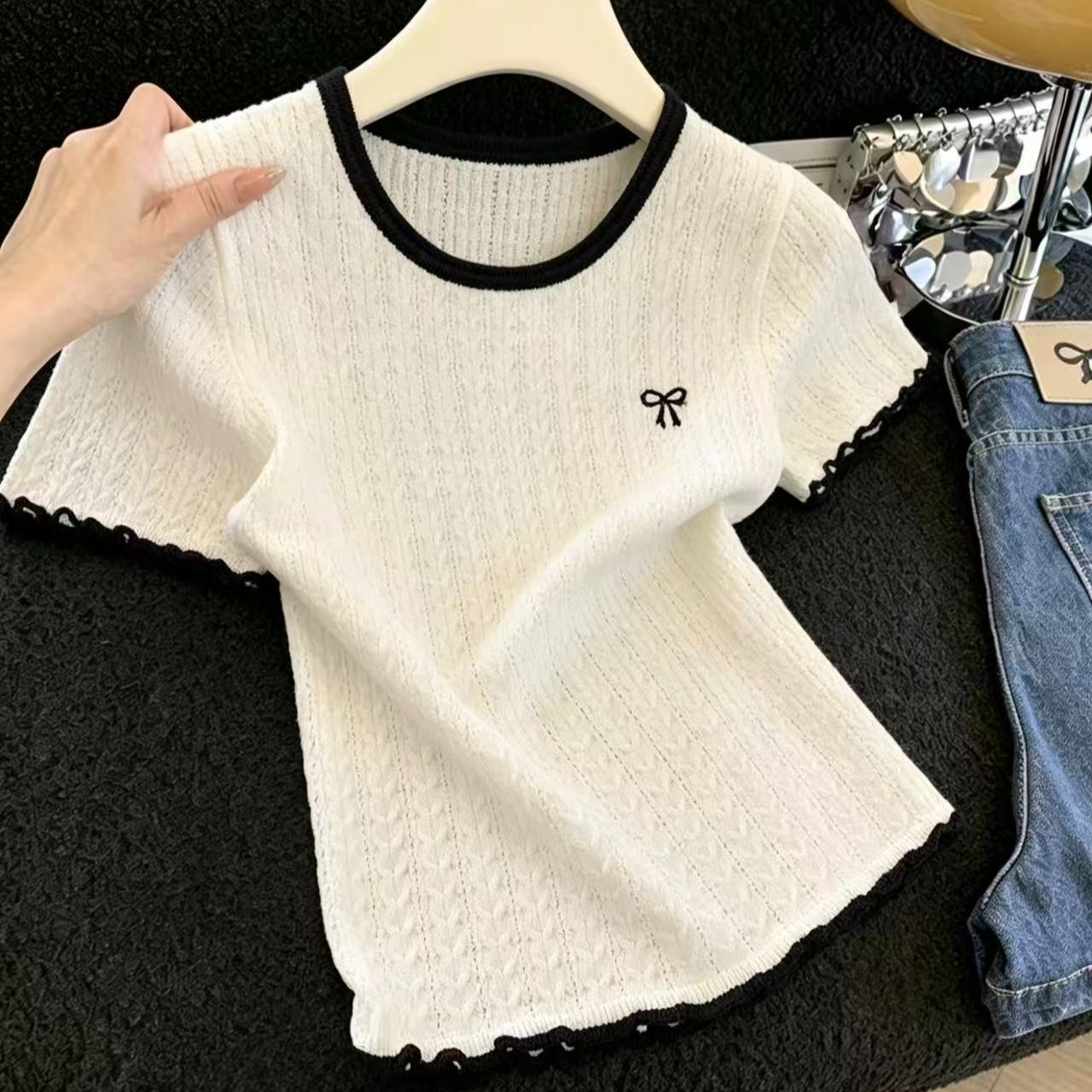 실사 배색 라운드 넥 반팔 티셔츠 나비 매듭 자수 몸매 가꾸기 슬림해 보이는 얼음 실크 니트 스웨터 홀로우 아웃 맨위 chic