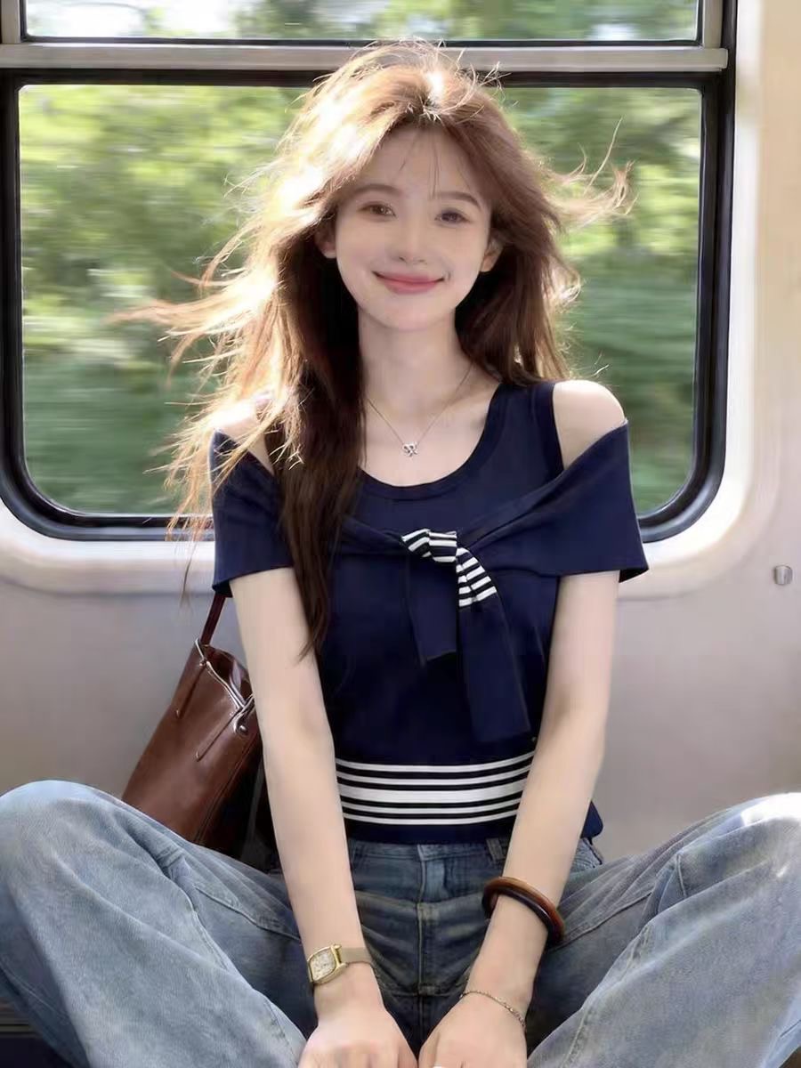프랑스식 빛 요리 한 바람 보트넥 반팔 티셔츠 여성 여름 패션 스트라이프 몸매 가꾸기 슬림해 보이는 출퇴근 풀오버 맨위 트렌디