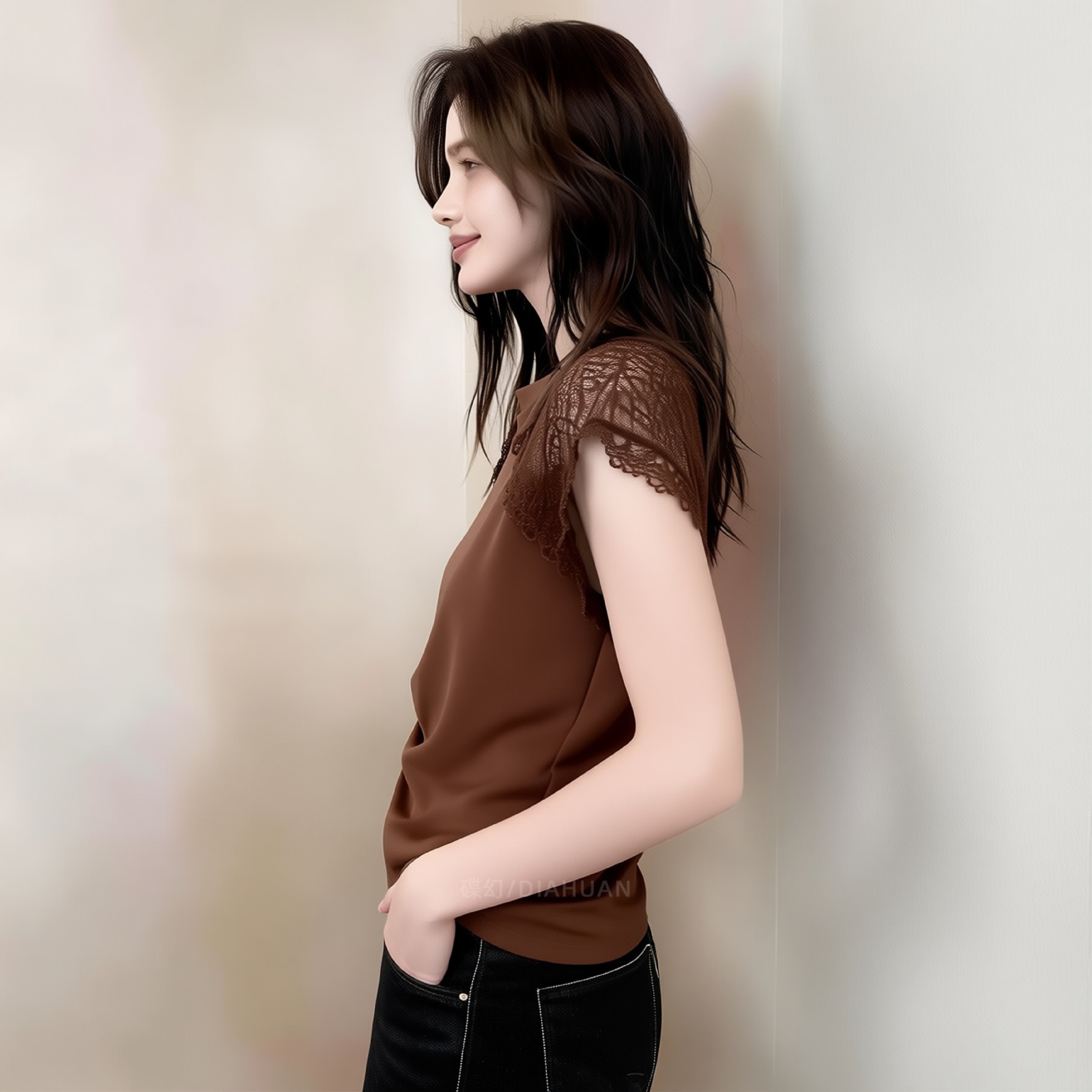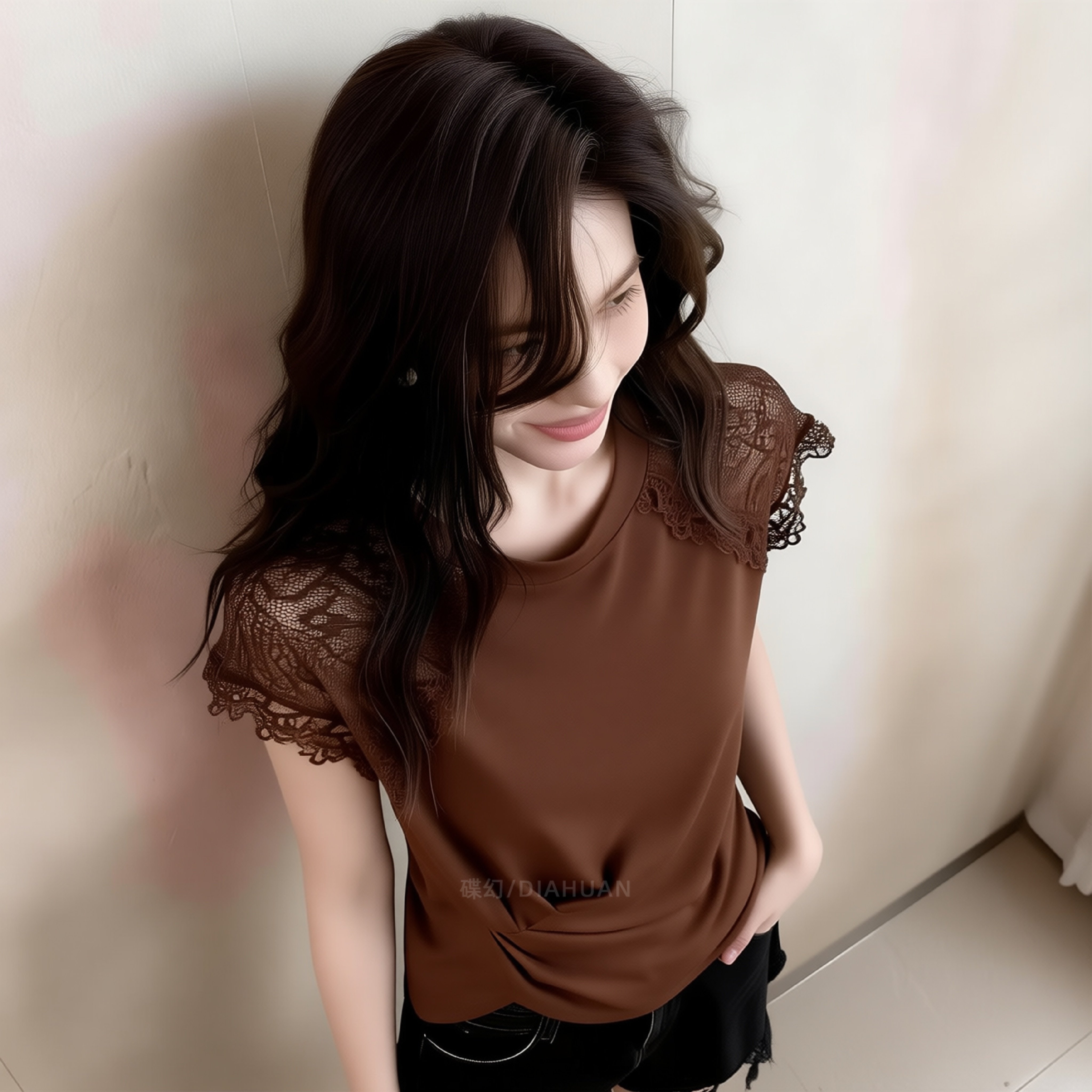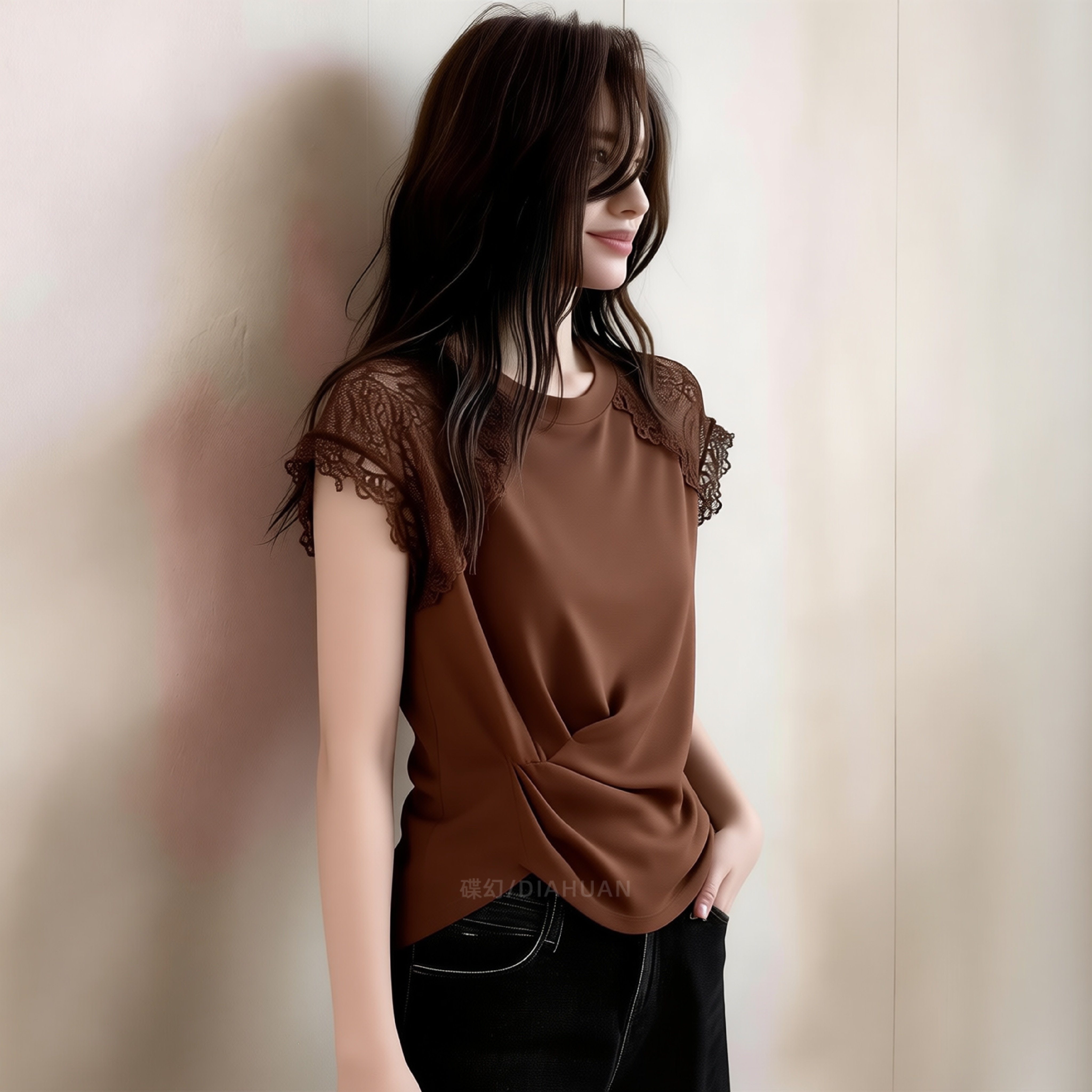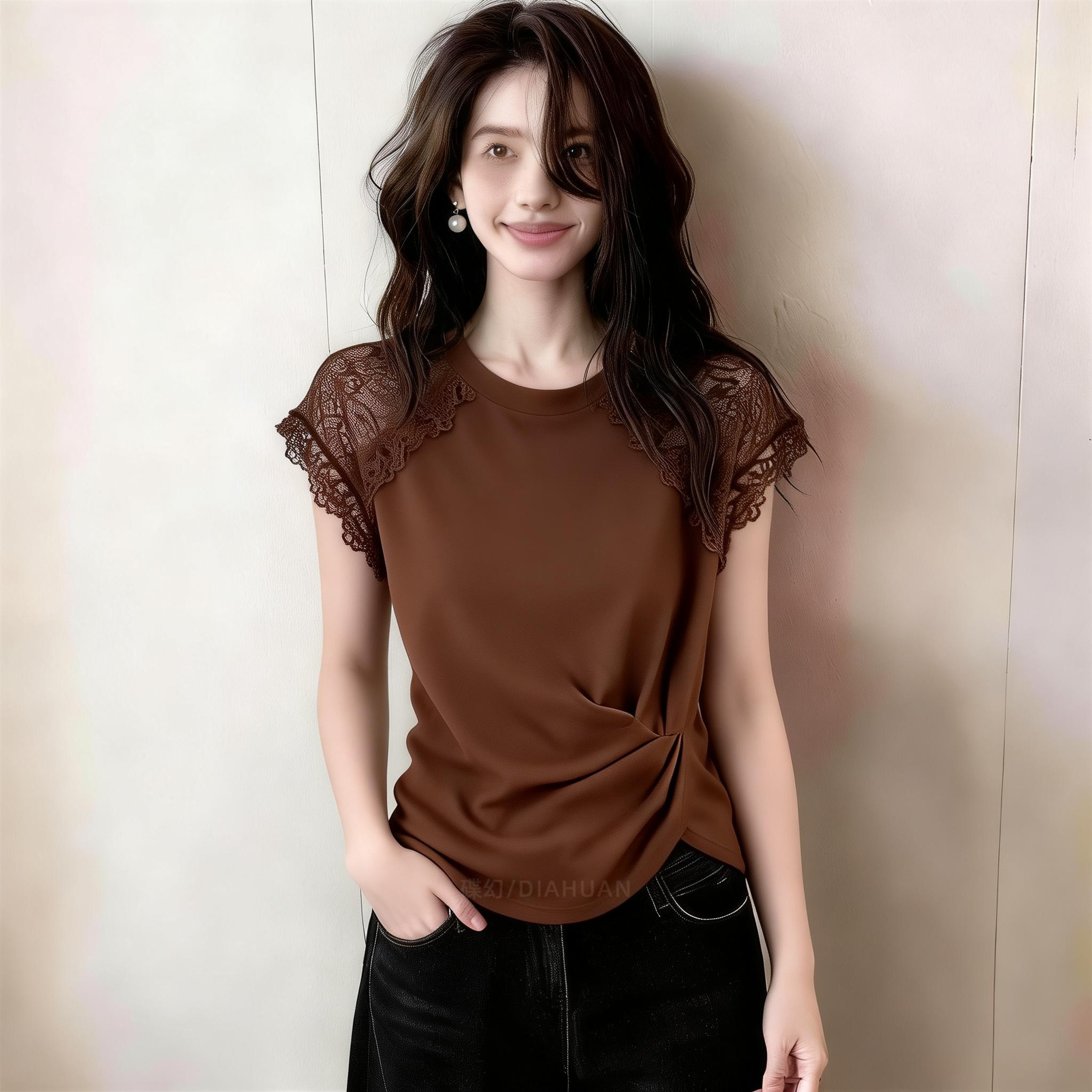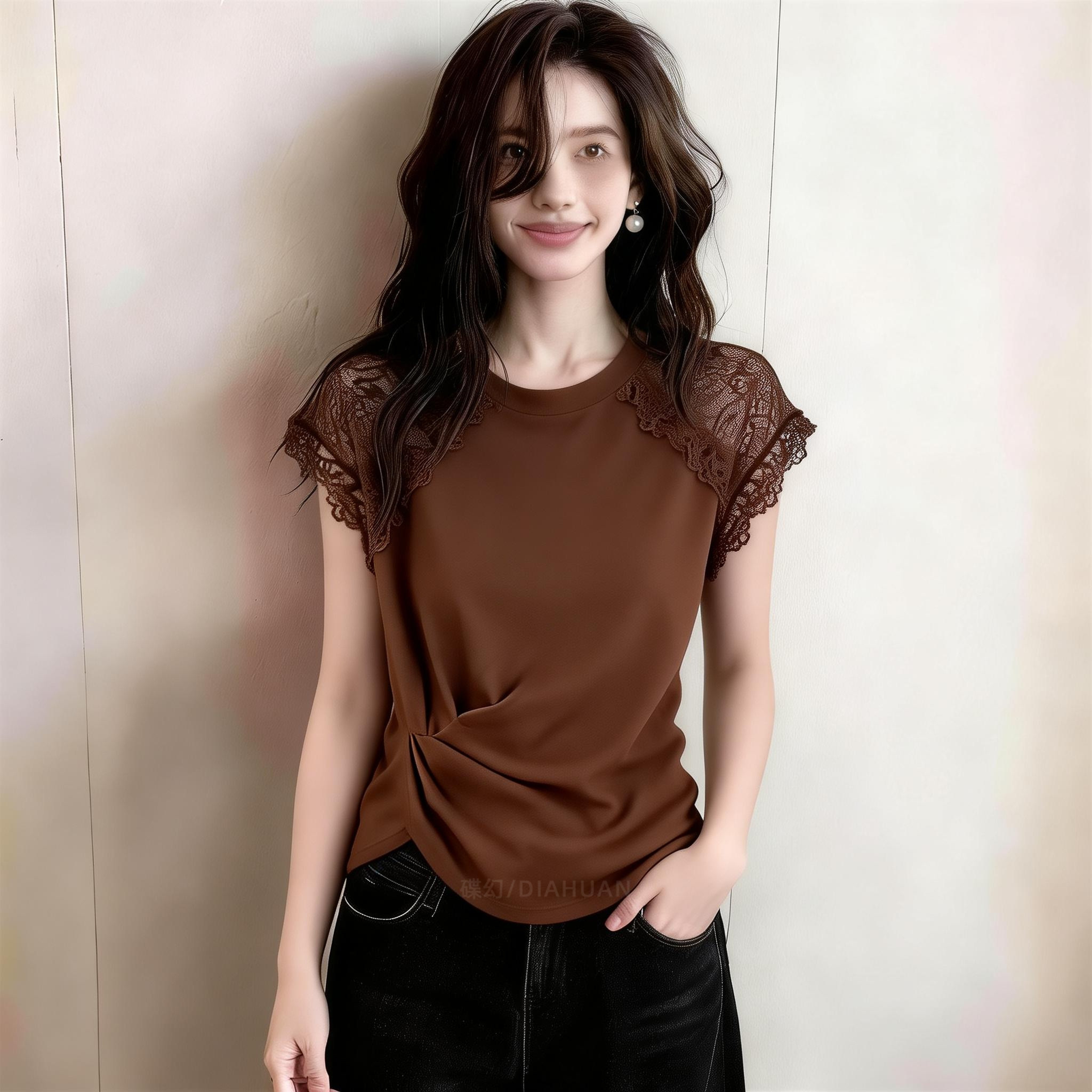 2026 여름 새로운 프랑스식 레이스 레이스 패치워크 반팔 맨위 여성 비틀림 디자인 센스 작은 대중 커피 색상 티셔츠