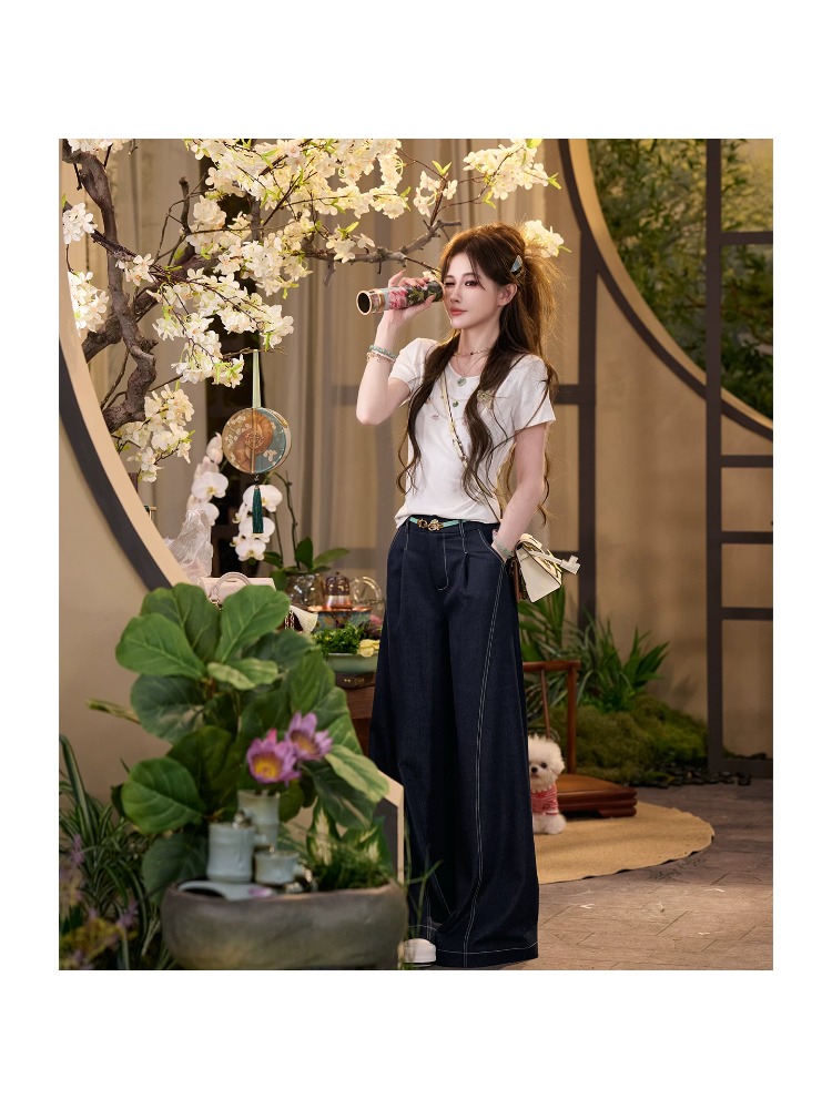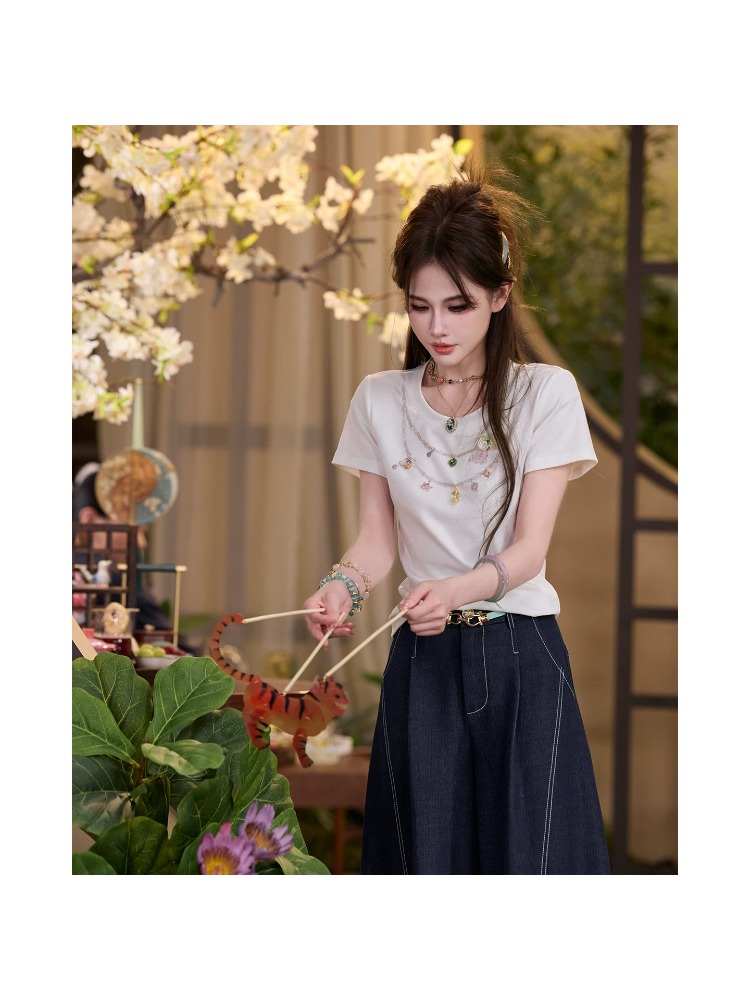 260 그램 사람들 면 V넥 긍정적 인 어깨 쇼트 스타일 허리 수축 반팔 티셔츠 여성 여름 자수 몸매 가꾸기 슬림해 보이는 핫걸 작은 맨위