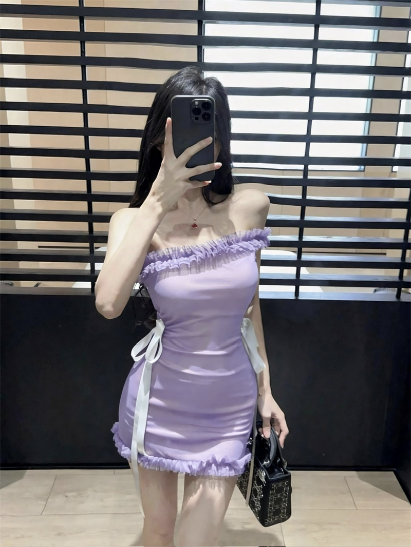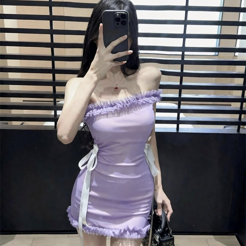 실사 낮은 가슴 오프숄더 슬립 타이트 스커트 쇼트 스타일 망사 패치워크 배색 드레스 복장