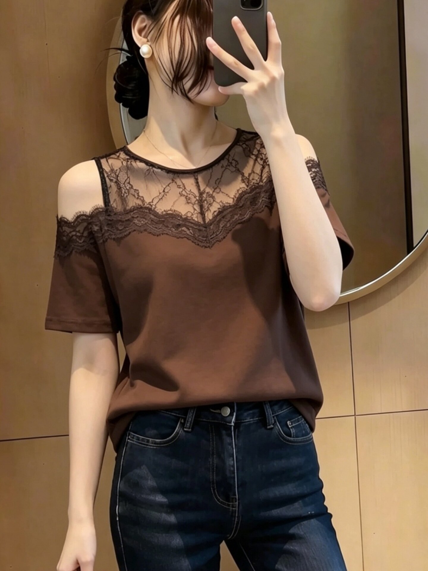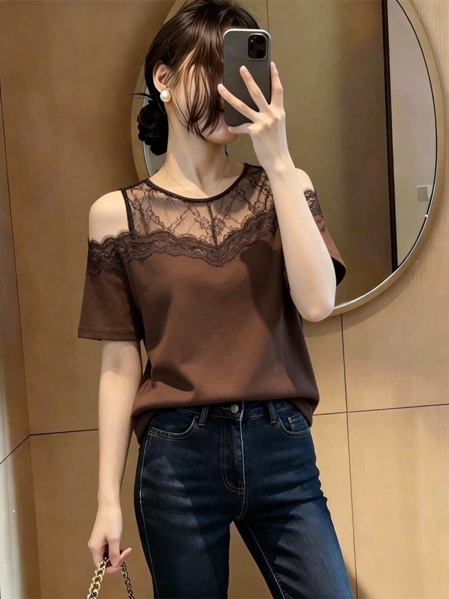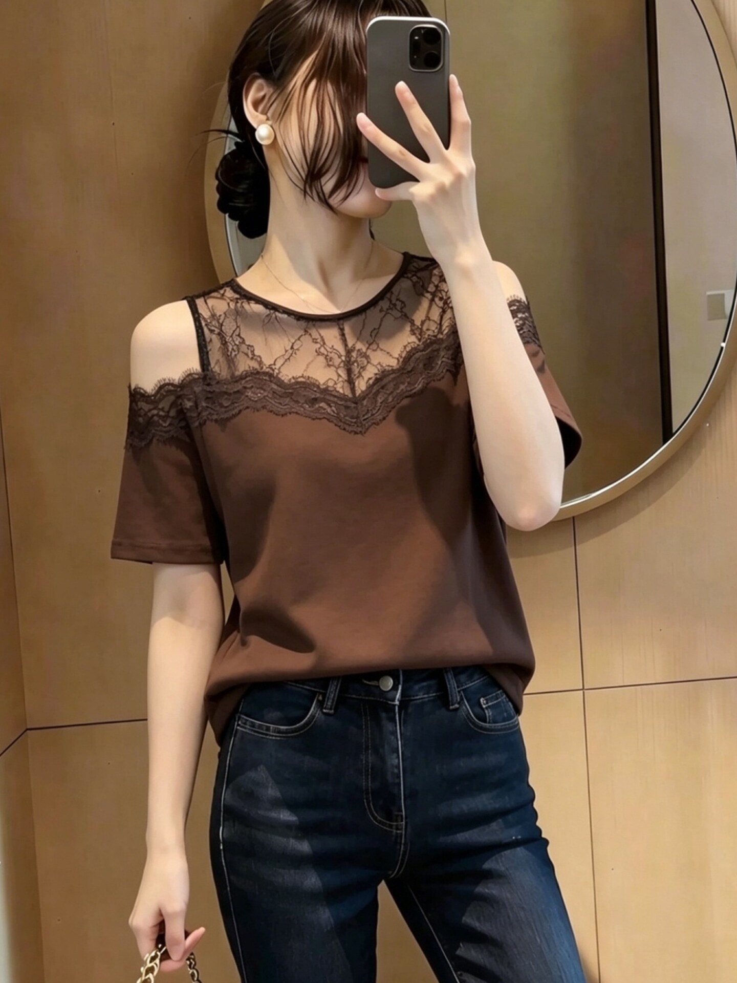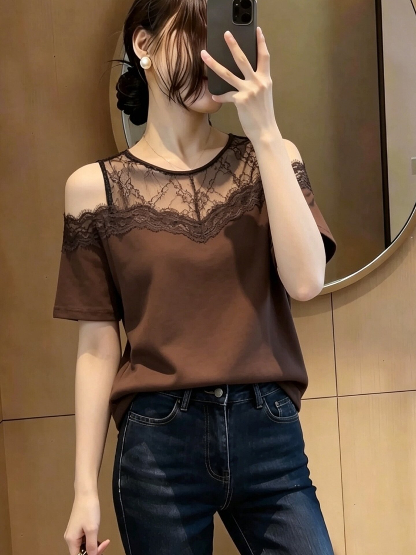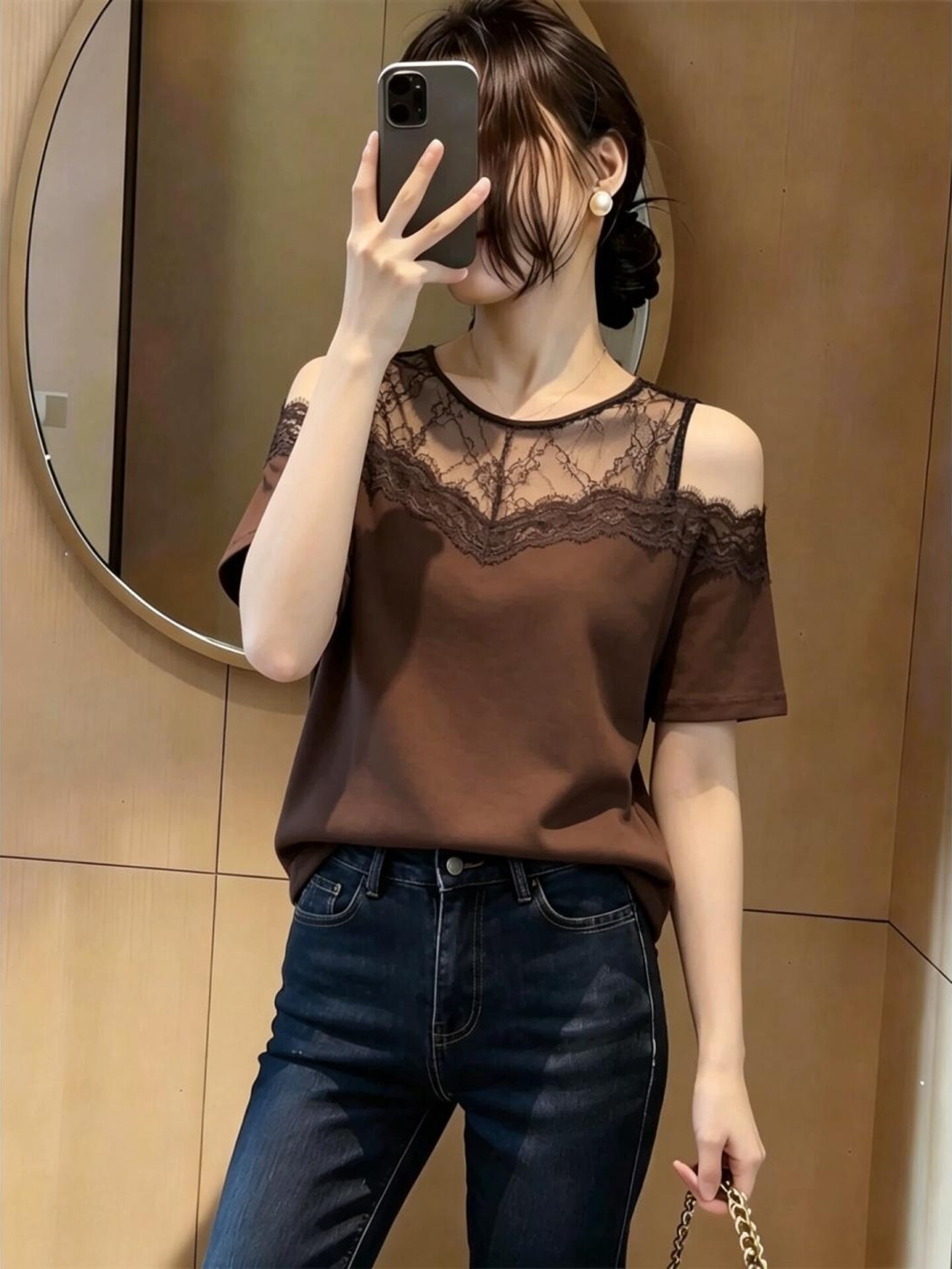 2026 여름 새로운 프랑스식 레이스 레이스 패치워크 반팔 맨위 여성 비틀림 디자인 센스 작은 대중 커피 색상 티셔츠