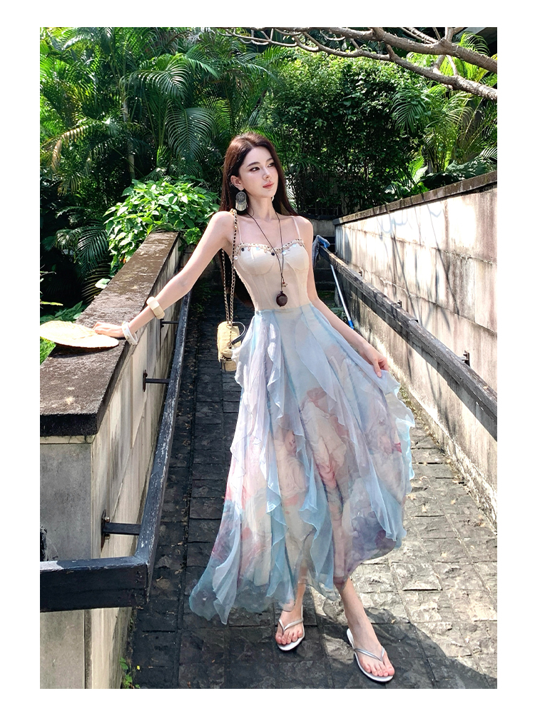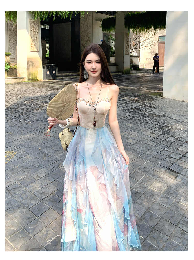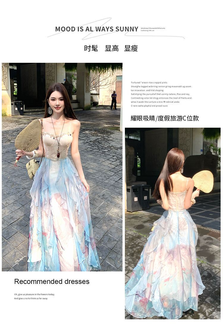 헤일로 염색 꽃무늬 슬립 드레스 여성 2025 여름 새로운 롱 코트 펌프 로프 여성 드레스