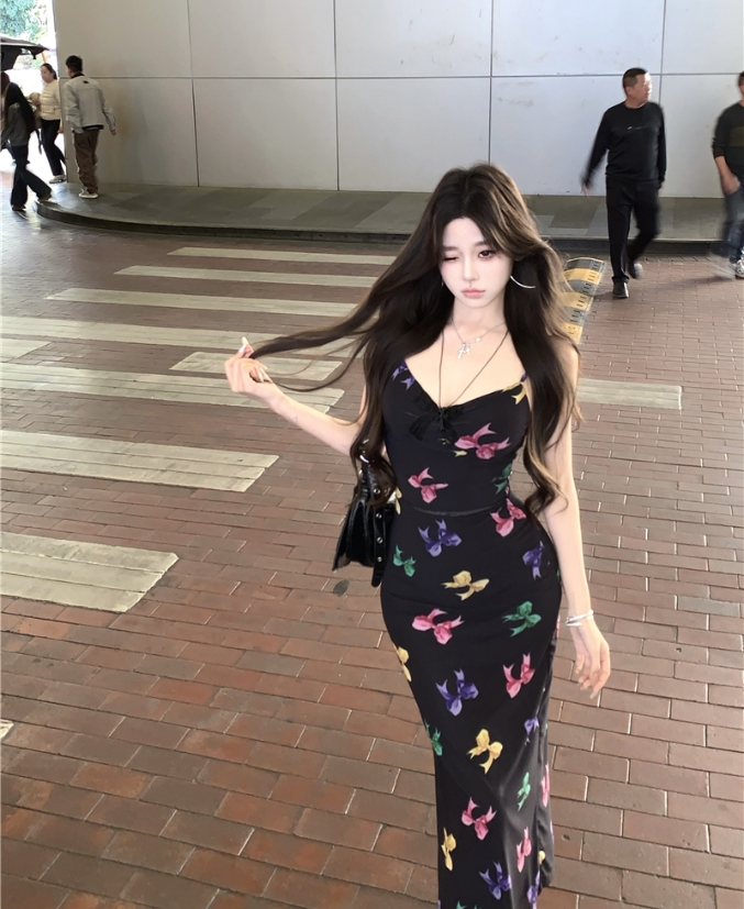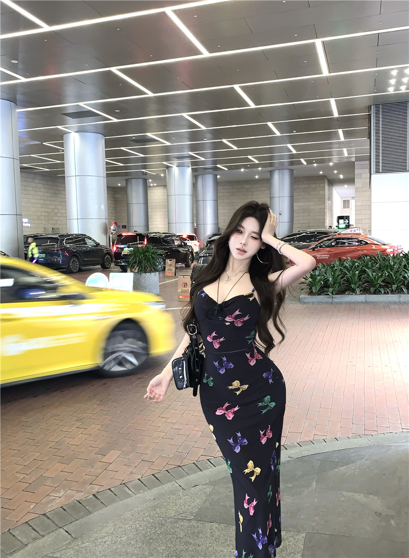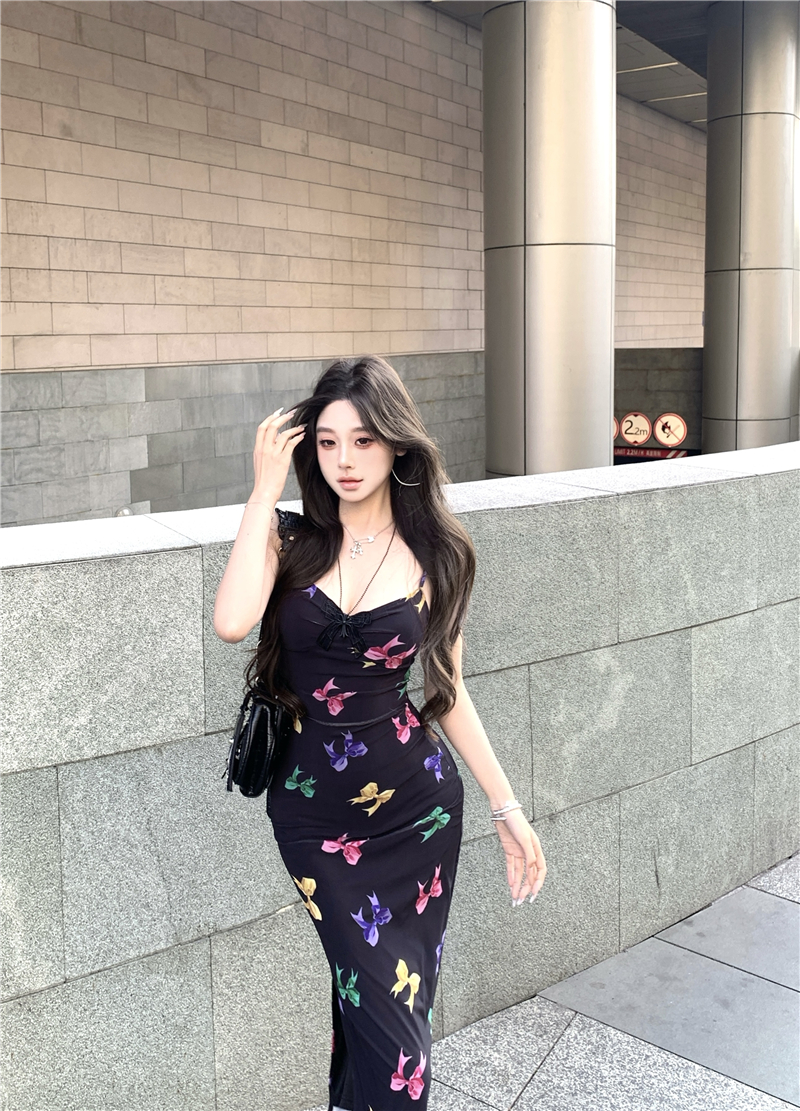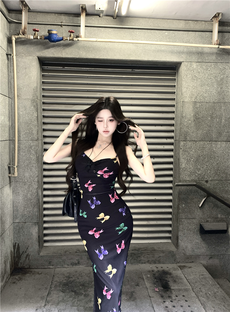 실사 정가 나비 탈출하다 분말 블랙 프린트 드레스 몸매 가꾸기 슬림해 보이는 슬립 드레스