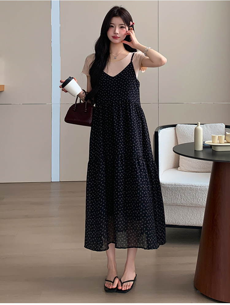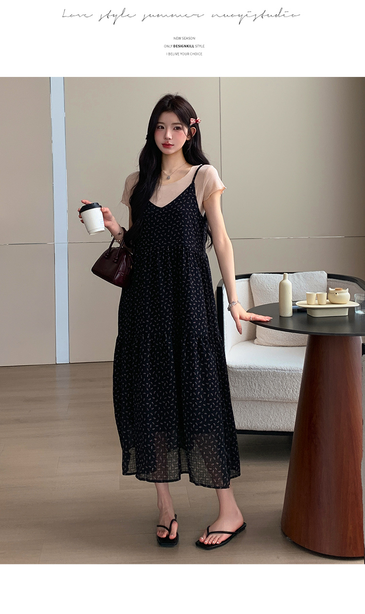 실사 지금 2026 여름 신제품 질감 센스 꽃무늬 드레스 슬립 투피스 드레스 세트