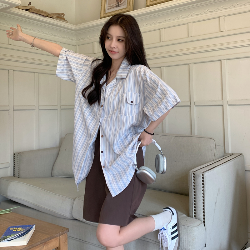 실사 정가 일본식 작은 청신 블루 스트라이프 셔츠 여름 여성 쿠바 칼라 반팔 셔츠 루즈핏 맨위