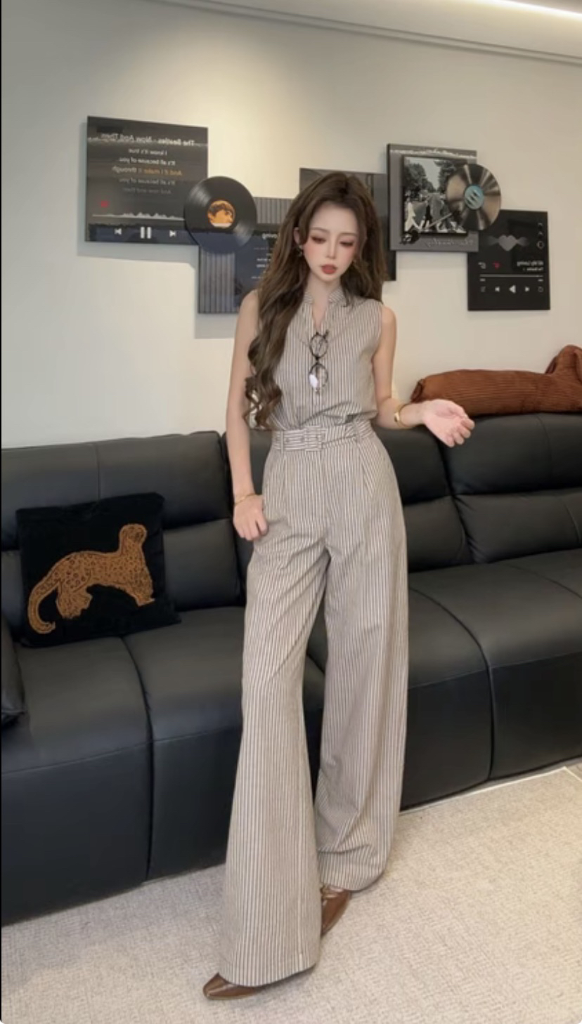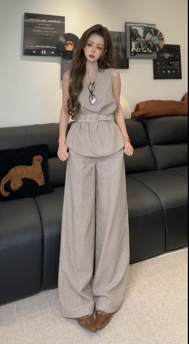 일레븐 맞춤 학문적 오래된 돈 바람 스트라이프 민소매 V넥 허리 수축 하이웨이스트 스트레이트 팬츠 게으른 세트
