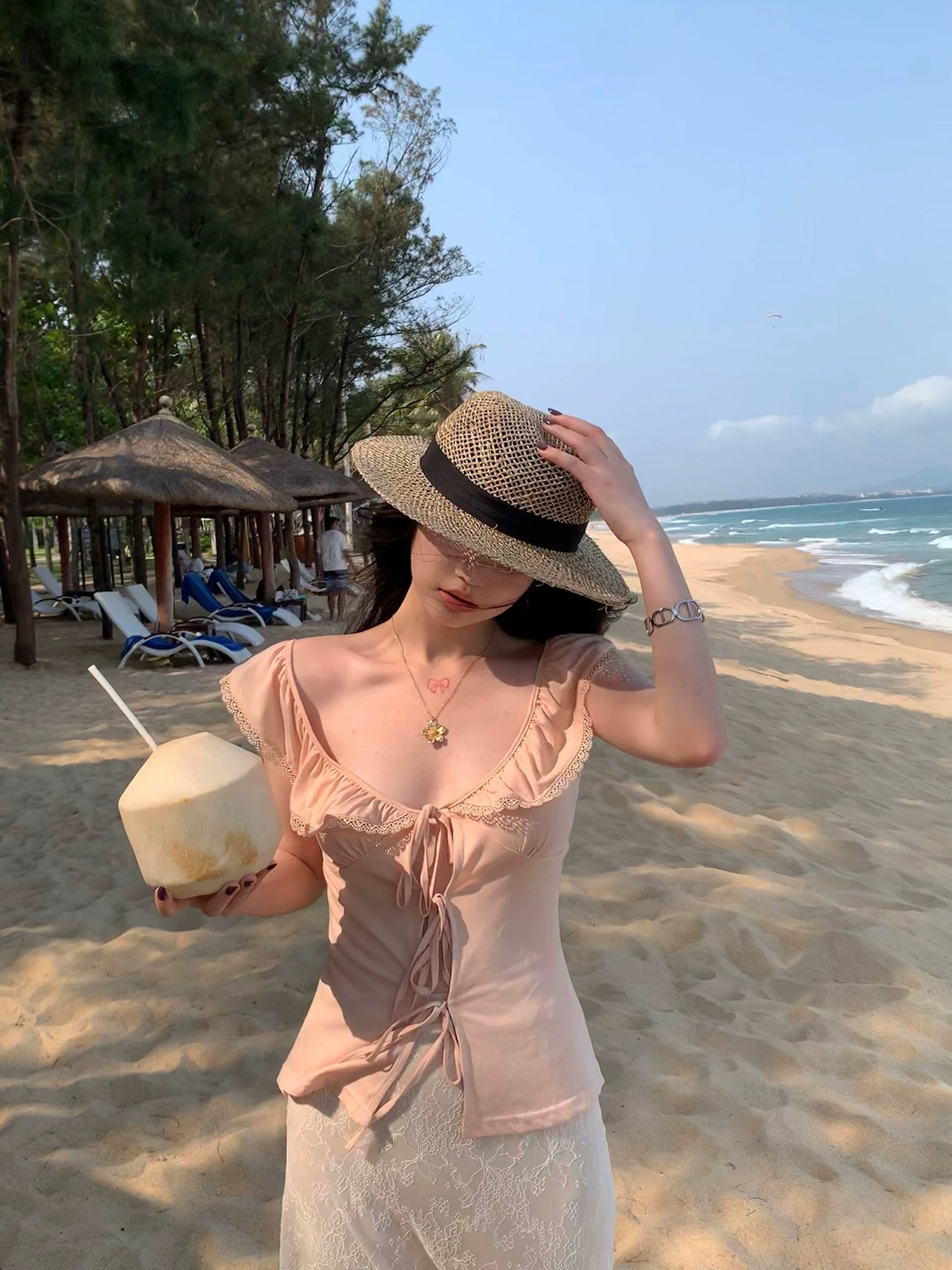 sheepland 둘 착용 행침 목 레이스업 주간 실크 아마 레이스 자카드 슬립 반신 치마 세트 여성 봄 여름