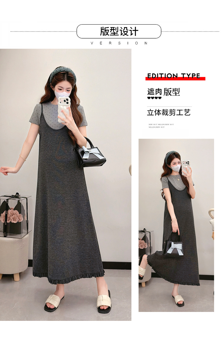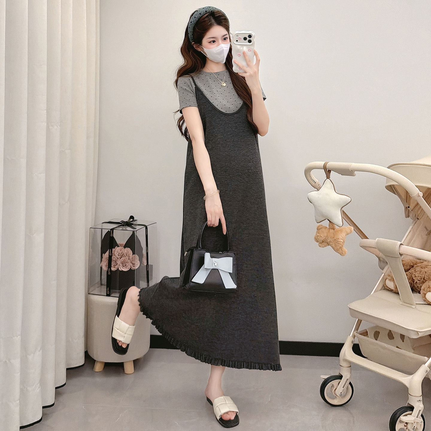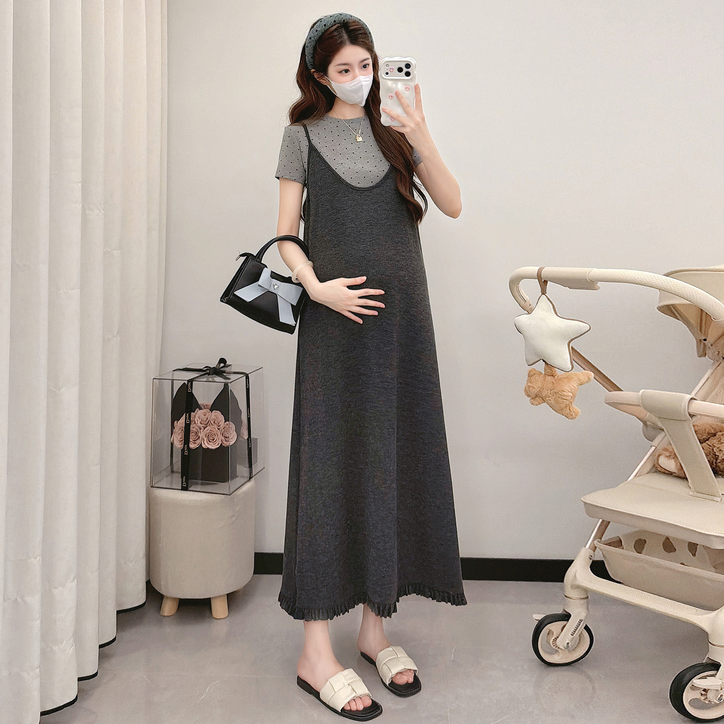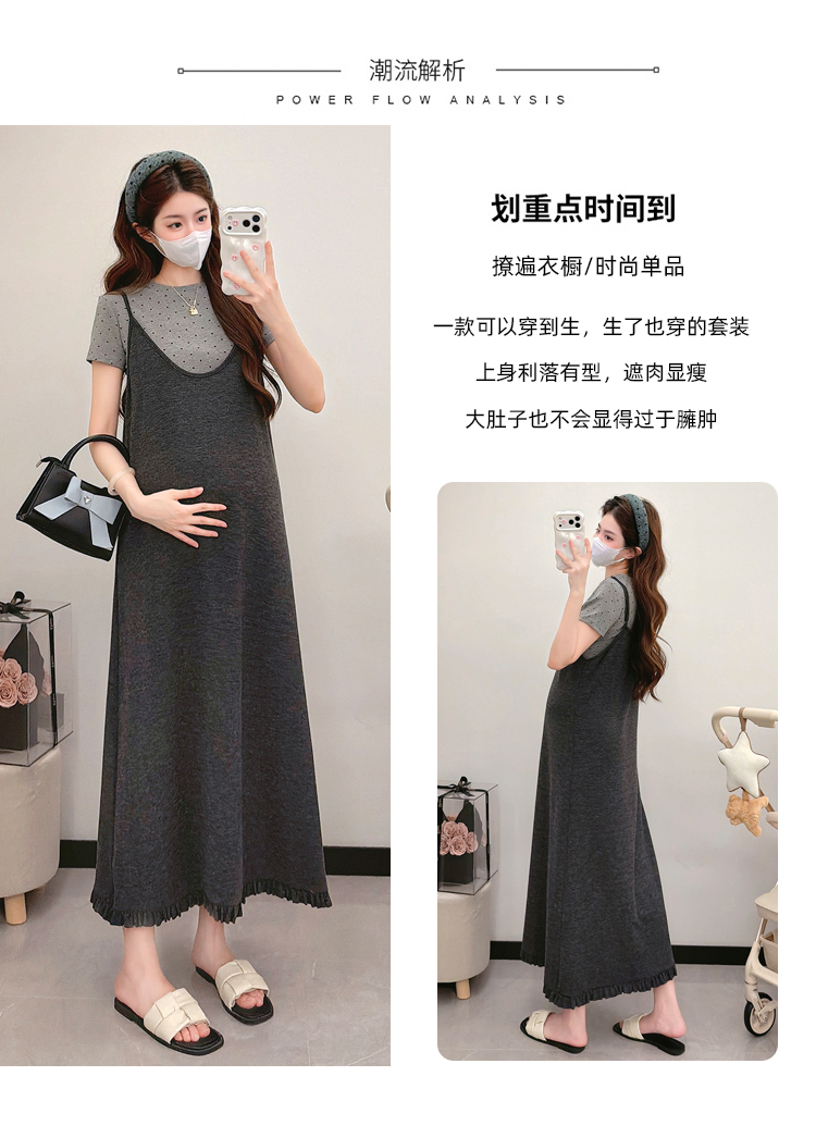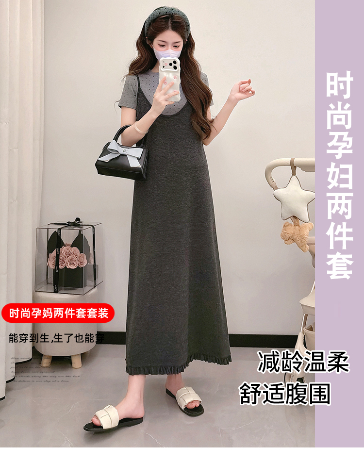 매운맛 엄마 임신 기간 착용 가져 가라. 슬립 드레스 2026 여름 새로운 슬림해 보이는 반팔 맨위 투피스 세트 출산 착용