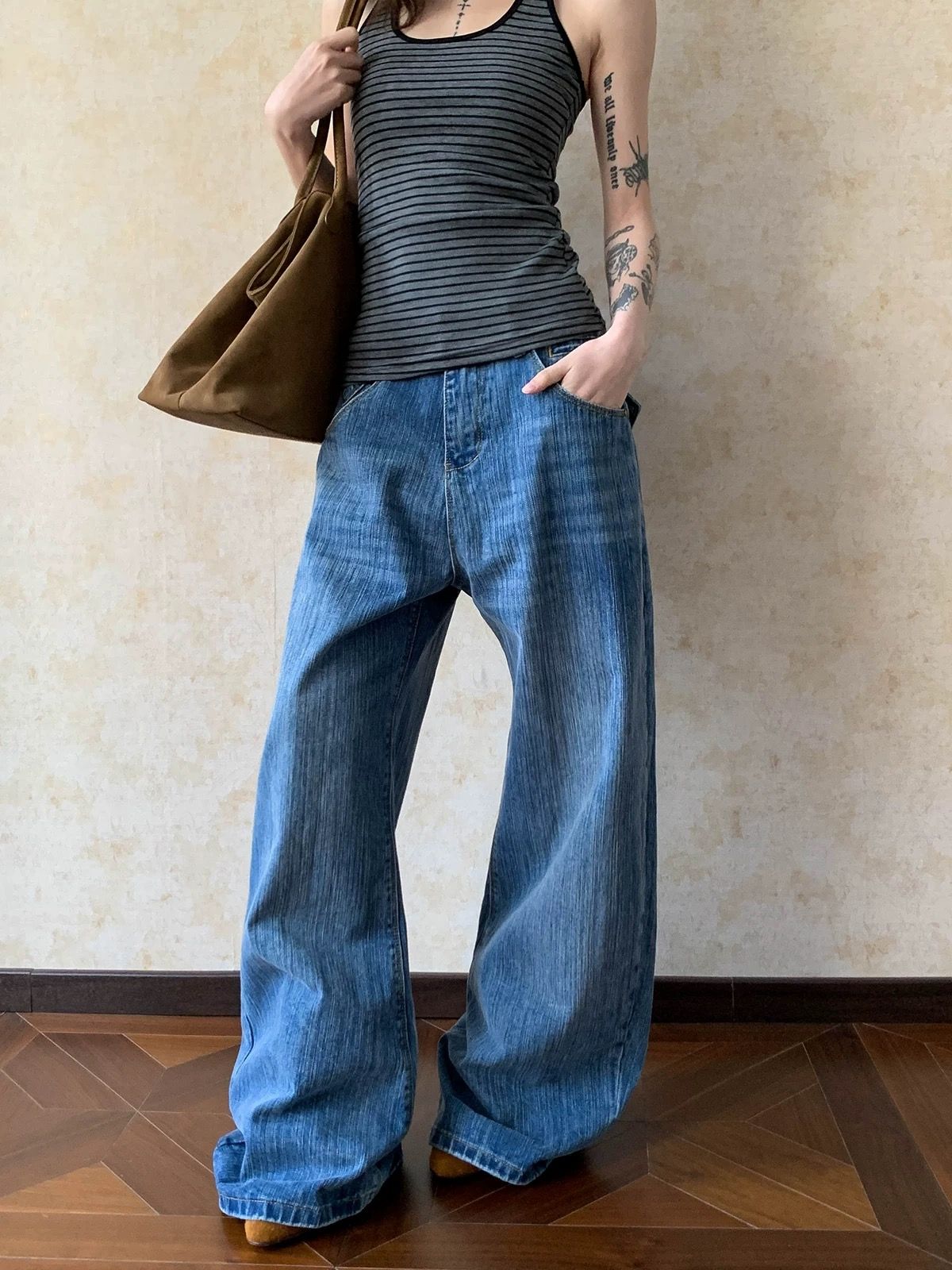 아메리칸 레트로 레오파드 무늬 하이웨이스트 와이드 레깅스 바지 루즈핏 슬림해 보이는 거리 캐주얼 바지 배색 주머니 모통이 칼 청바지