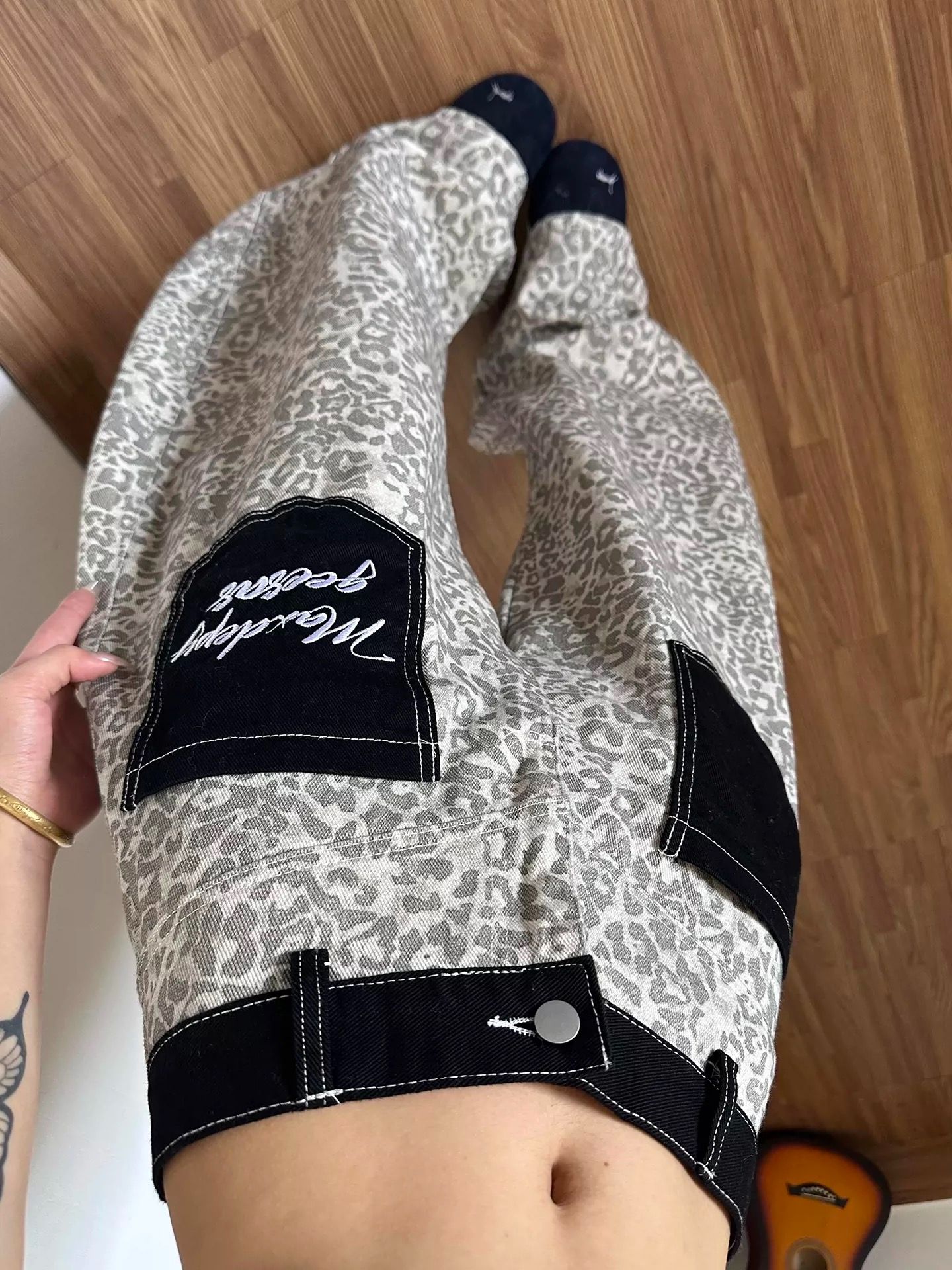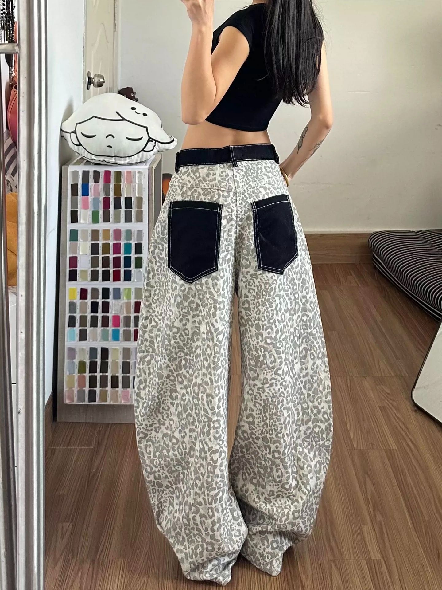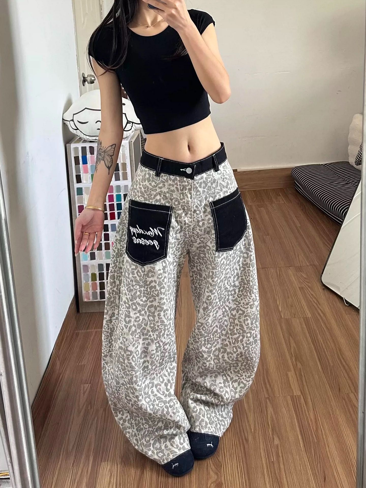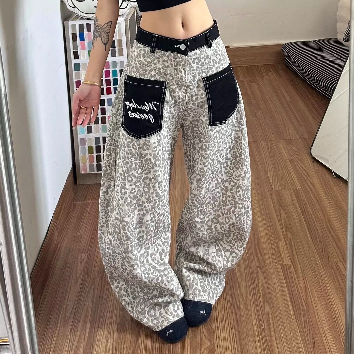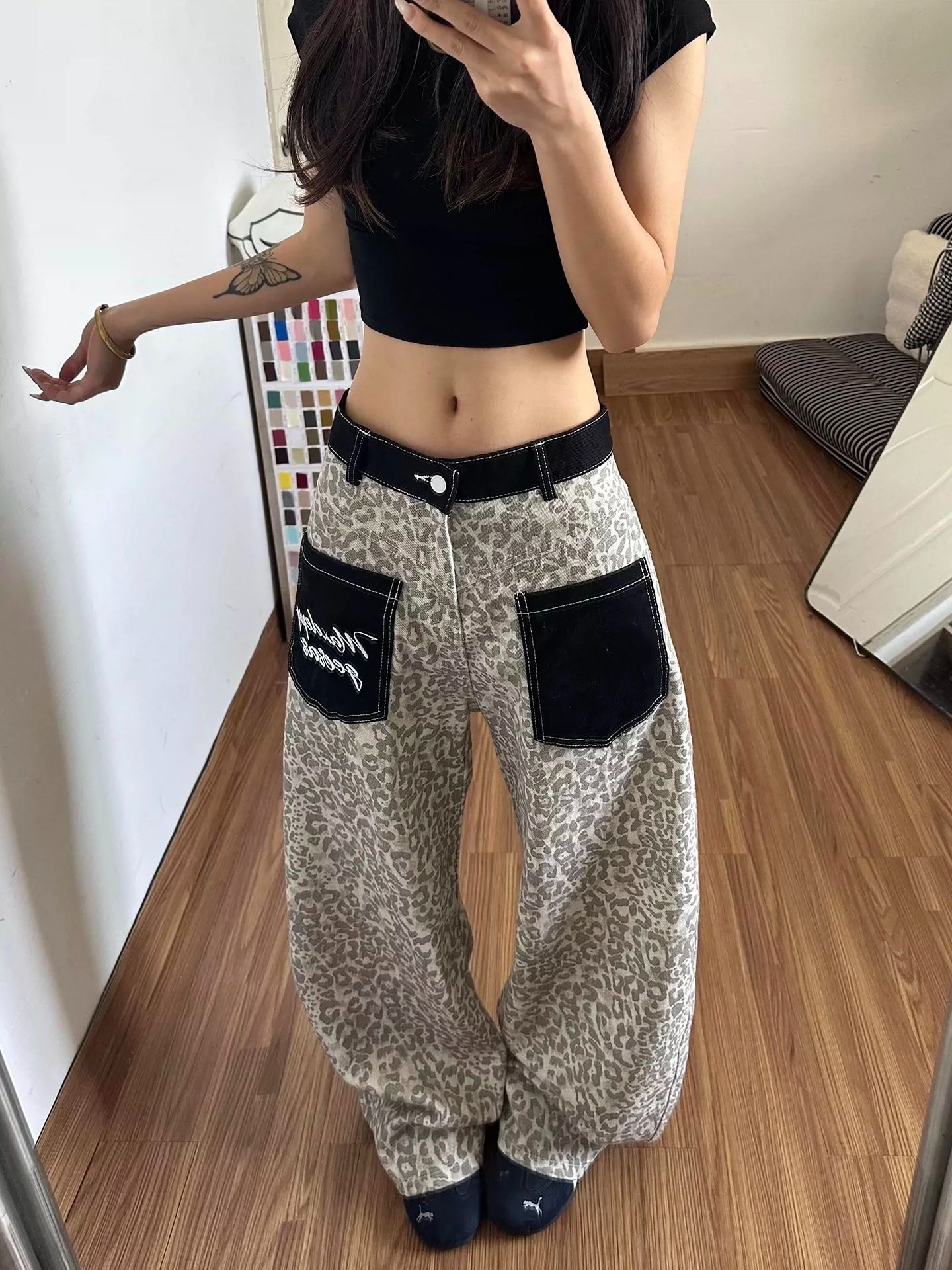 아메리칸 레트로 레오파드 무늬 하이웨이스트 와이드 레깅스 바지 루즈핏 슬림해 보이는 거리 캐주얼 바지 배색 주머니 모통이 칼 청바지