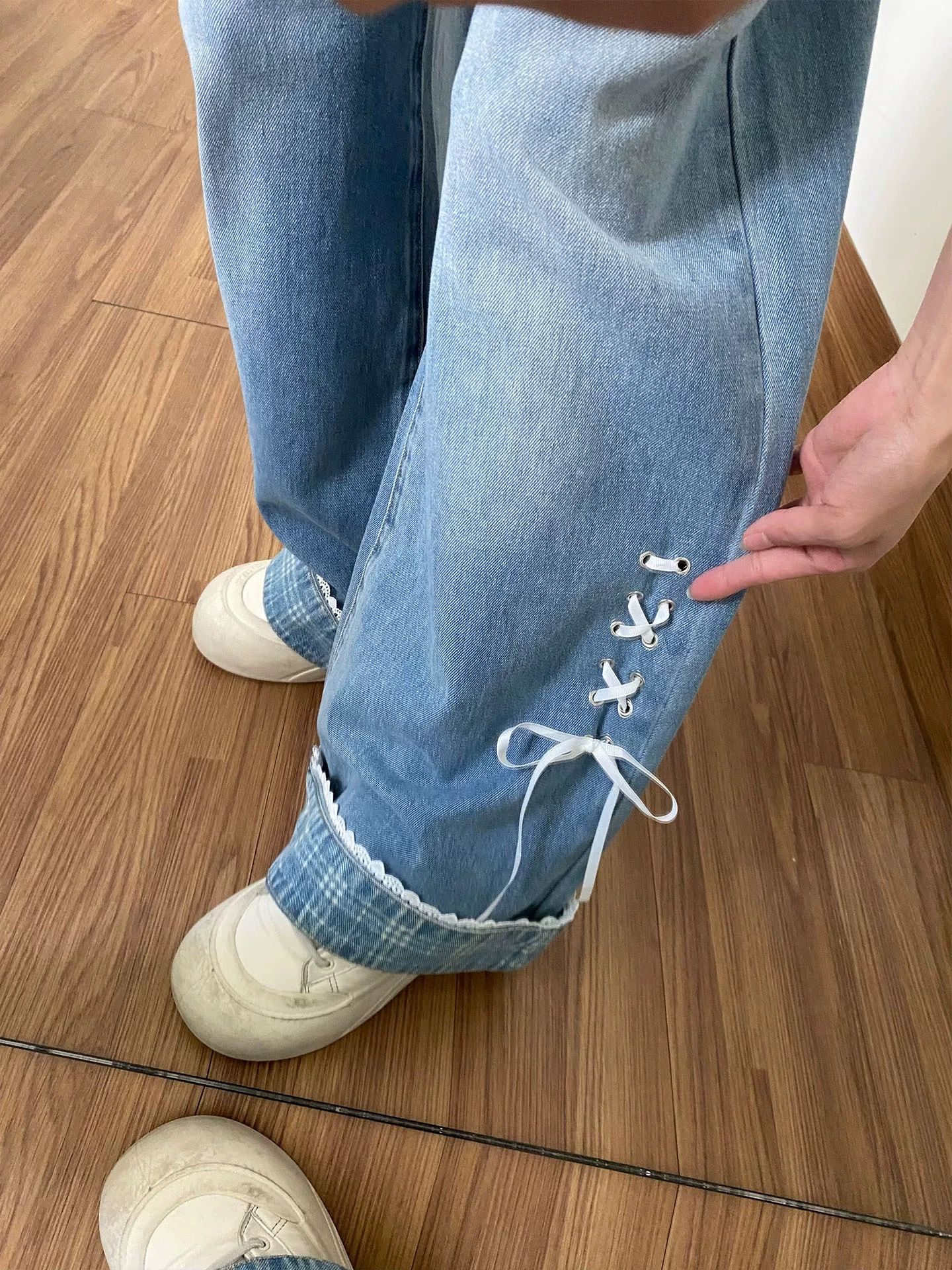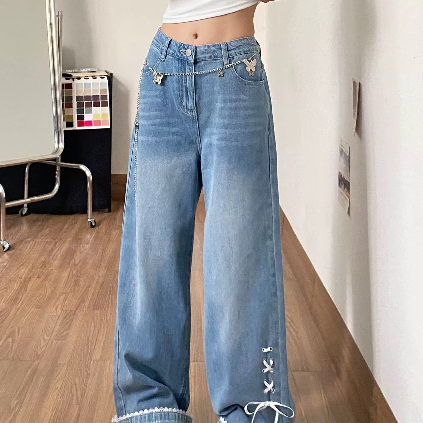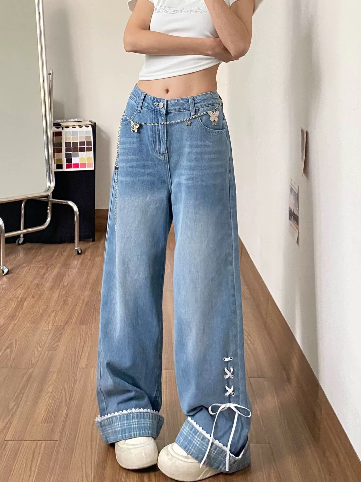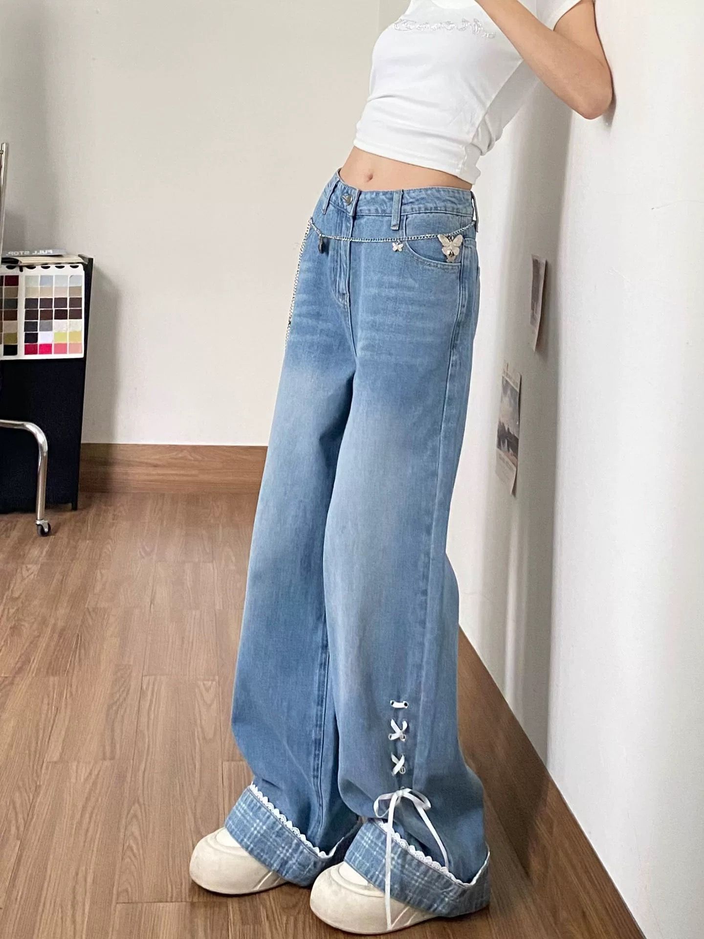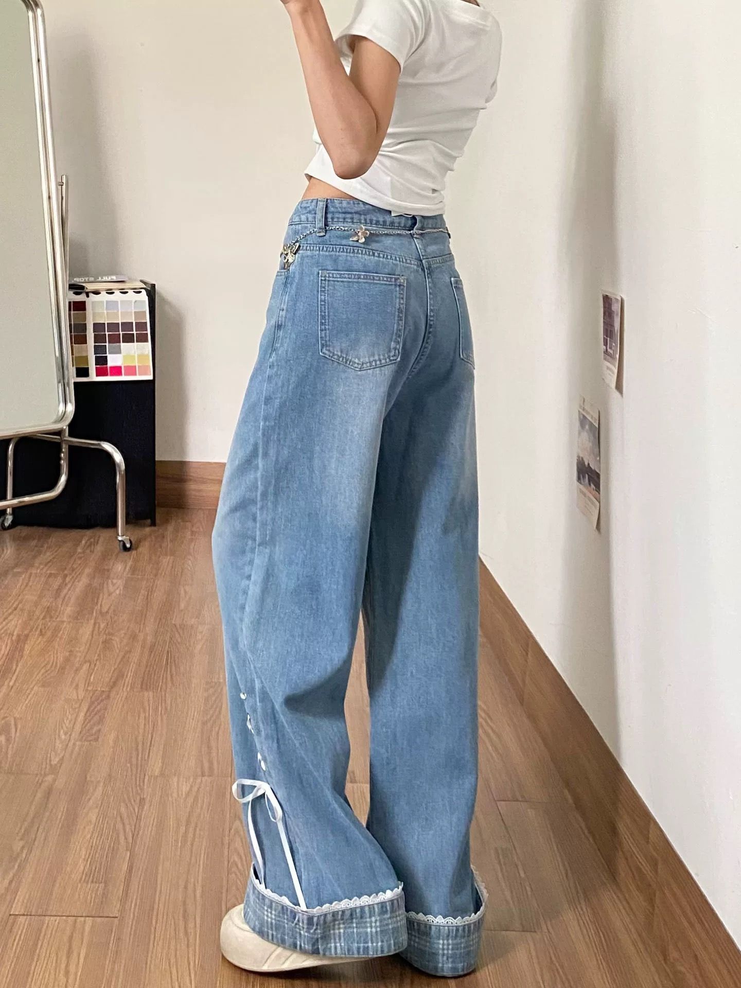 나비 매듭 스트랩 작은 대중 뒤집다 측면 청바지 여성 여름 2026 새로운 디자인 센스 루즈핏 스트레이트 와이드 레그 팬츠 어린이