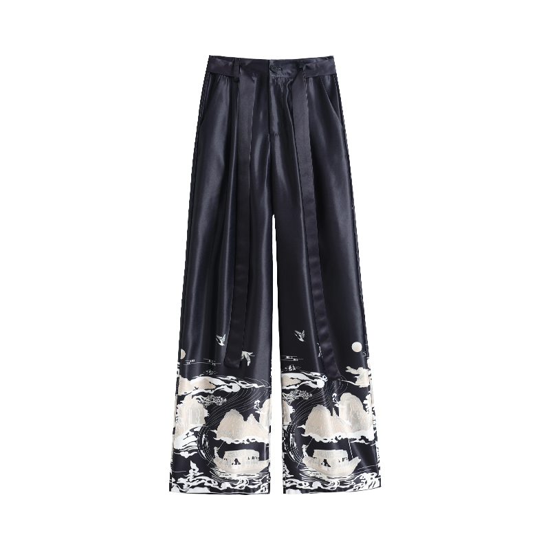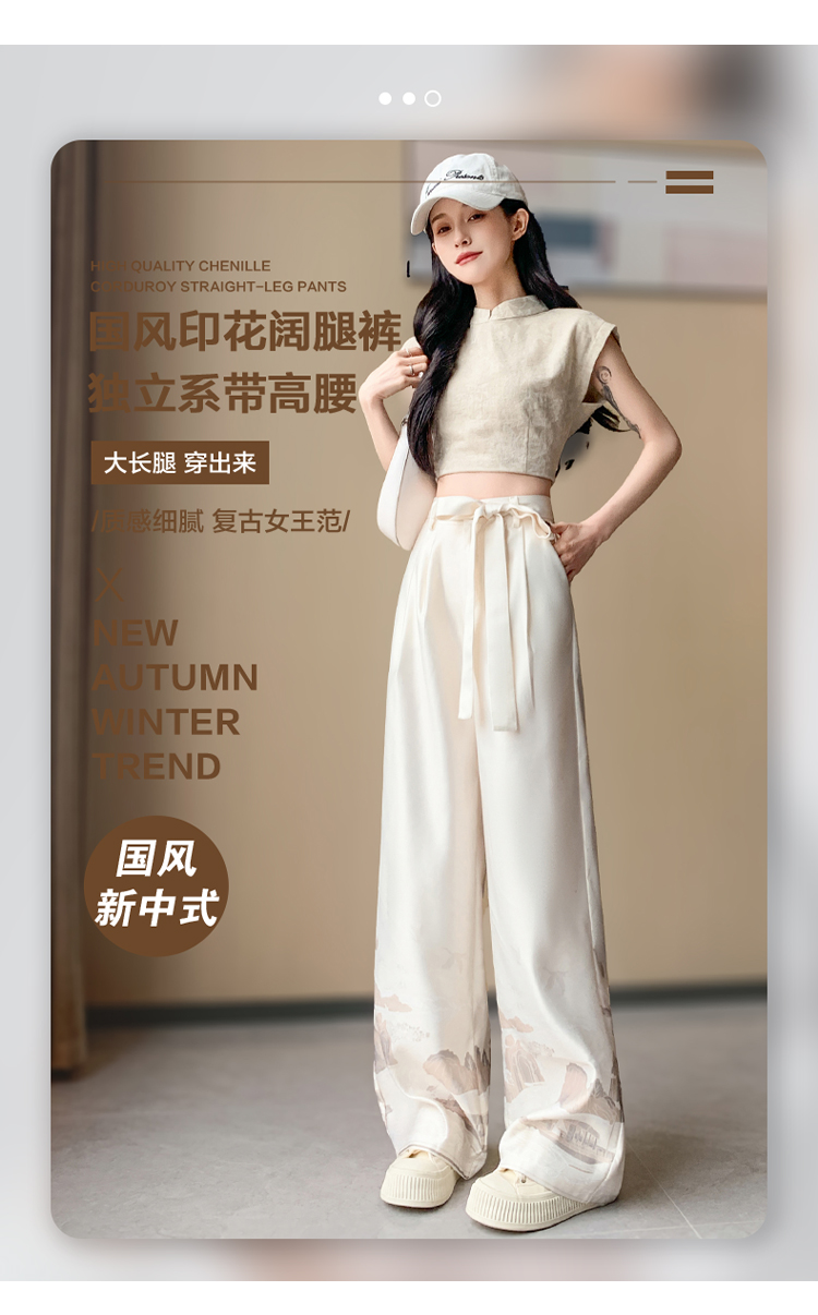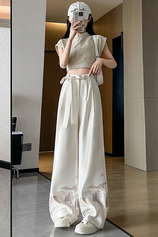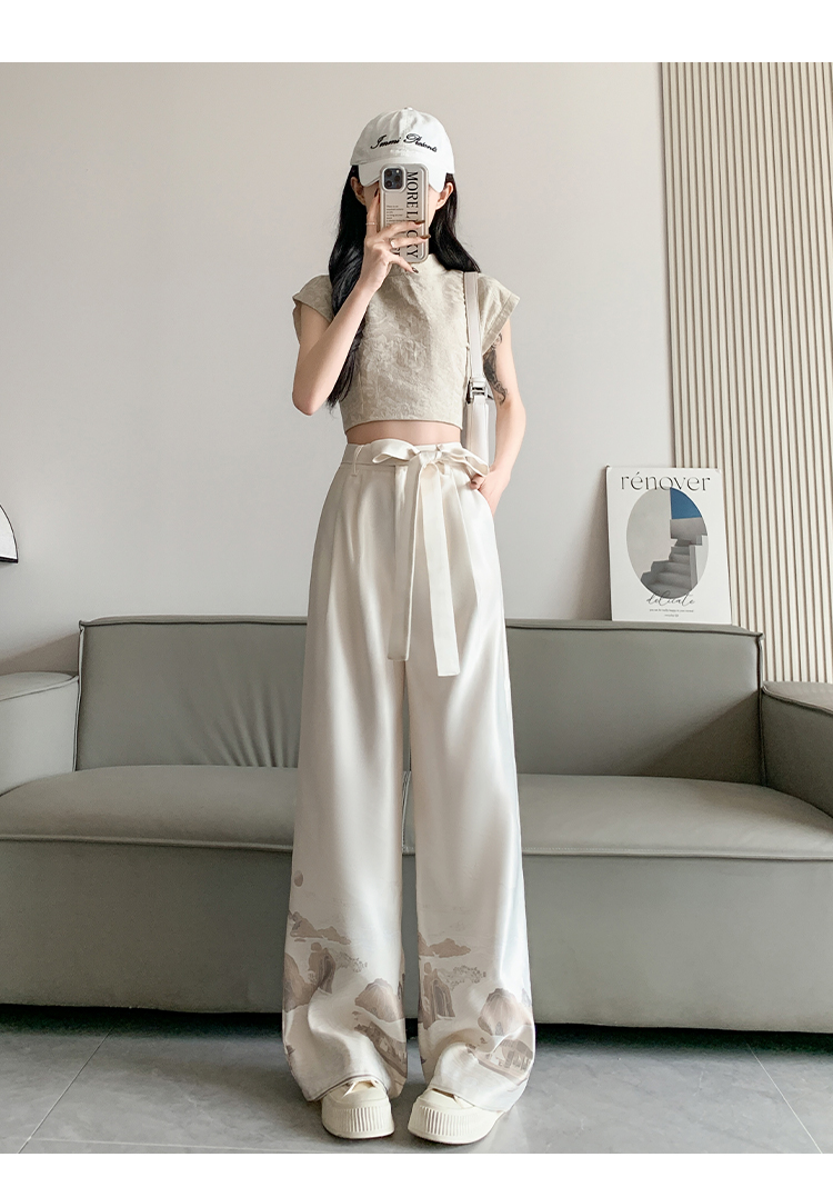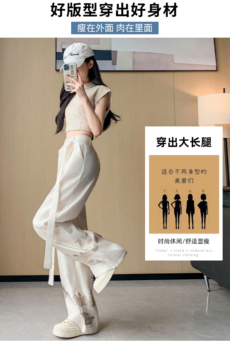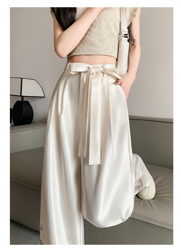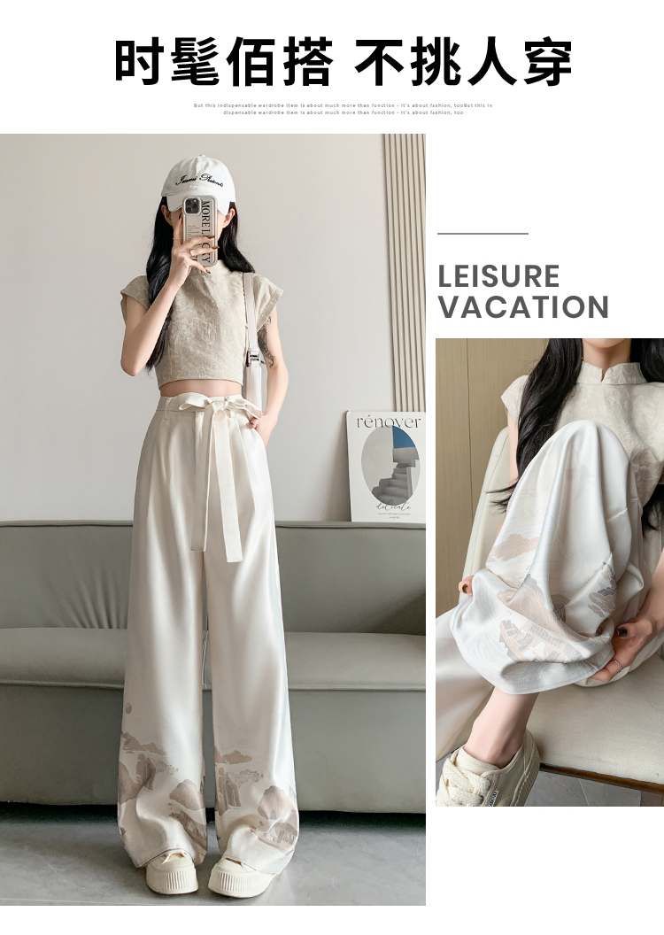 실사 2026 여름 새로운 아세트산 얼음 실크 프린트 와이드 레그 팬츠 새틴 스트레이트 새로운 중식 캐주얼 바지 아이들