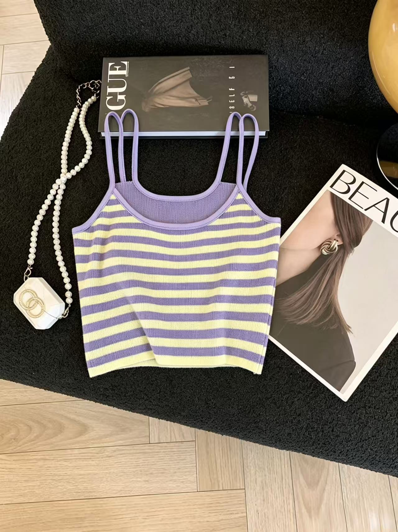 실사 프랑스식 레트로 스트라이프 슬립 여성 여름 외출용 디자인 센스 작은 대중 더블 어깨끈 니트 조끼 몸매 가꾸기 맨위