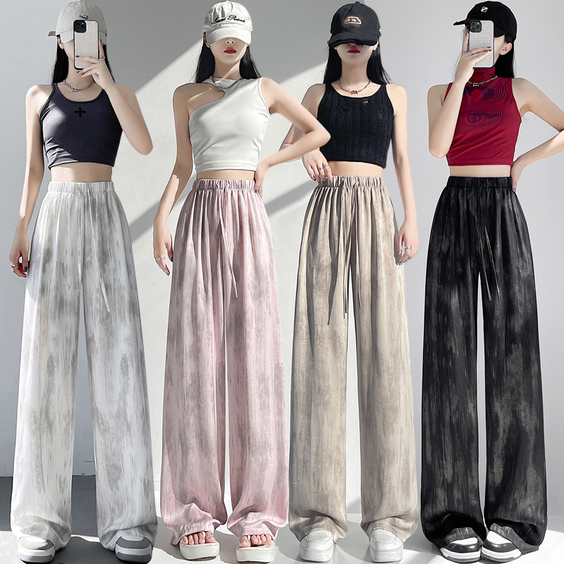 실제 촬영 얼음 실크 아세트산 새틴 넥타이 염색 와이드 레깅스 바지 여름 느슨한 스트레이트 도루 센스 도핑 여가 스트레이트 바지