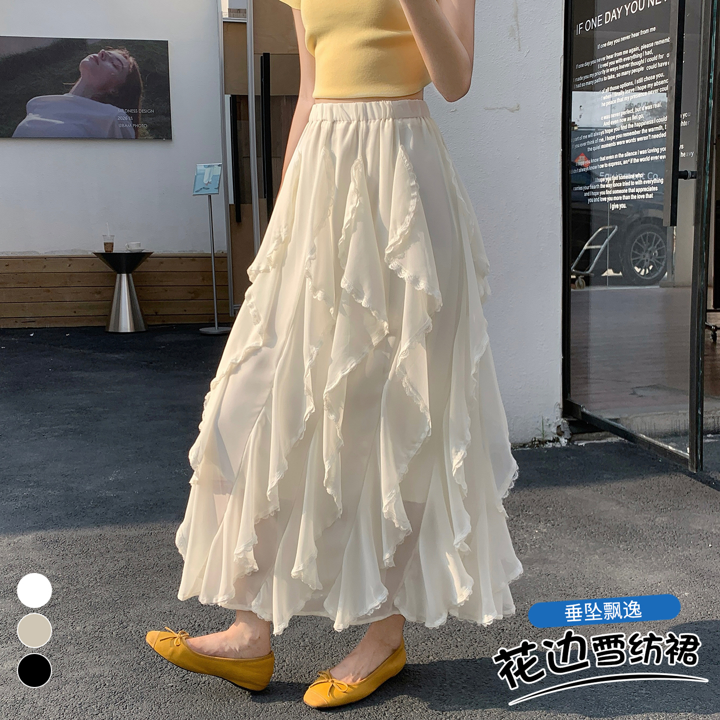 실사 화이트 프릴 불규칙 레이스 조각 쉬폰 반신 스커트 여성 여름 하이웨이스트 루즈핏 한 마디 롱 스커트