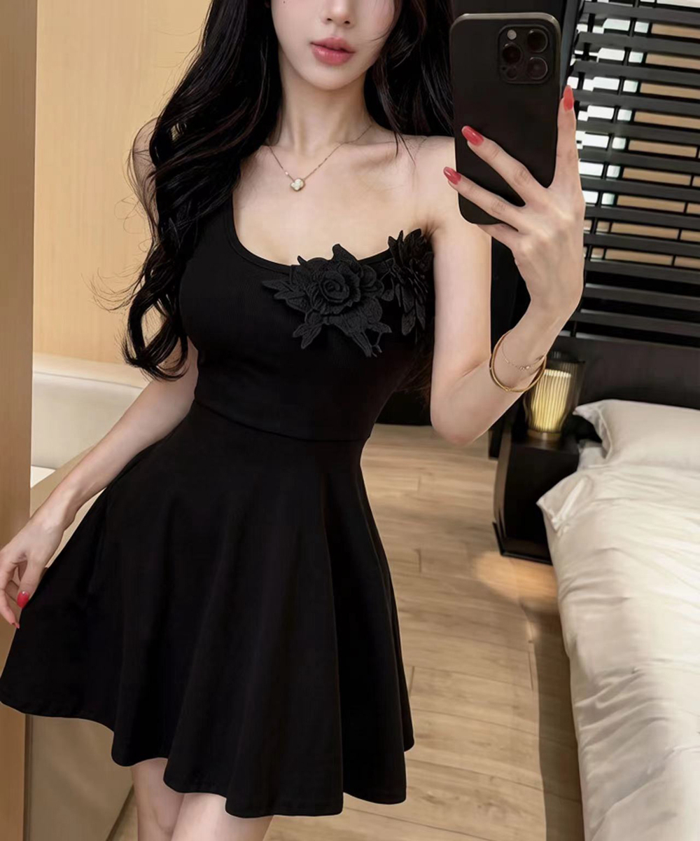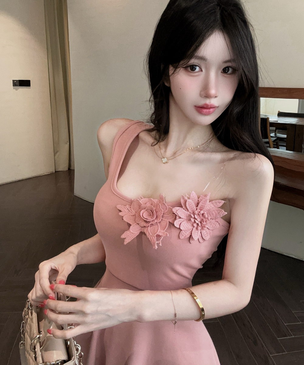 실사 핫걸 섹시함 낮은 가슴 허리 수축 큰 진자 꽃 숄더백 슬립 드레스 순수한 욕망 슬림해 보이는 연회 예복 치마