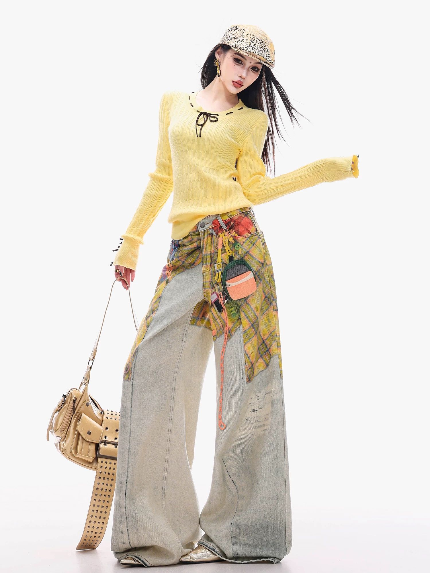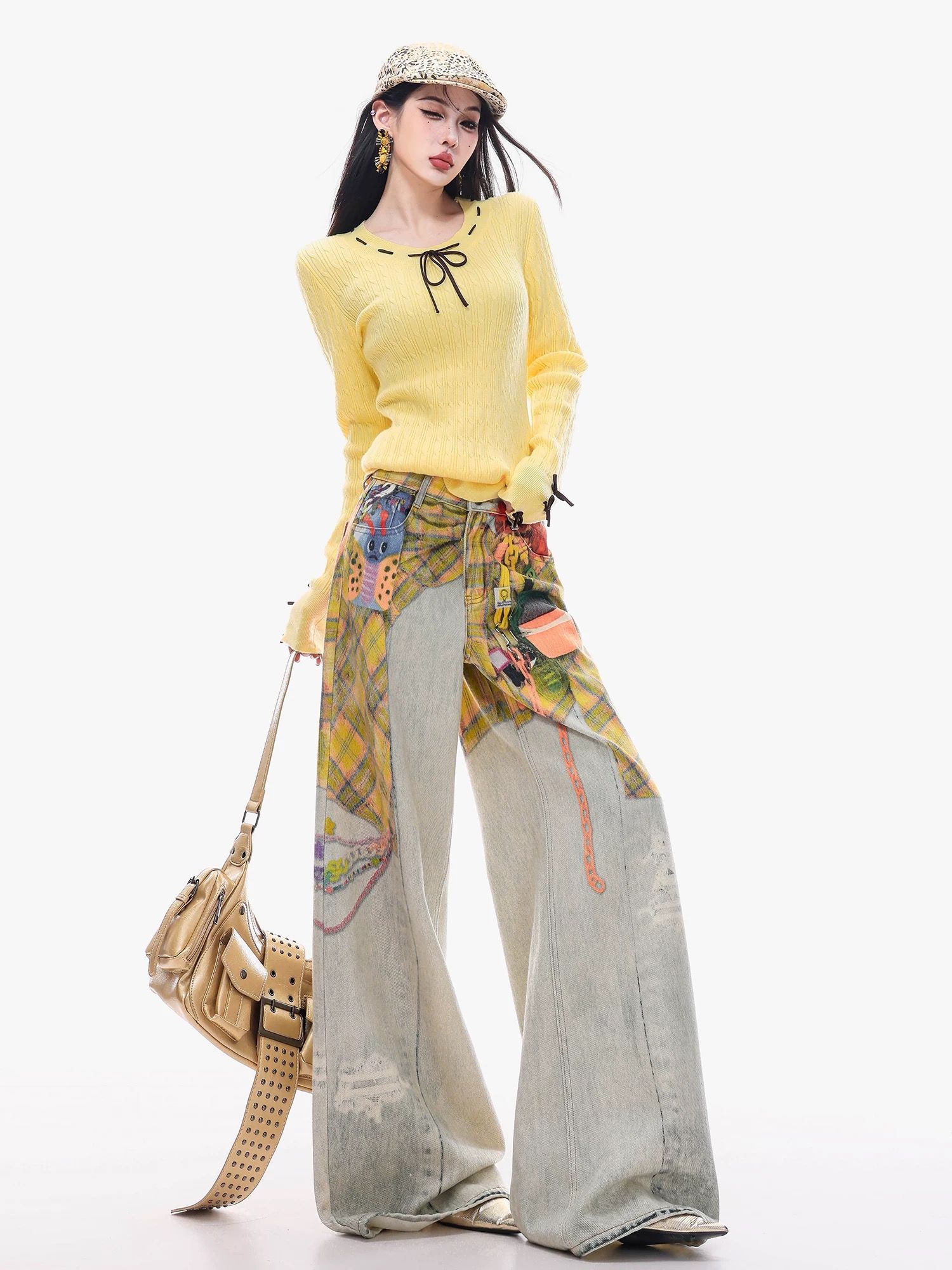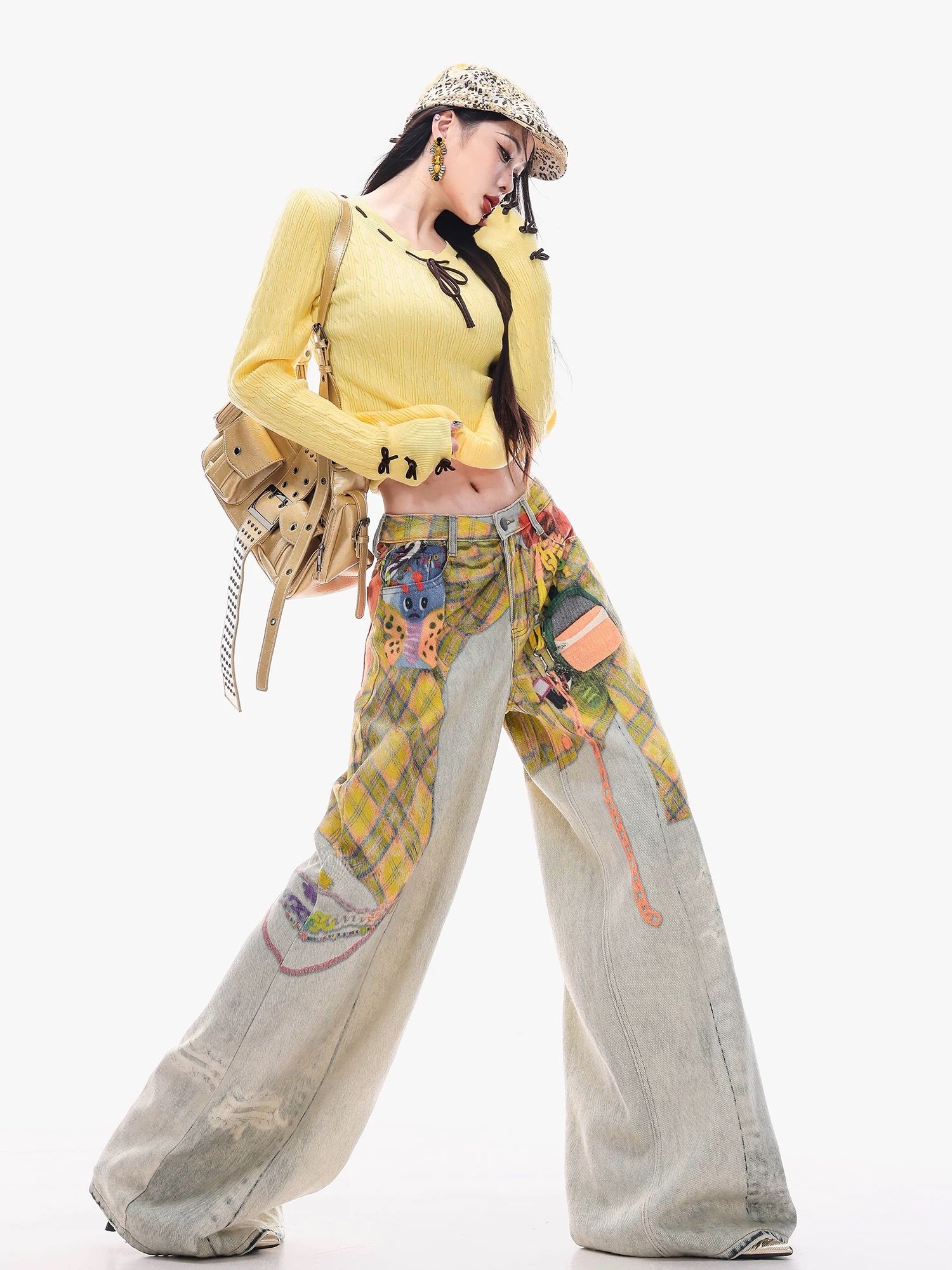높음 거리 작은 대중 디자인 센스 체크무늬 패치워크 와이드 레그 팬츠 2026 년 여름 루즈핏 슬림해 보이는 바닥 청소 청바지