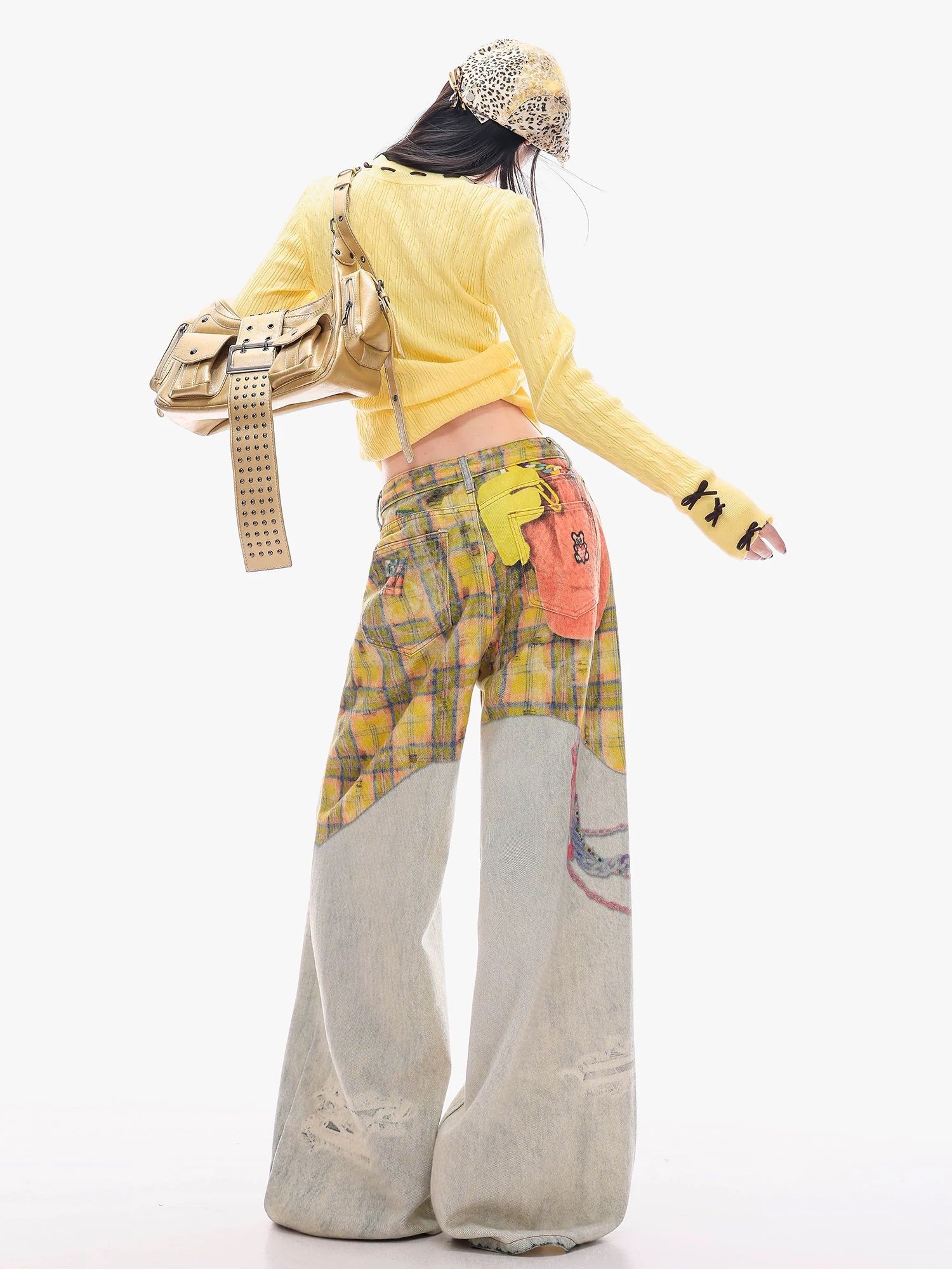 어린애 같은 추세 3 차원 프린트 체크무늬 넓은 다리 청바지 여성 봄 루즈핏 스트레이트 팬츠