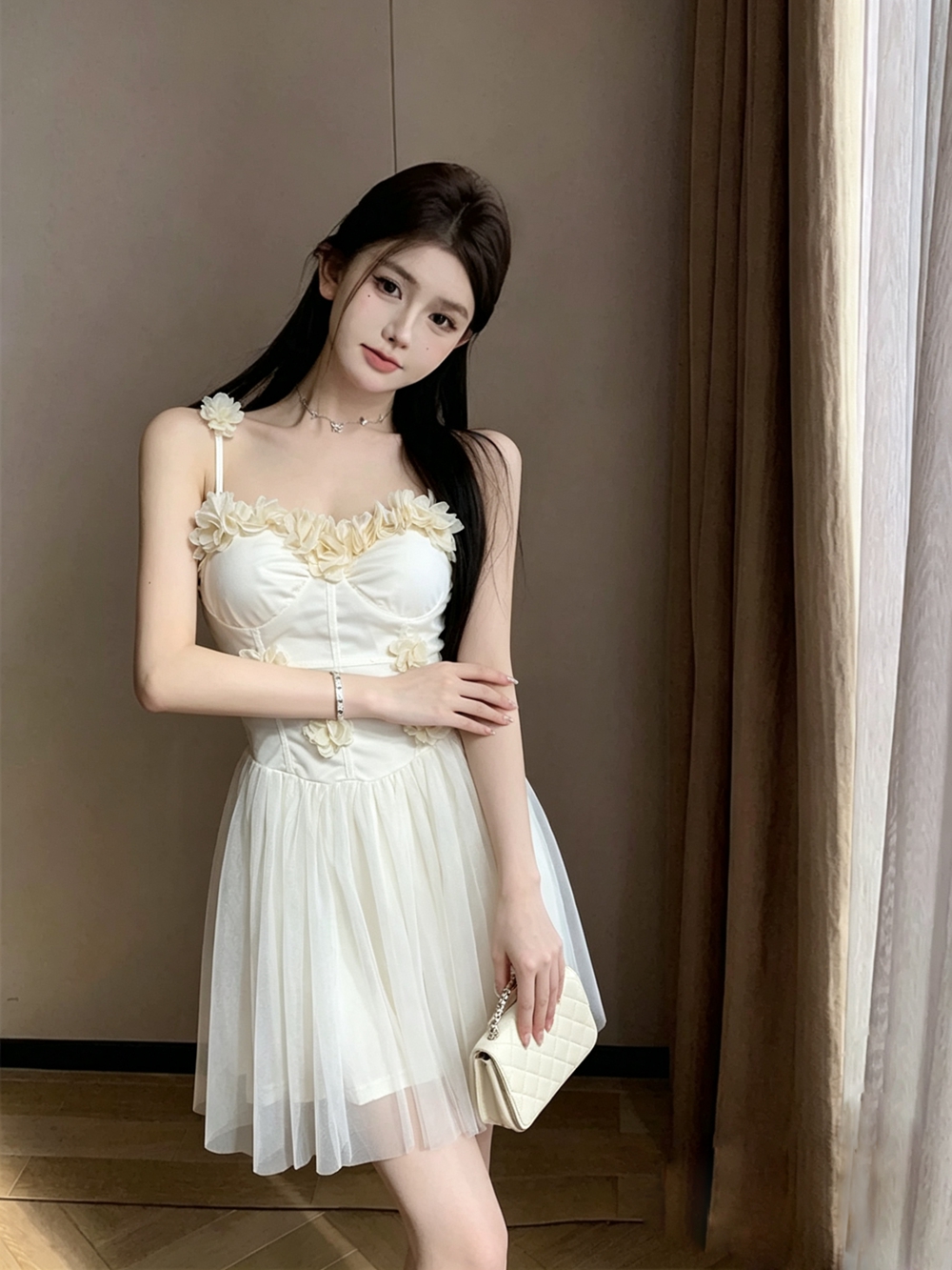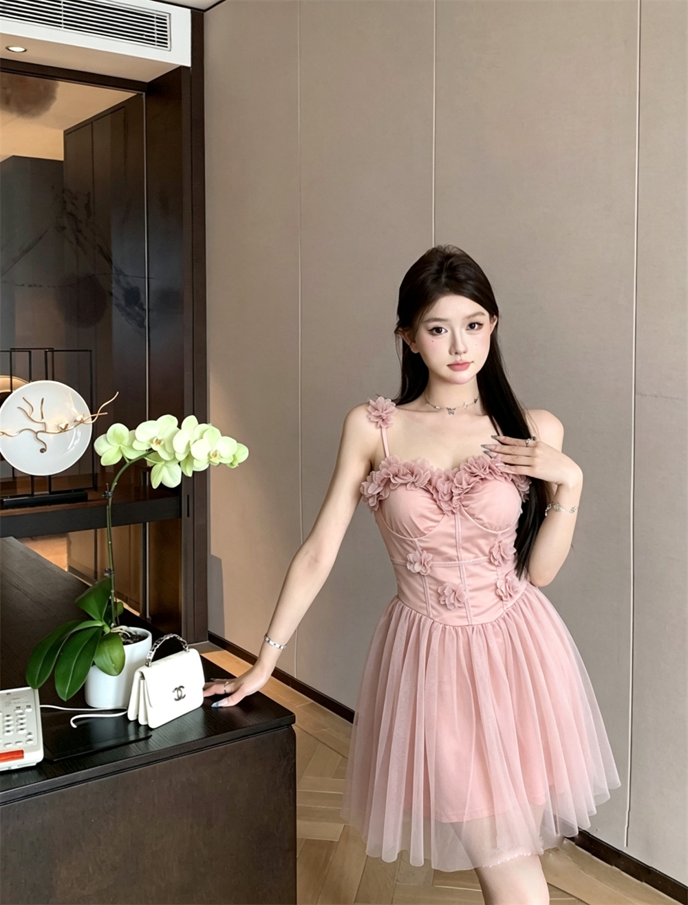 실사 요정 공차 가짜 바람 신선함 슬립 여성 드레스 여름 3 차원 망사 꽃 허리 수축 예복 미니 스커트