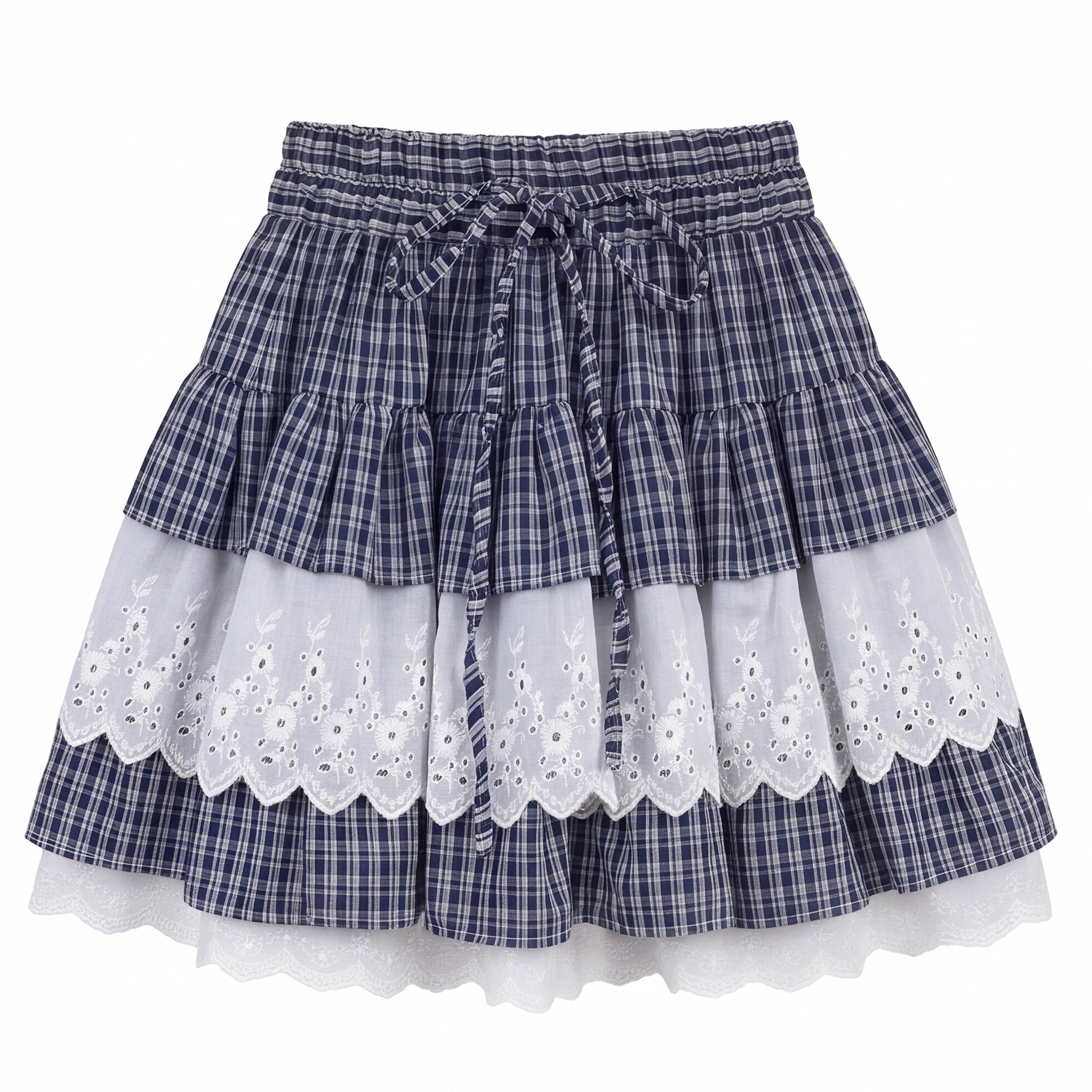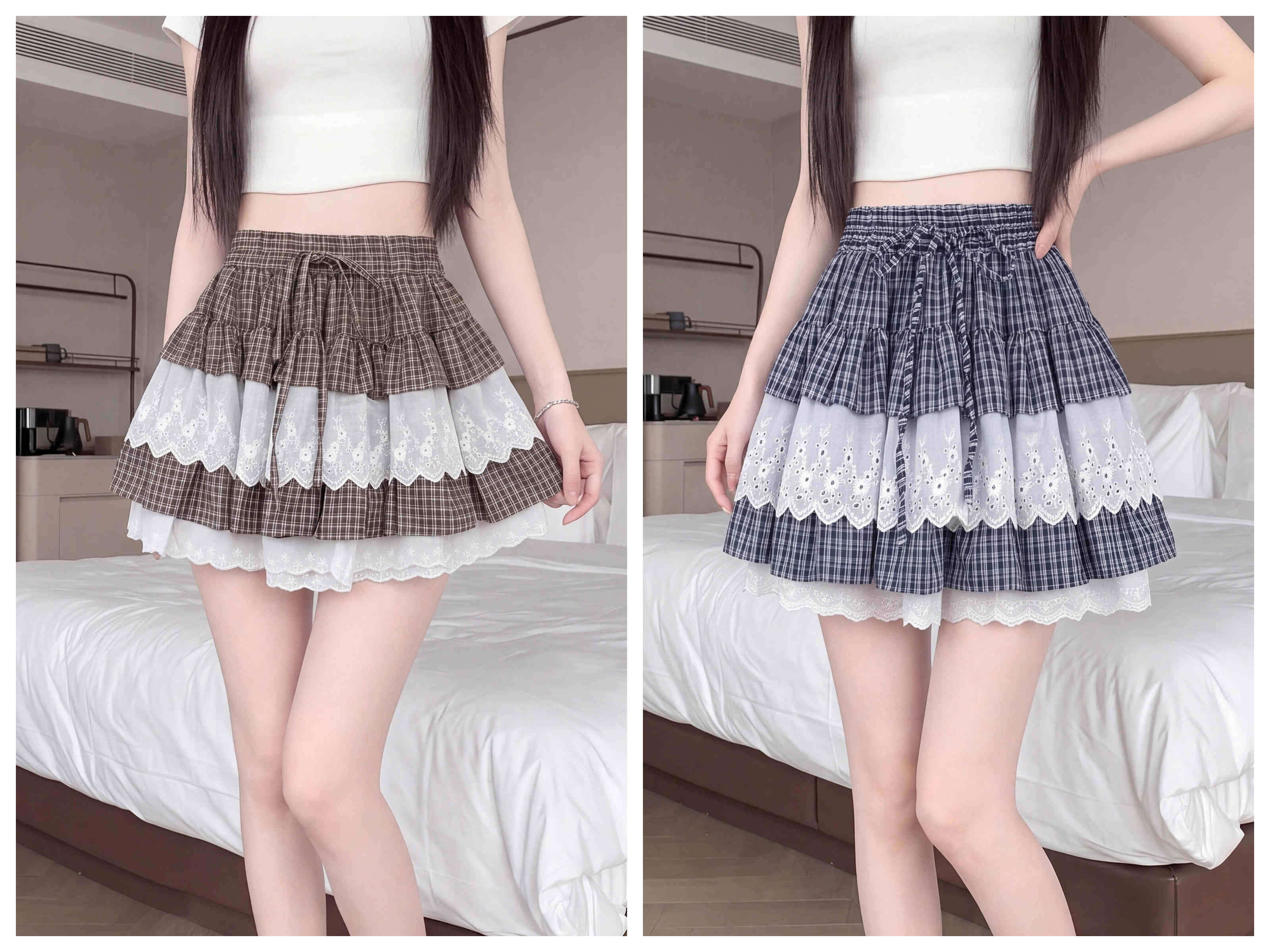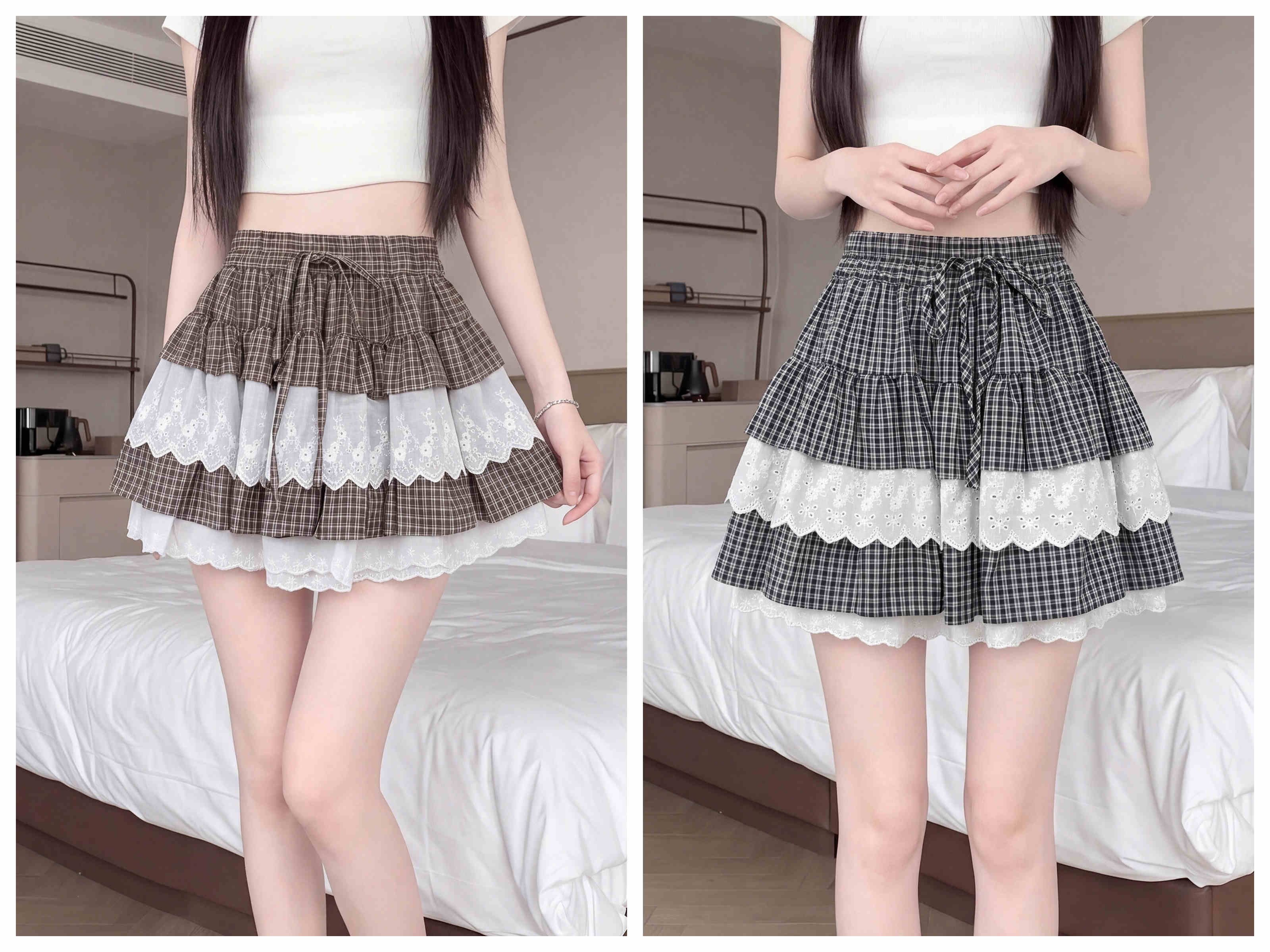 실사 2026 여름 새로운 체크무늬 퍼프 스커트 패션 몸매 가꾸기 레이스 반신 스커트 작은 키 A라인 스커트