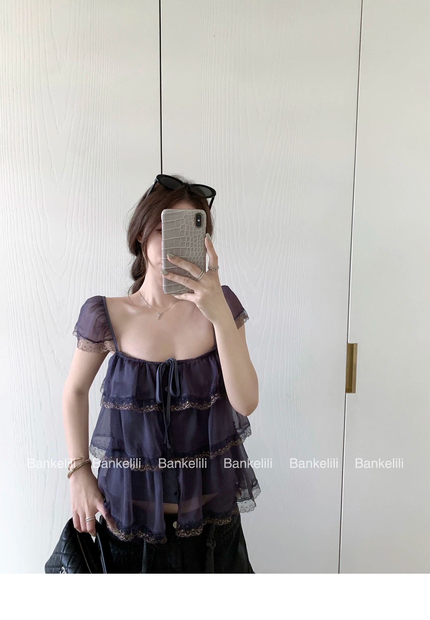 lwr with u 달빛 명나라 연주하다 곡 프랑스식 불규칙 리본 디자인 센스 쉬폰 작은 셔츠 반팔 맨위 여성