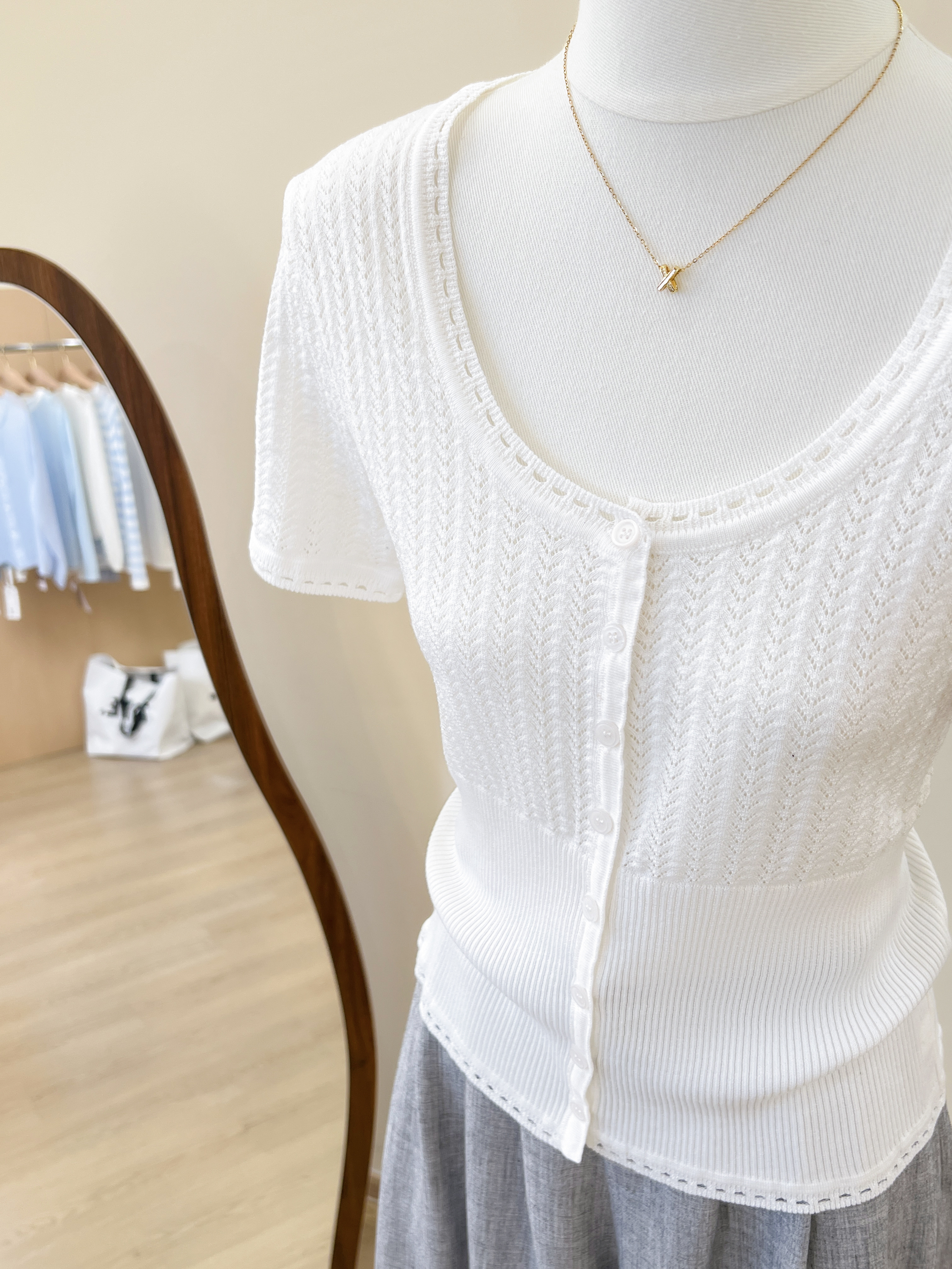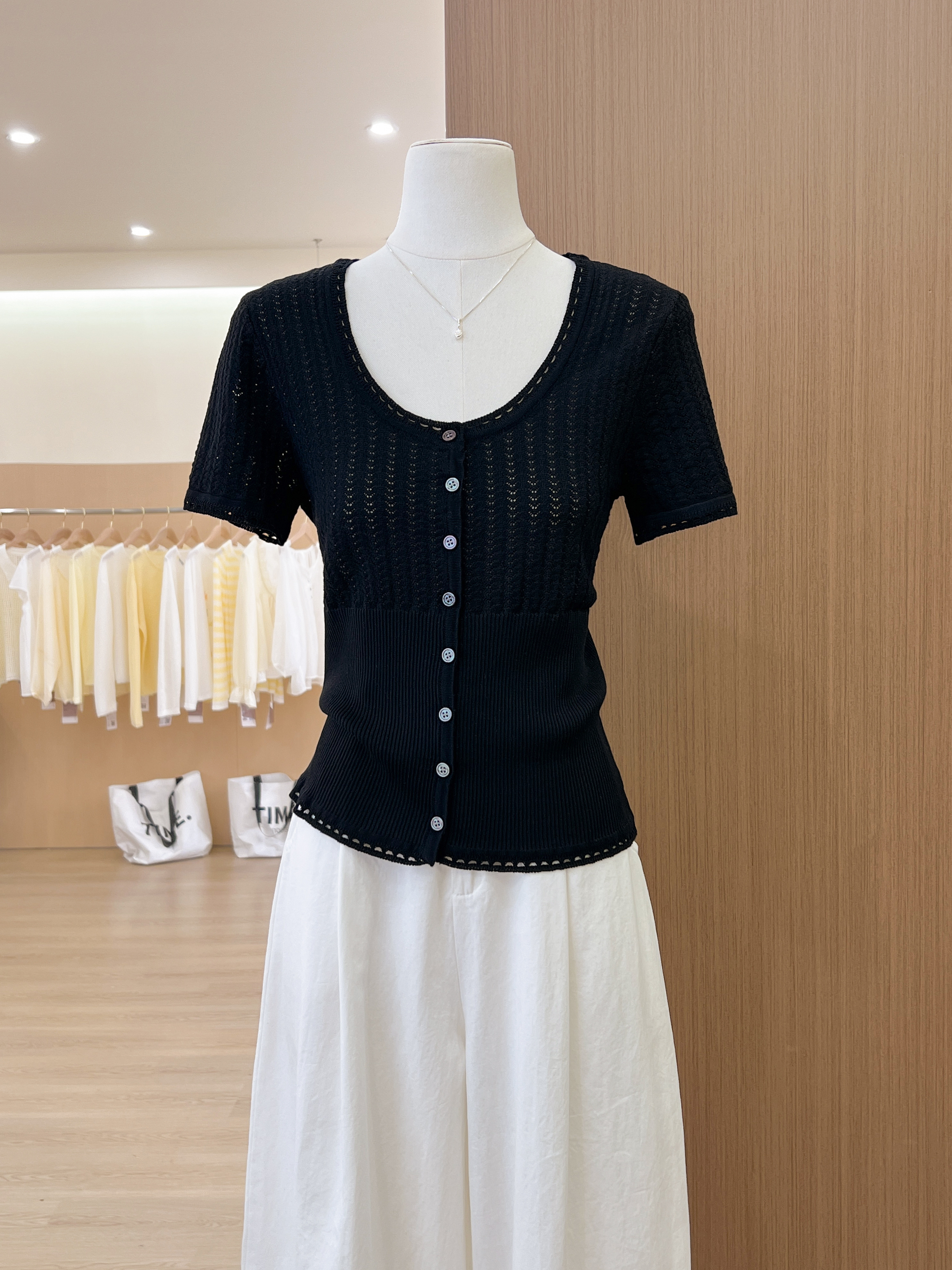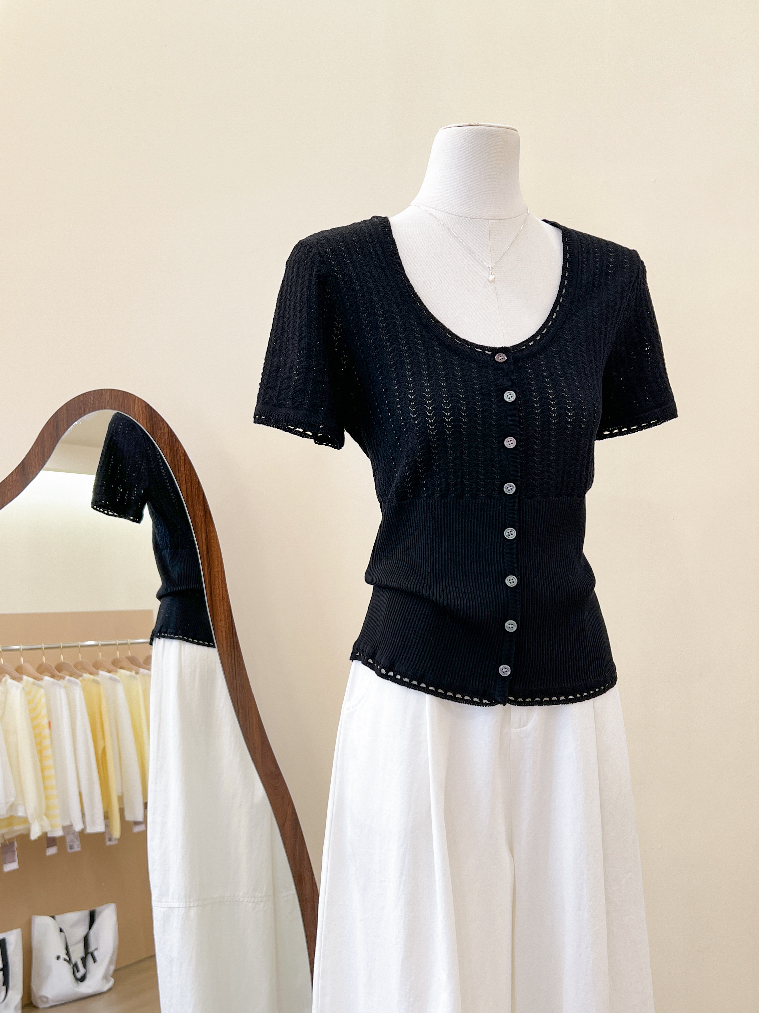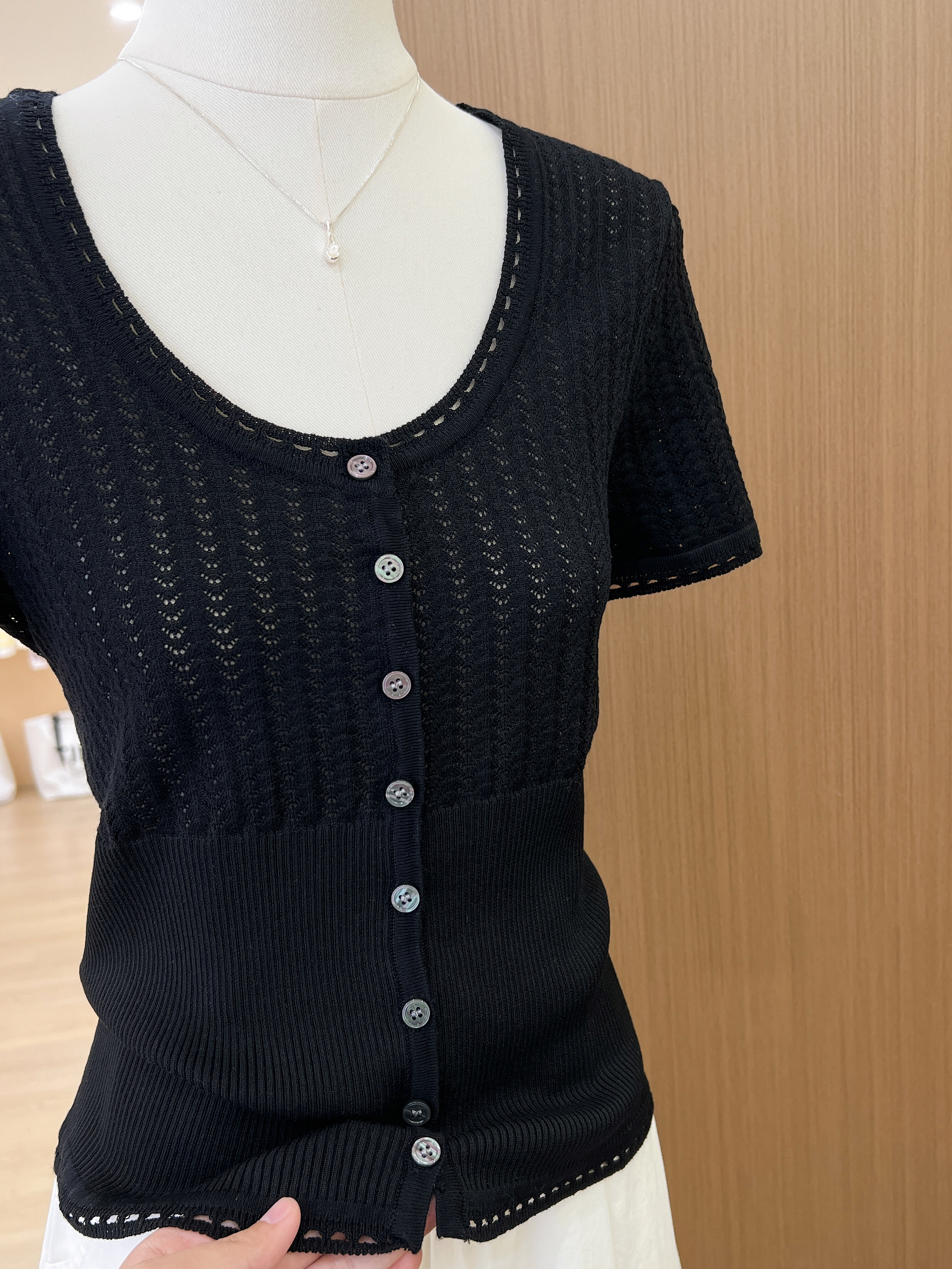 실사 니트 u 칼라 홀로우 아웃 싱글 줄 버튼 반팔 오픈 가디건 여성 2026 여름 새로운 몸매 가꾸기 슬림해 보이는 얇은 스타일 맨위