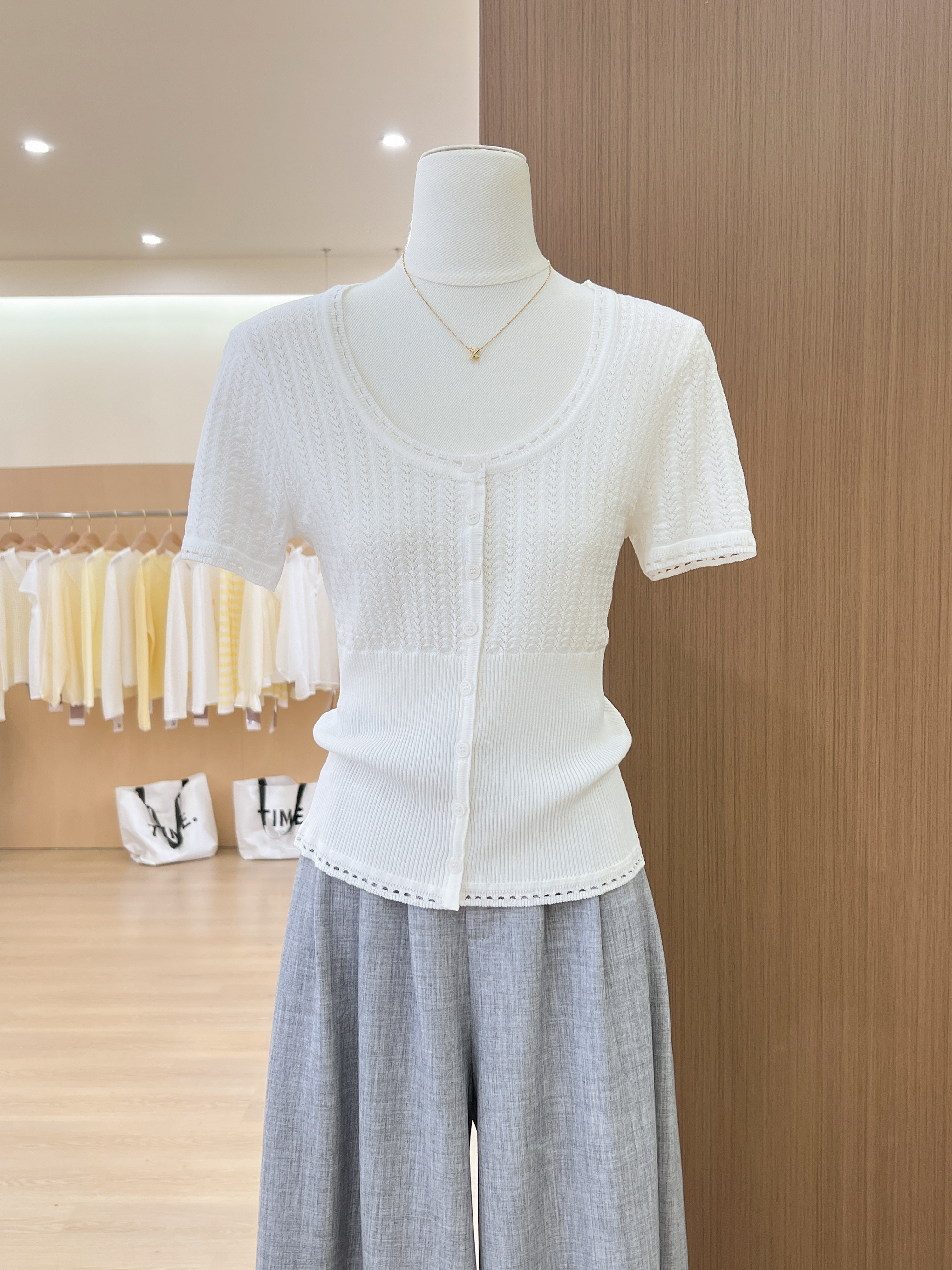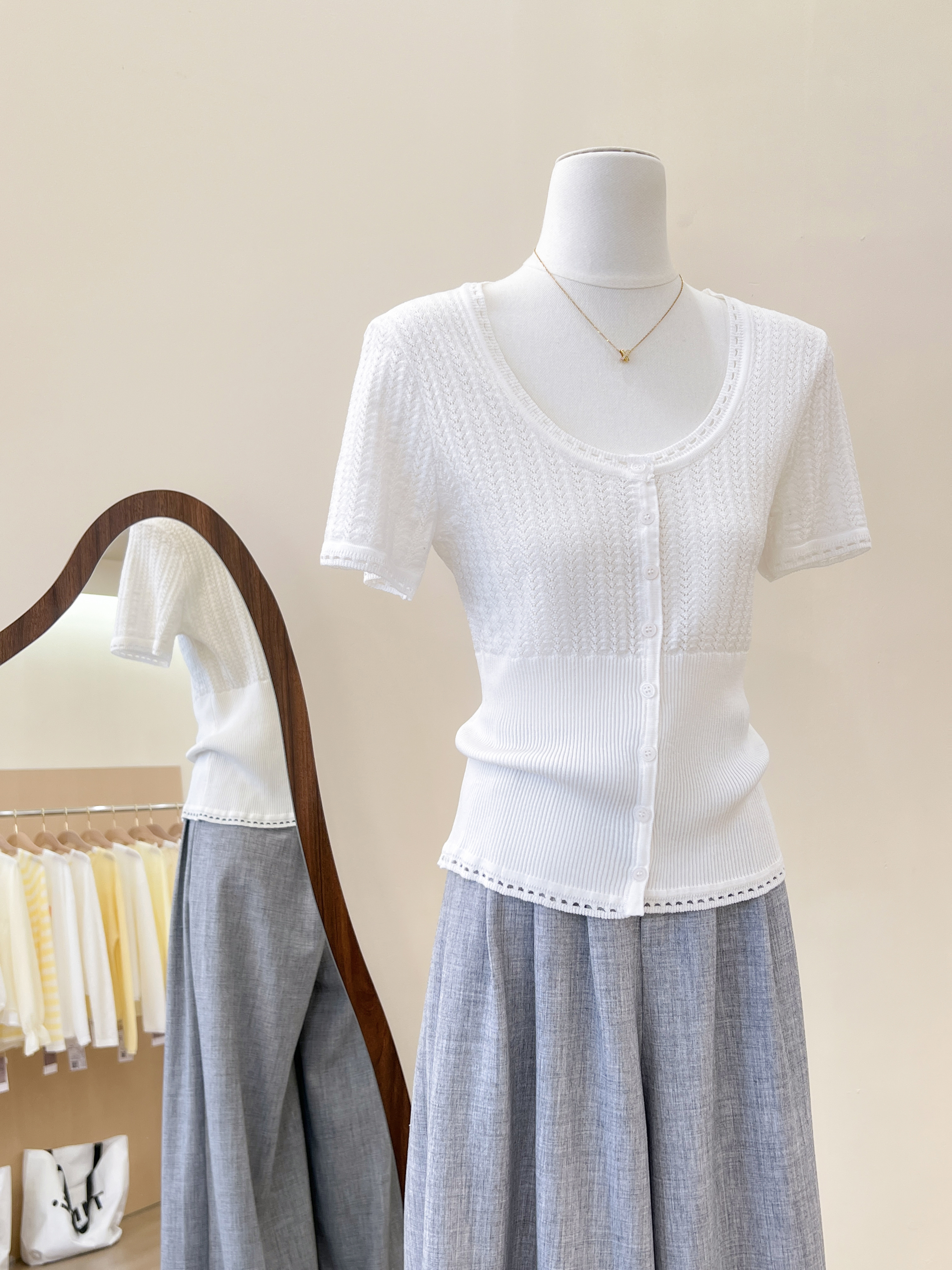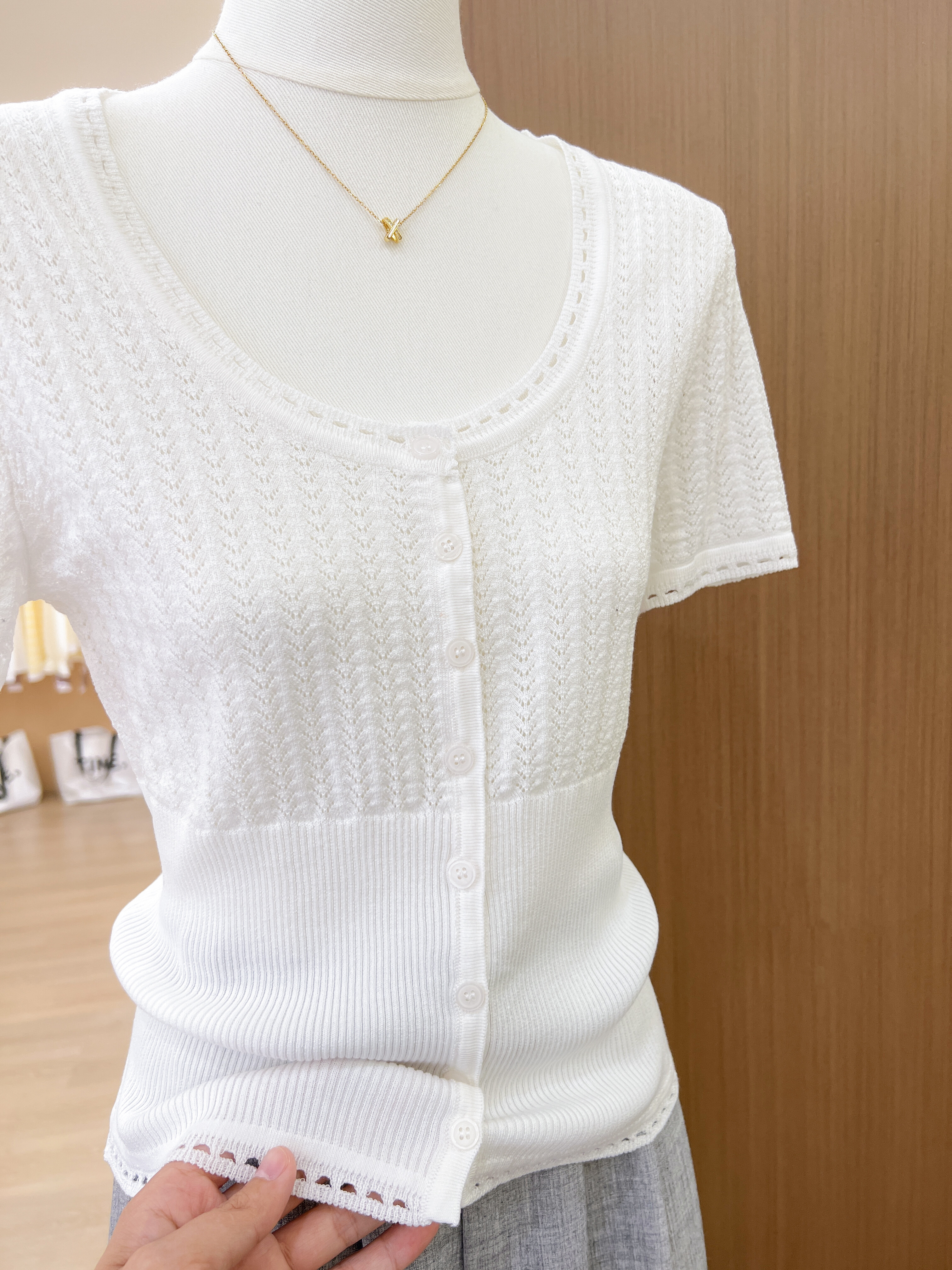 실사 느슨함 와 성별 화이트 라운드 넥 홀로우 아웃 반팔 티셔츠 여성 여름 몸매 가꾸기 얇은 스타일 니트 오픈 가디건 맨위