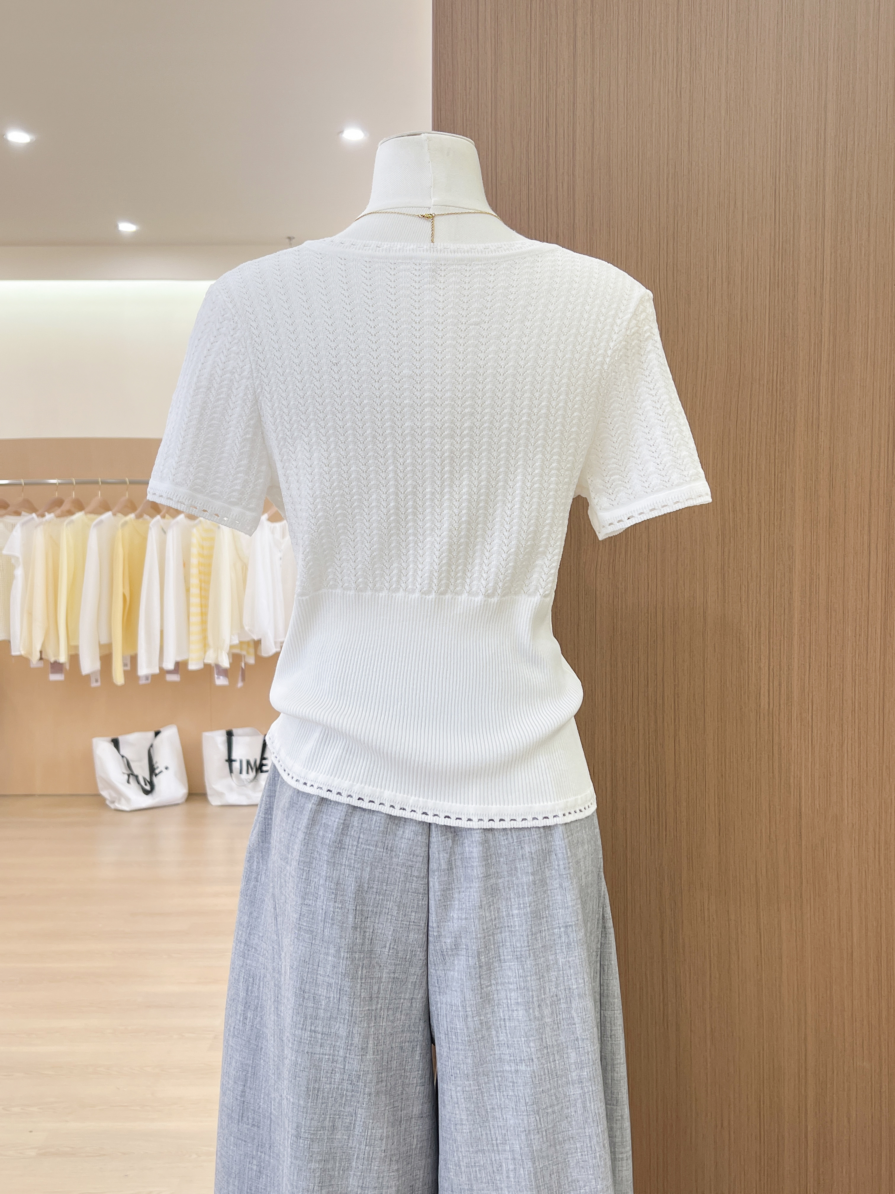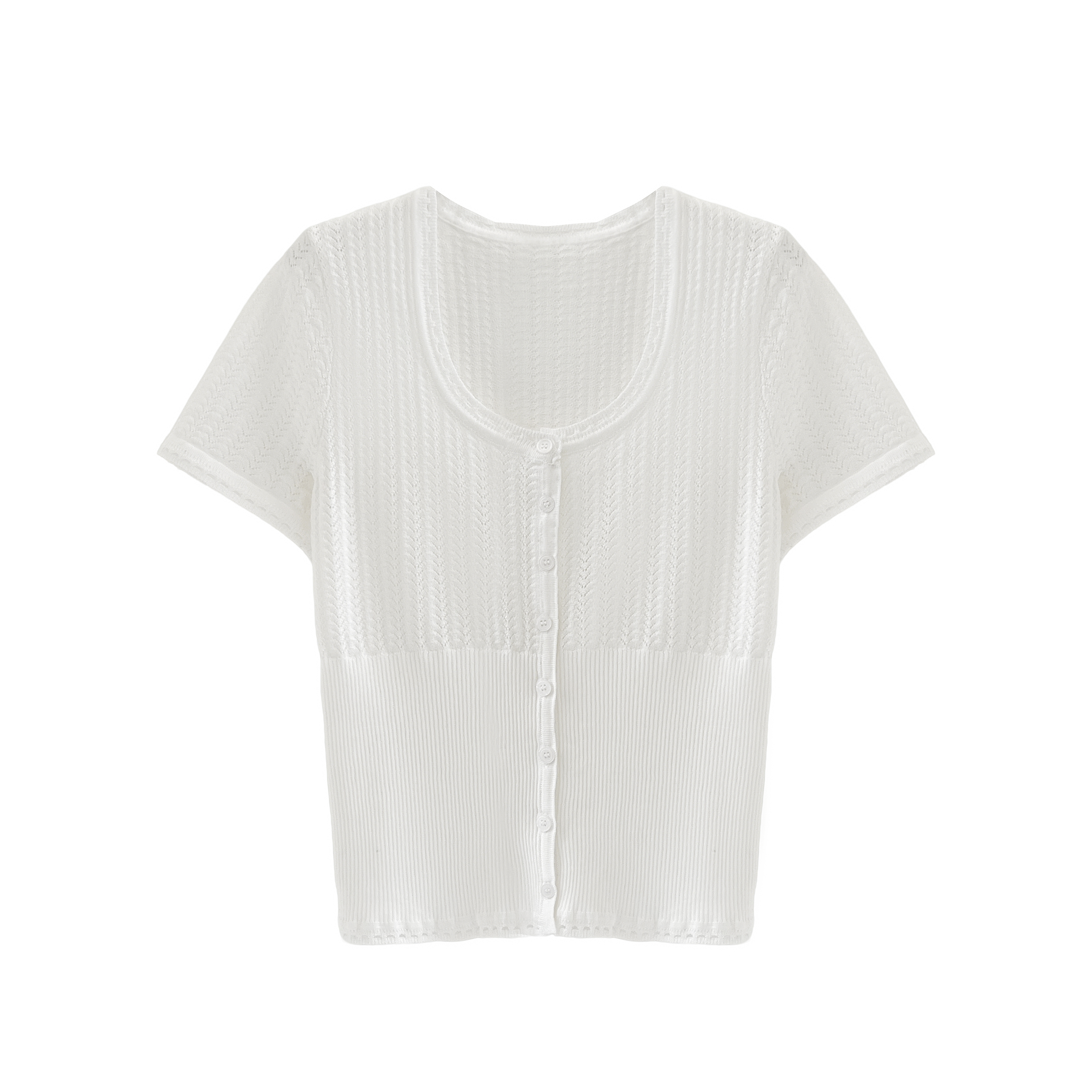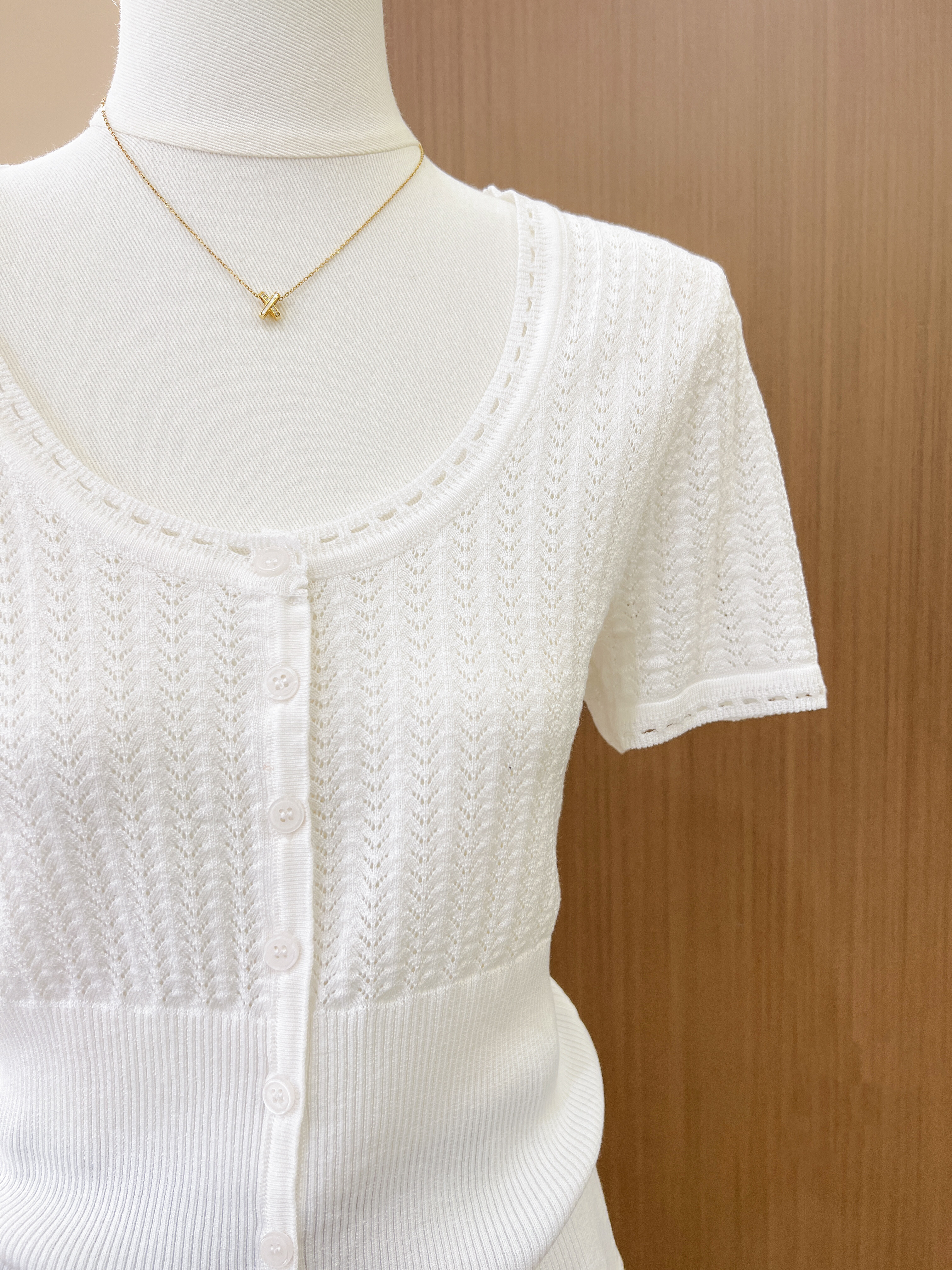 실사 느슨함 와 성별 화이트 라운드 넥 홀로우 아웃 반팔 티셔츠 여성 여름 몸매 가꾸기 얇은 스타일 니트 오픈 가디건 맨위