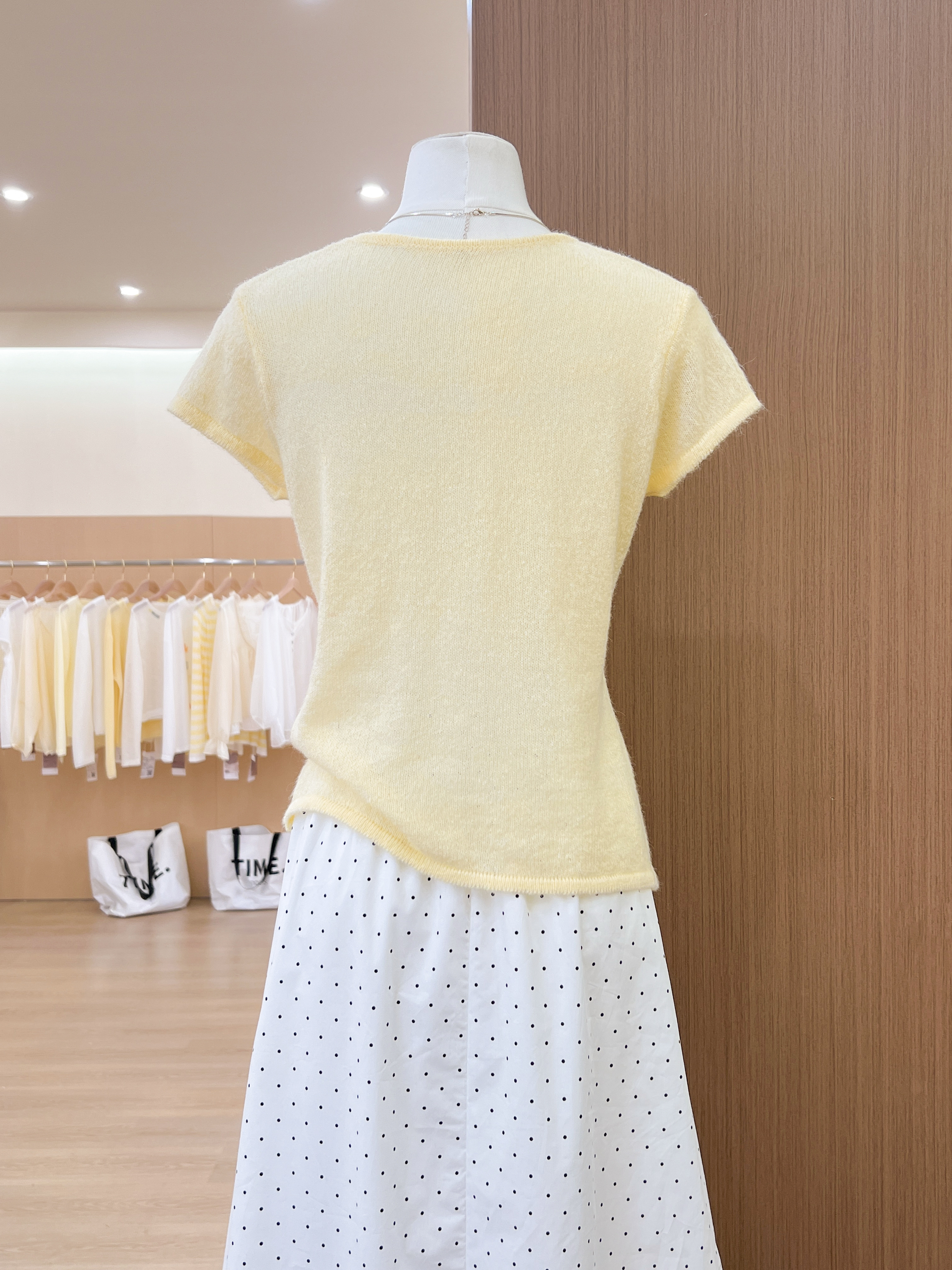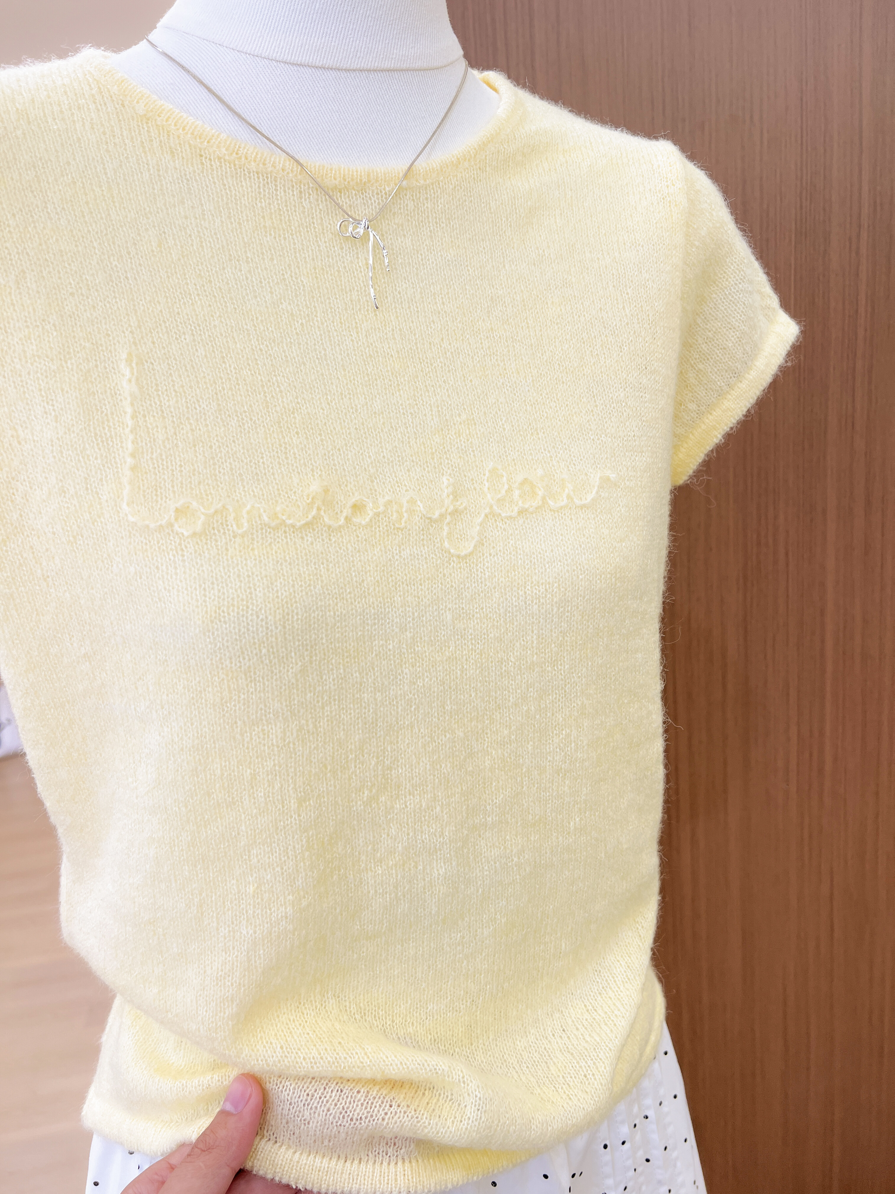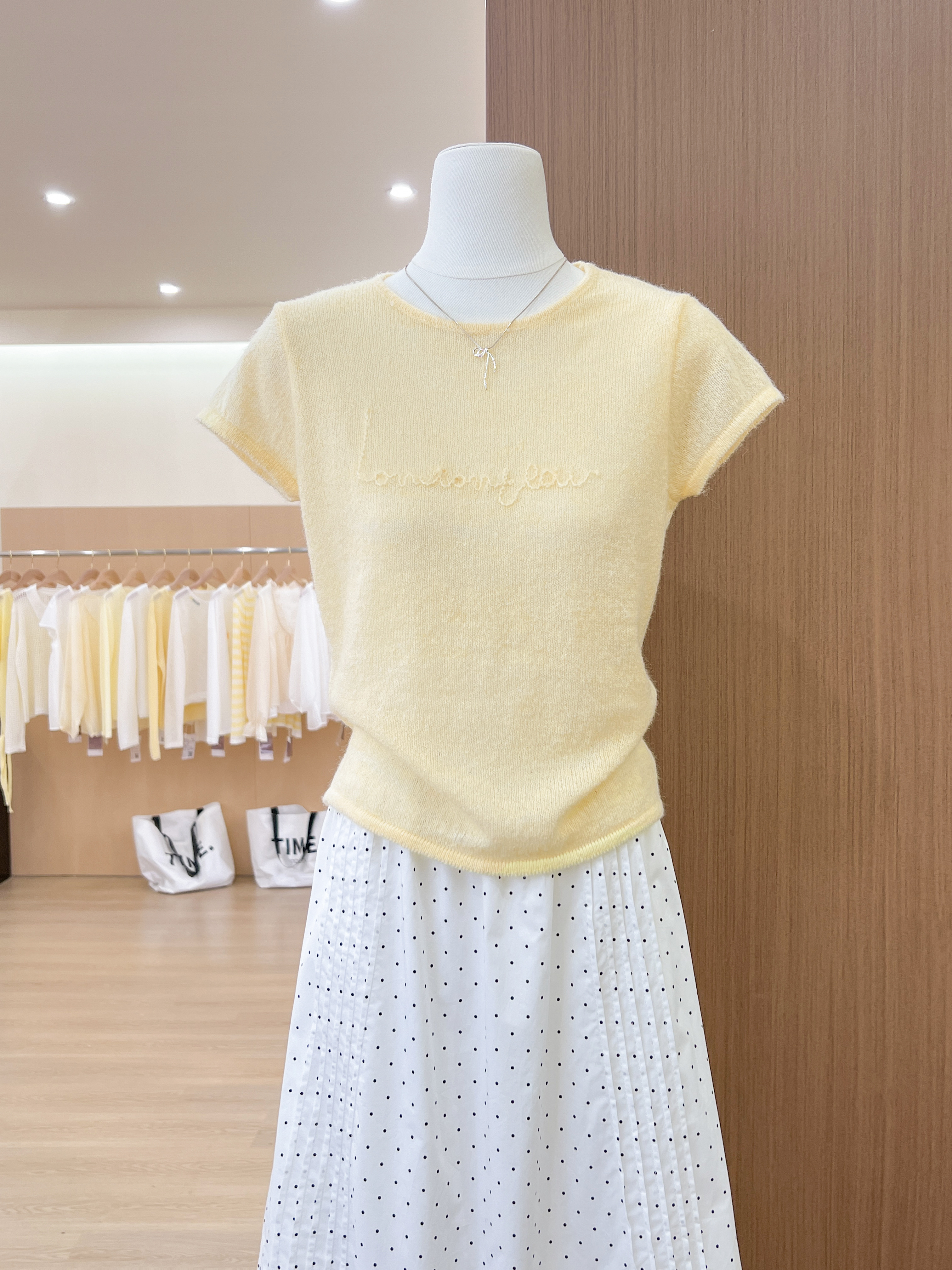 실사 황색 알파벳 자수 니트 반팔 티셔츠 여성 여름 고유 한 아름다운 디자인 센스 긍정적 인 어깨 라운드 넥 맨위