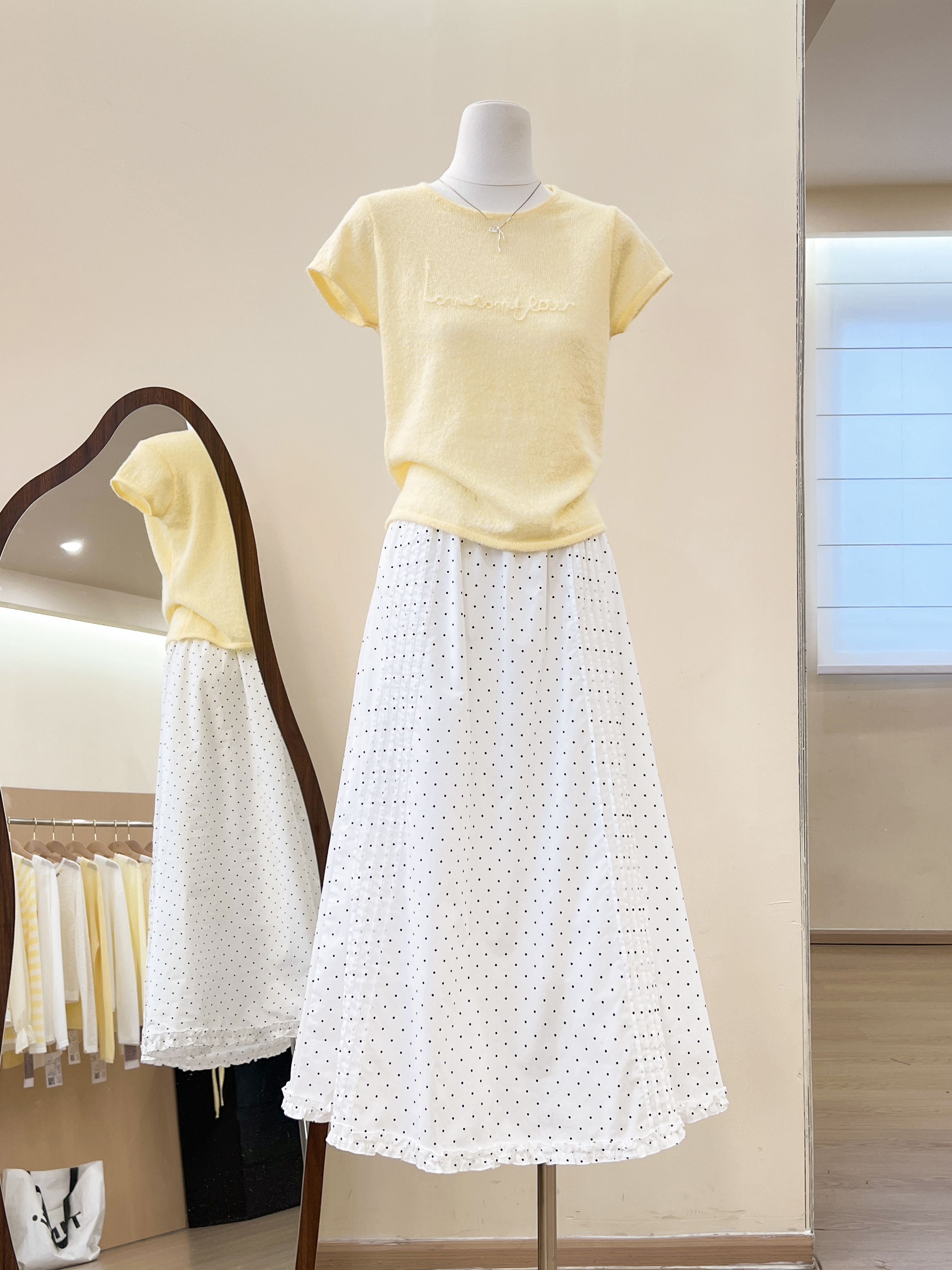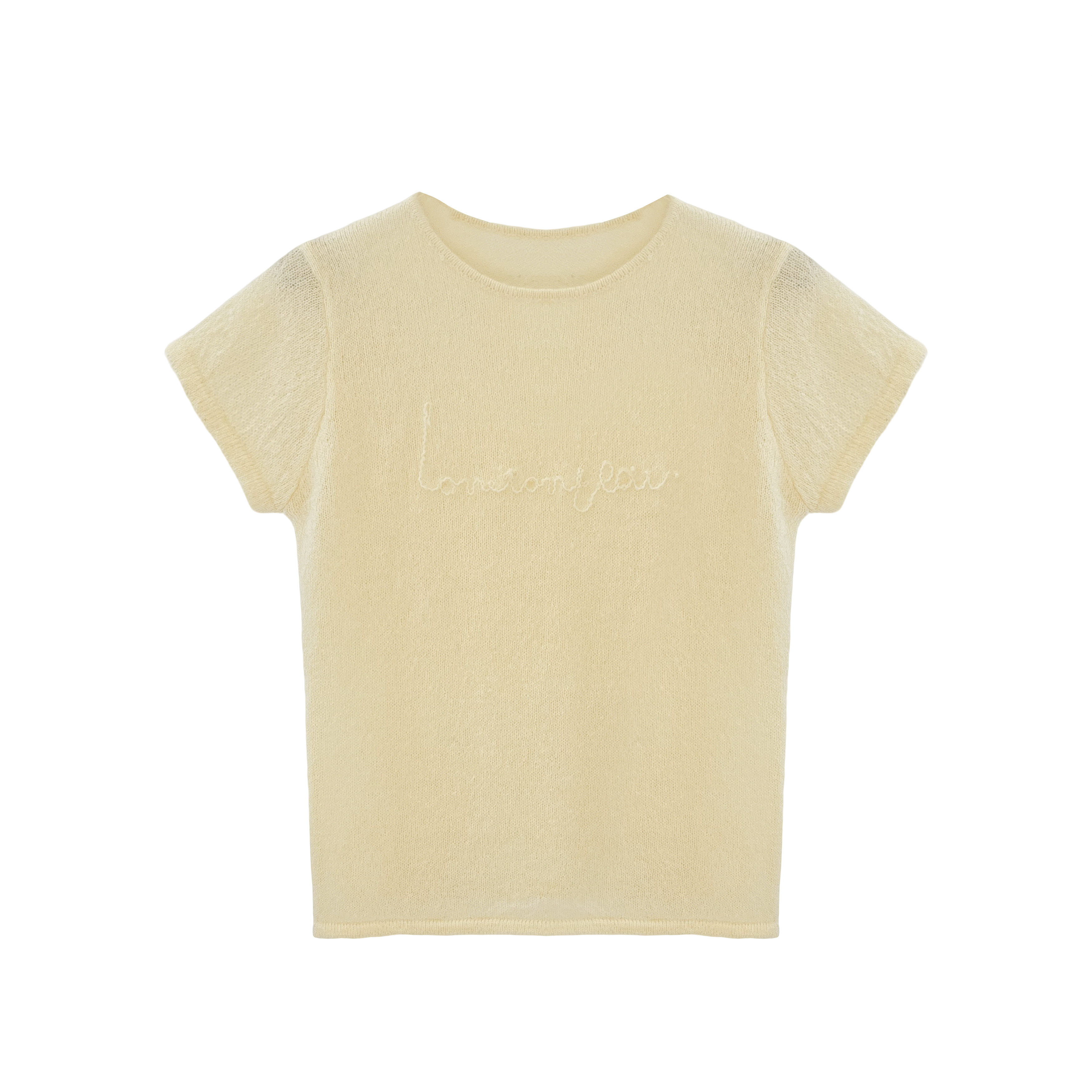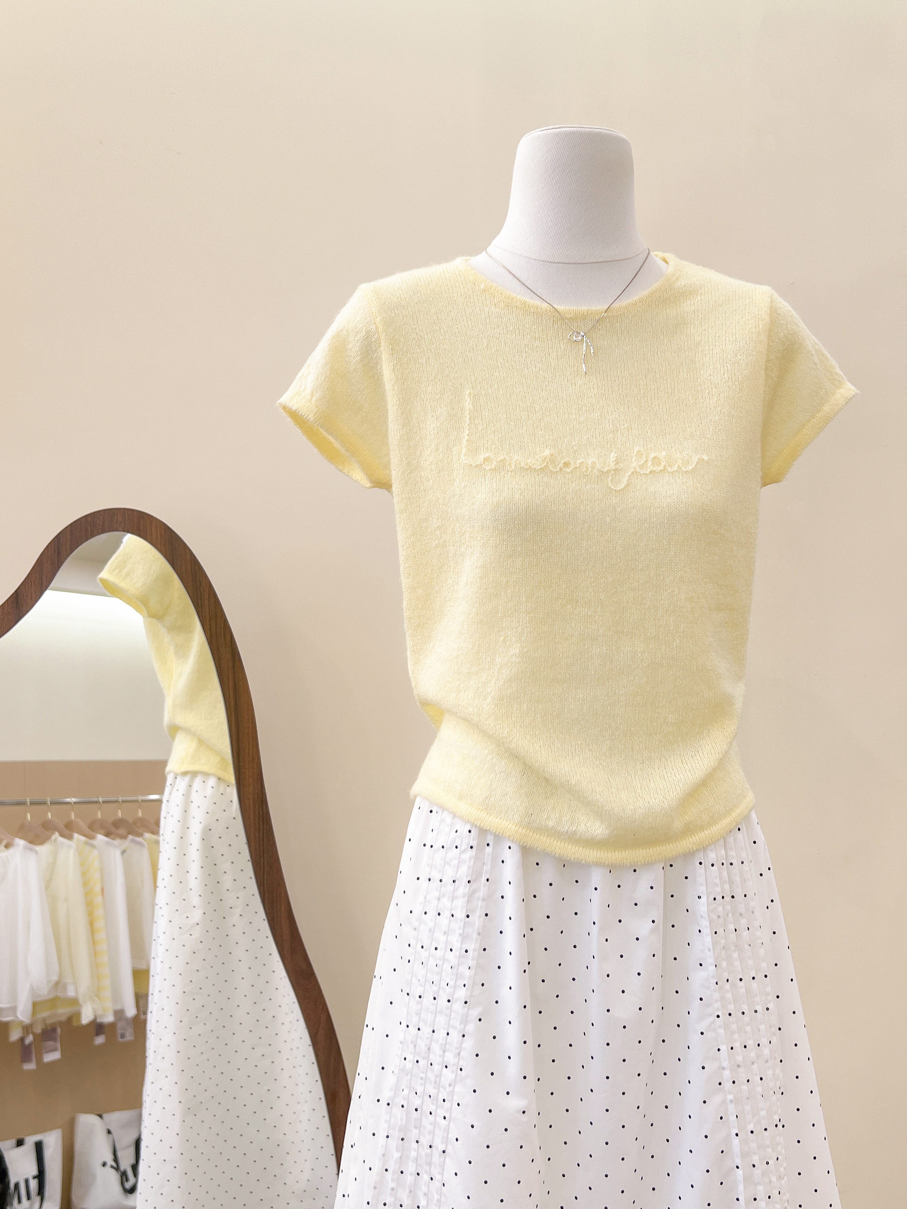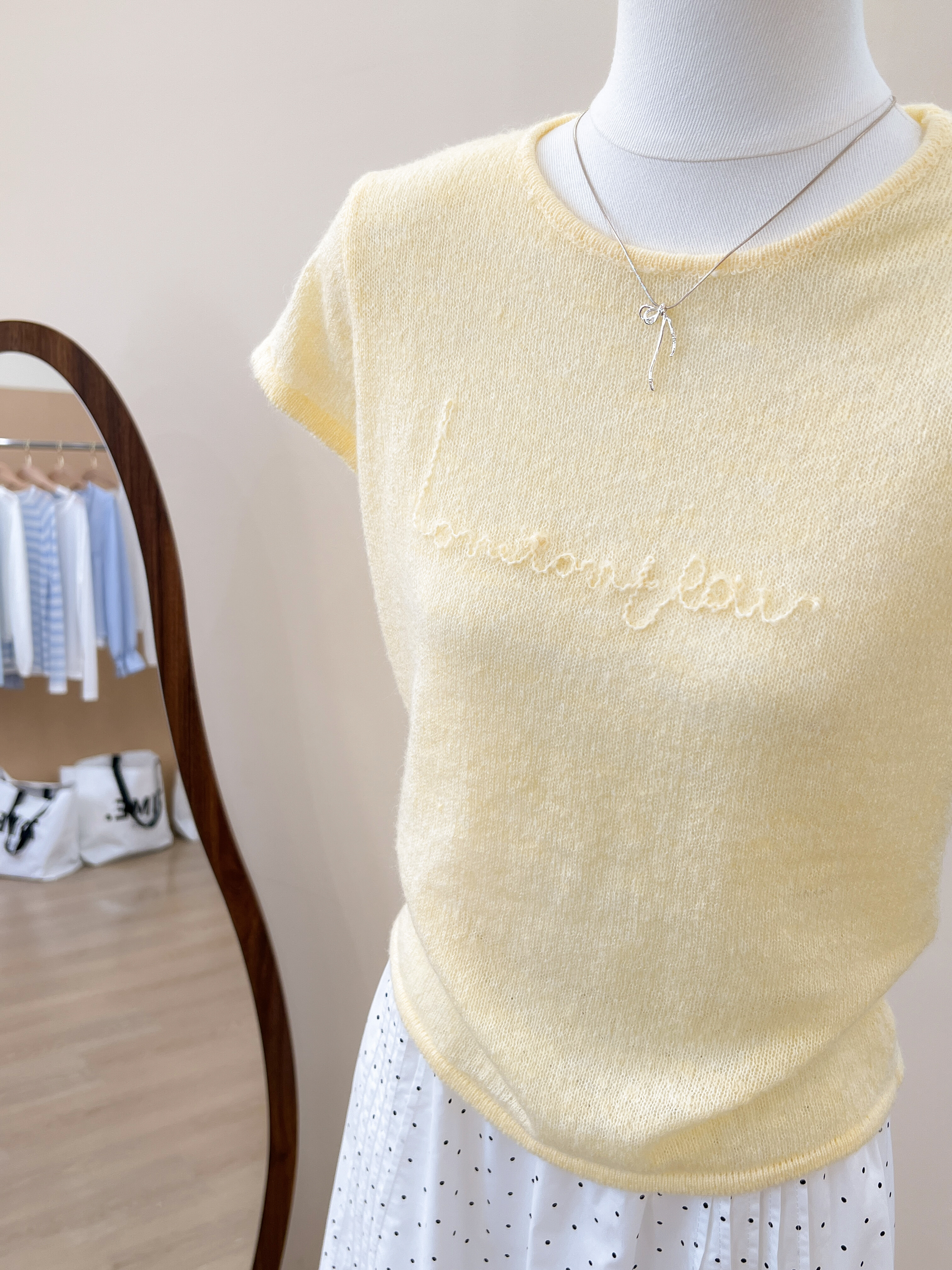 실사 황색 알파벳 자수 니트 반팔 티셔츠 여성 여름 고유 한 아름다운 디자인 센스 긍정적 인 어깨 라운드 넥 맨위