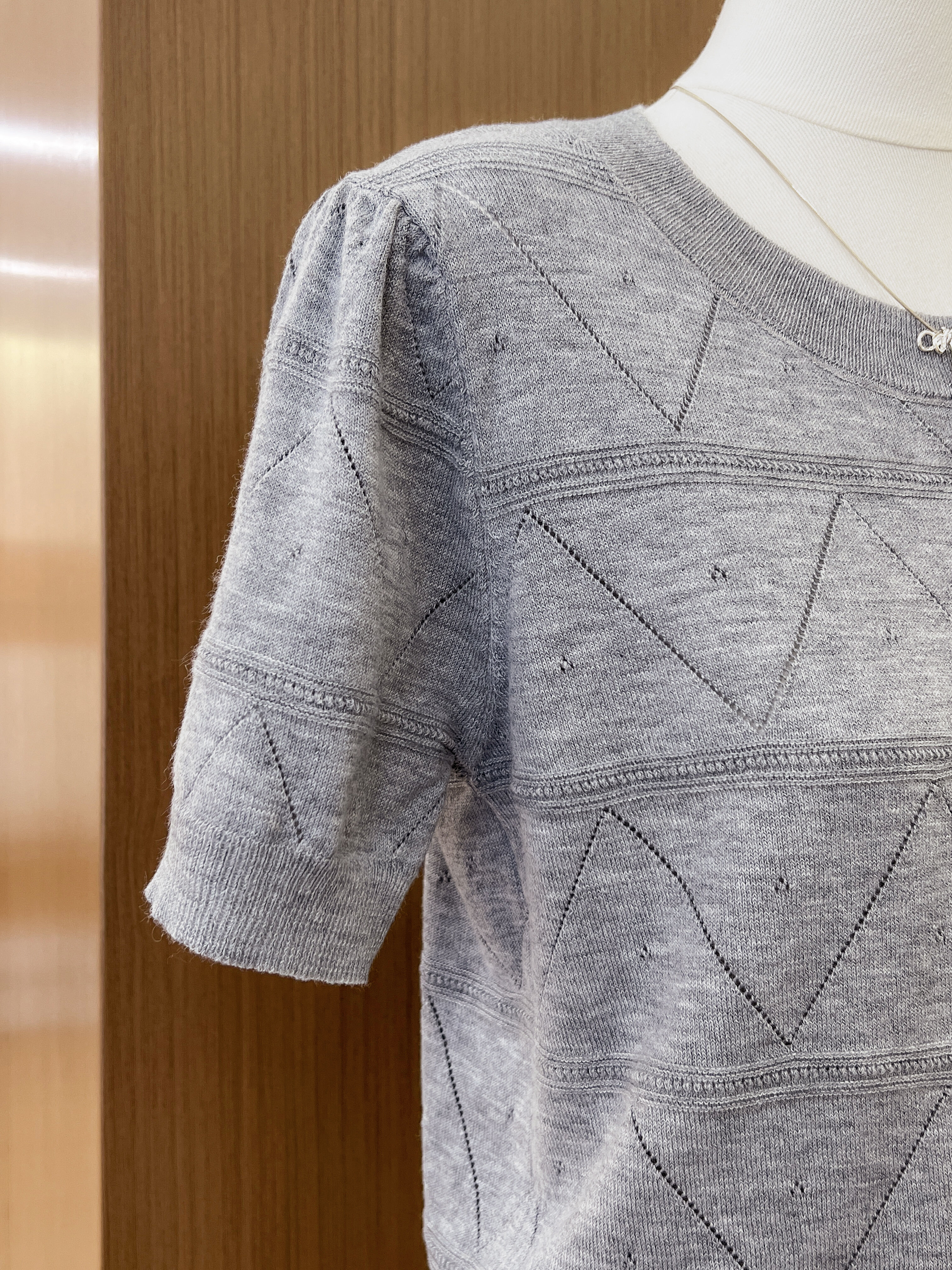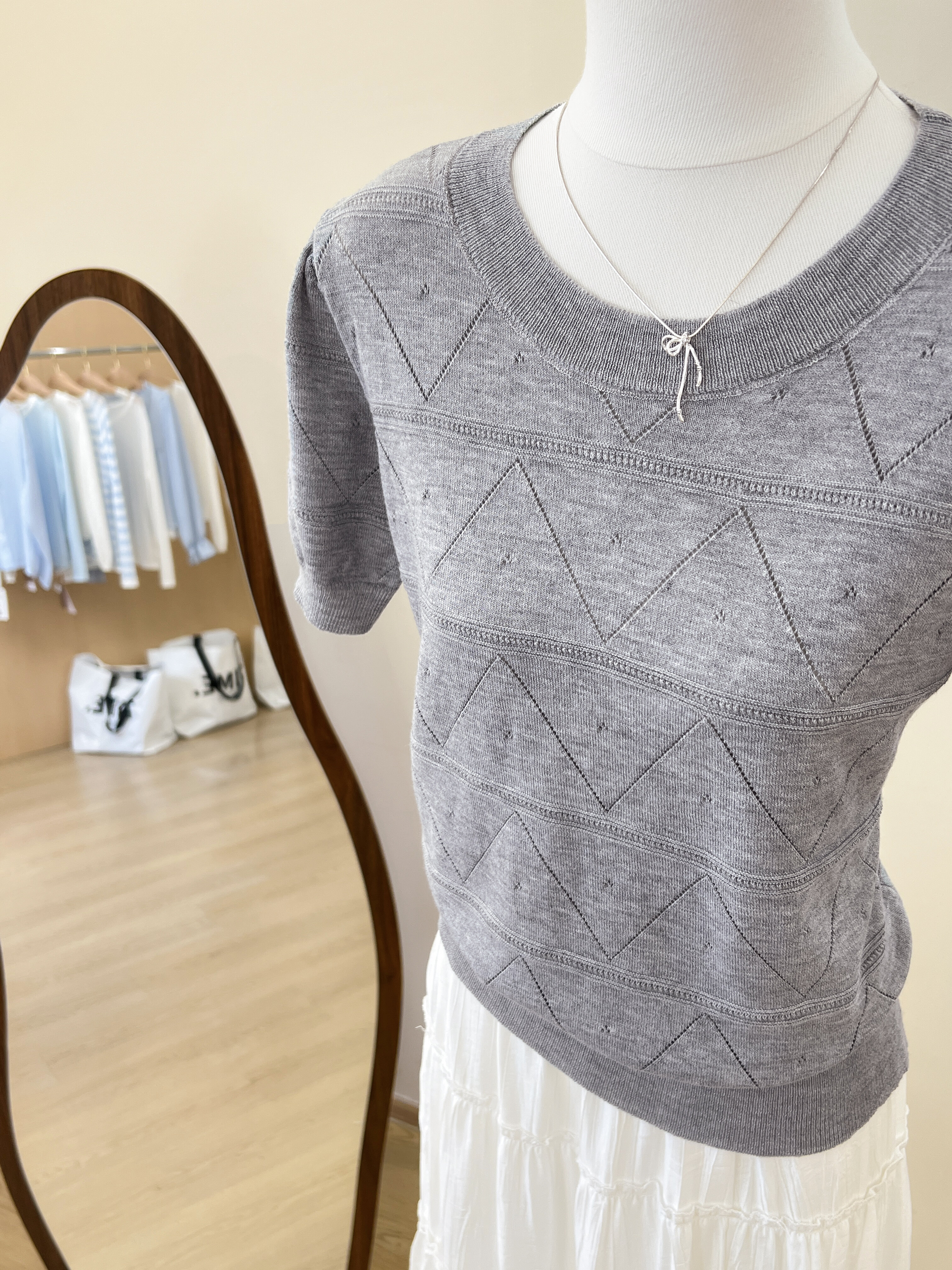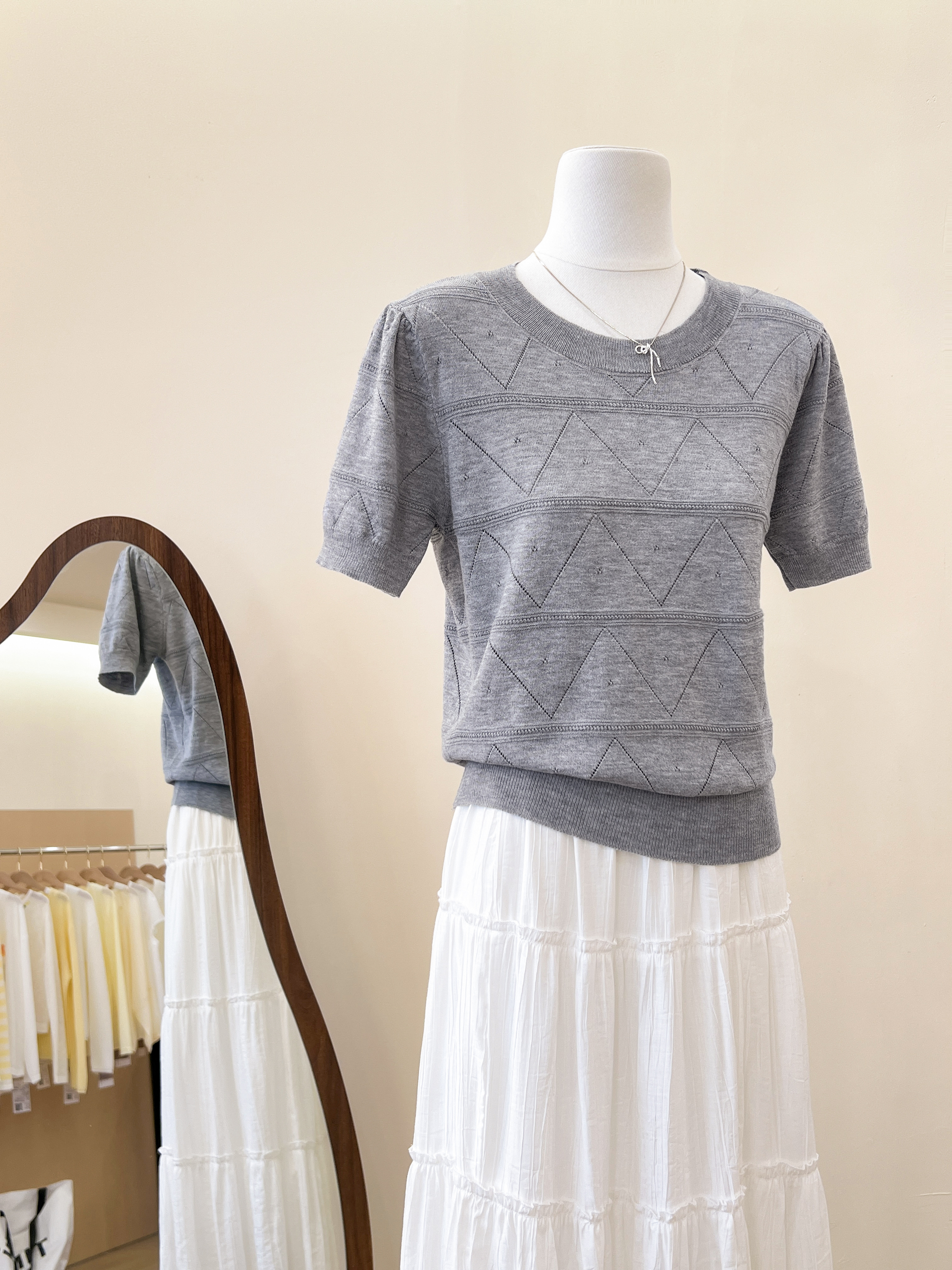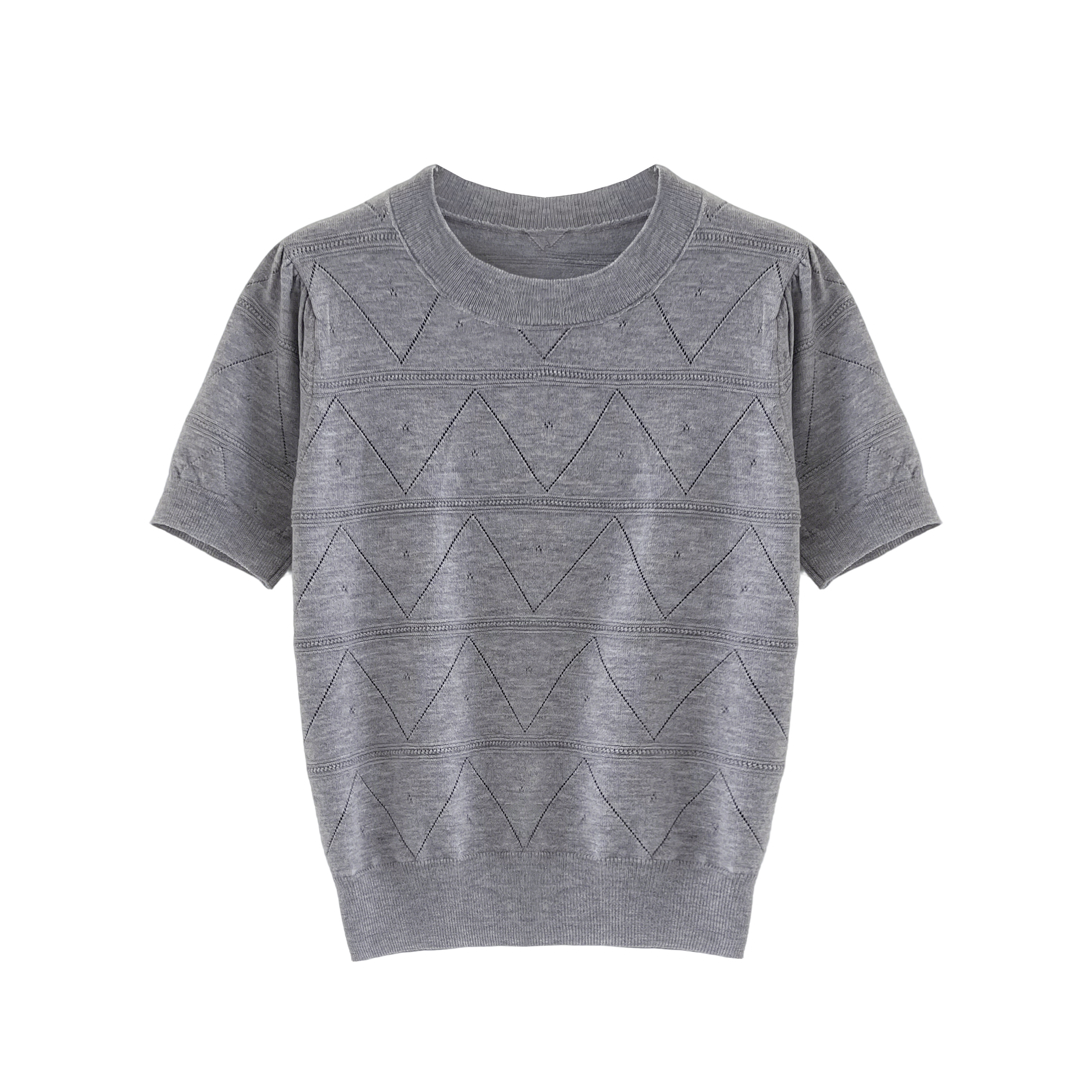 실사 프랑스식 회색 홀로우 아웃 니트 반팔 티셔츠 여성 여름 고급 센스 chic Chic 몸매 가꾸기 슬림해 보이는 맨위