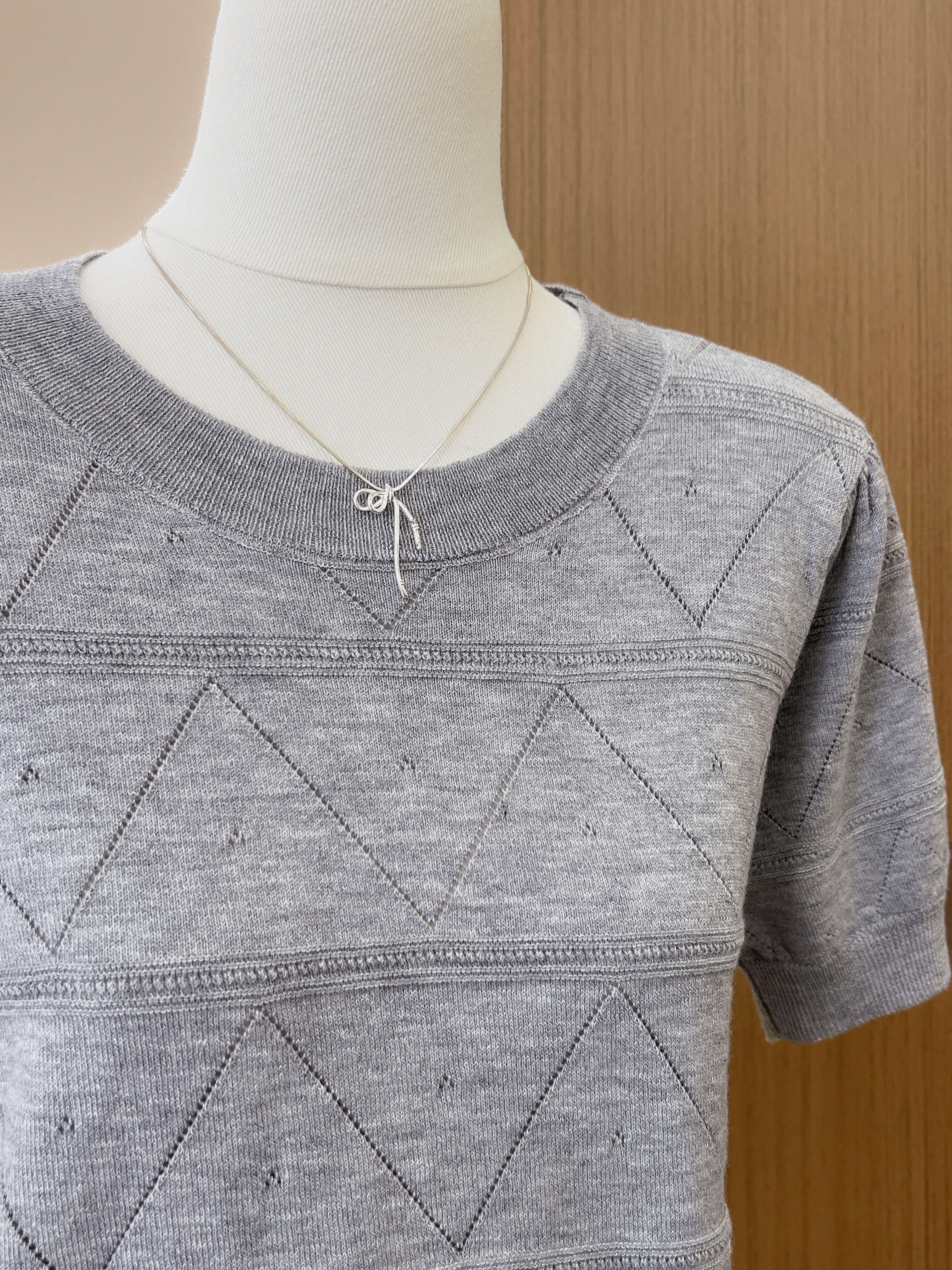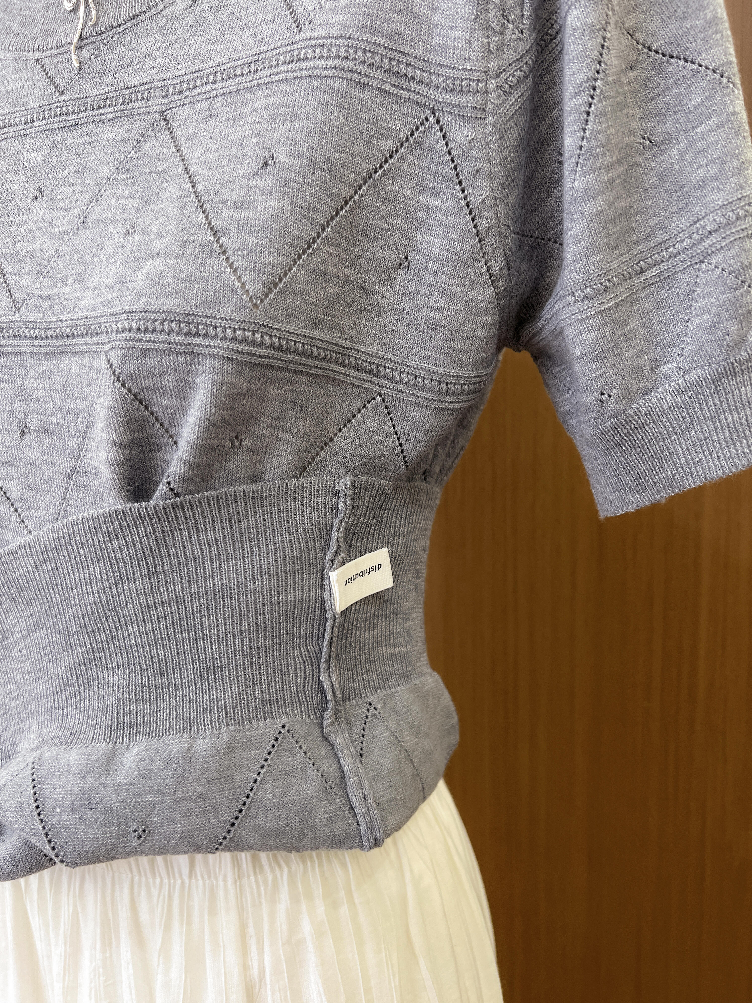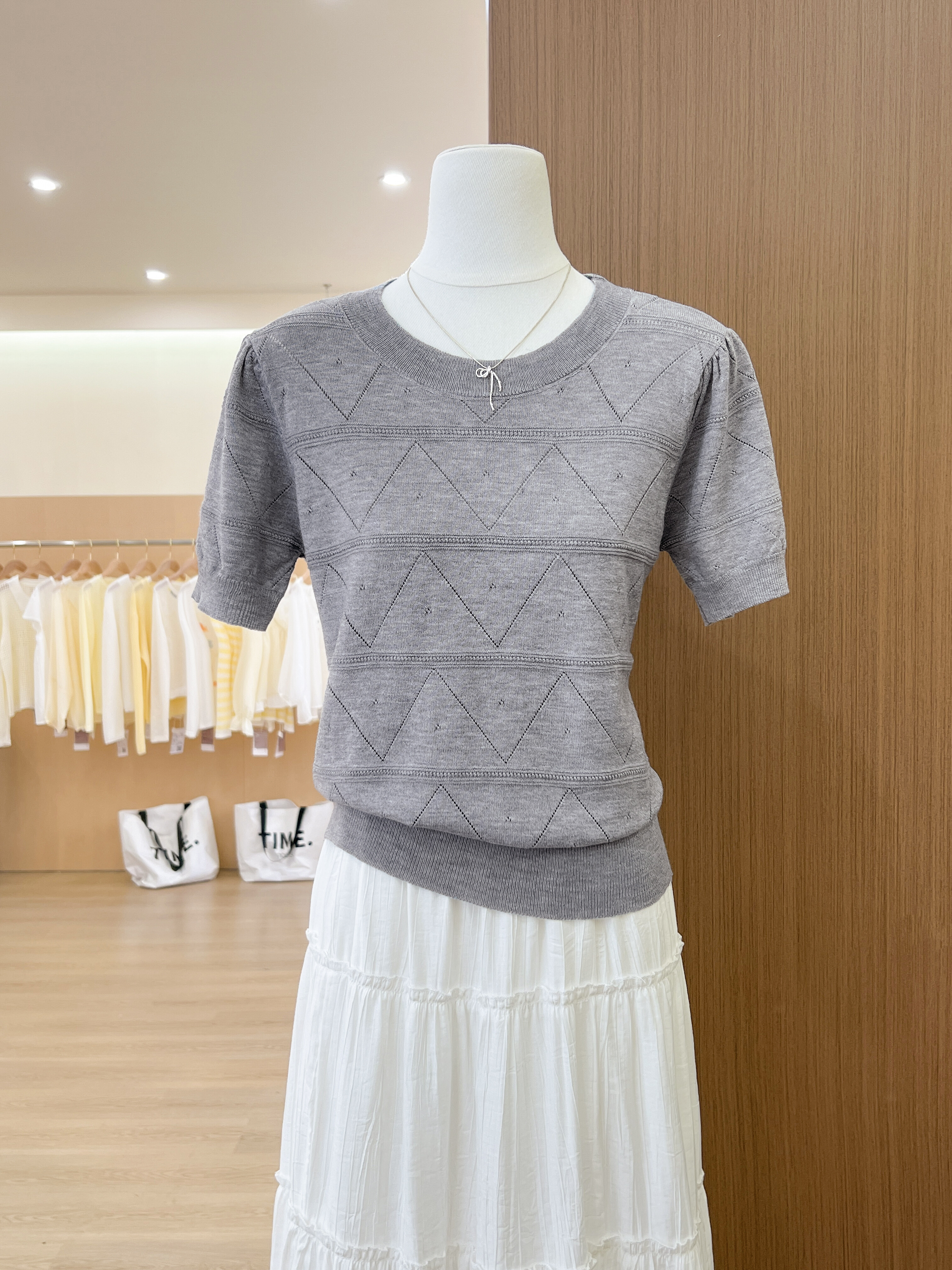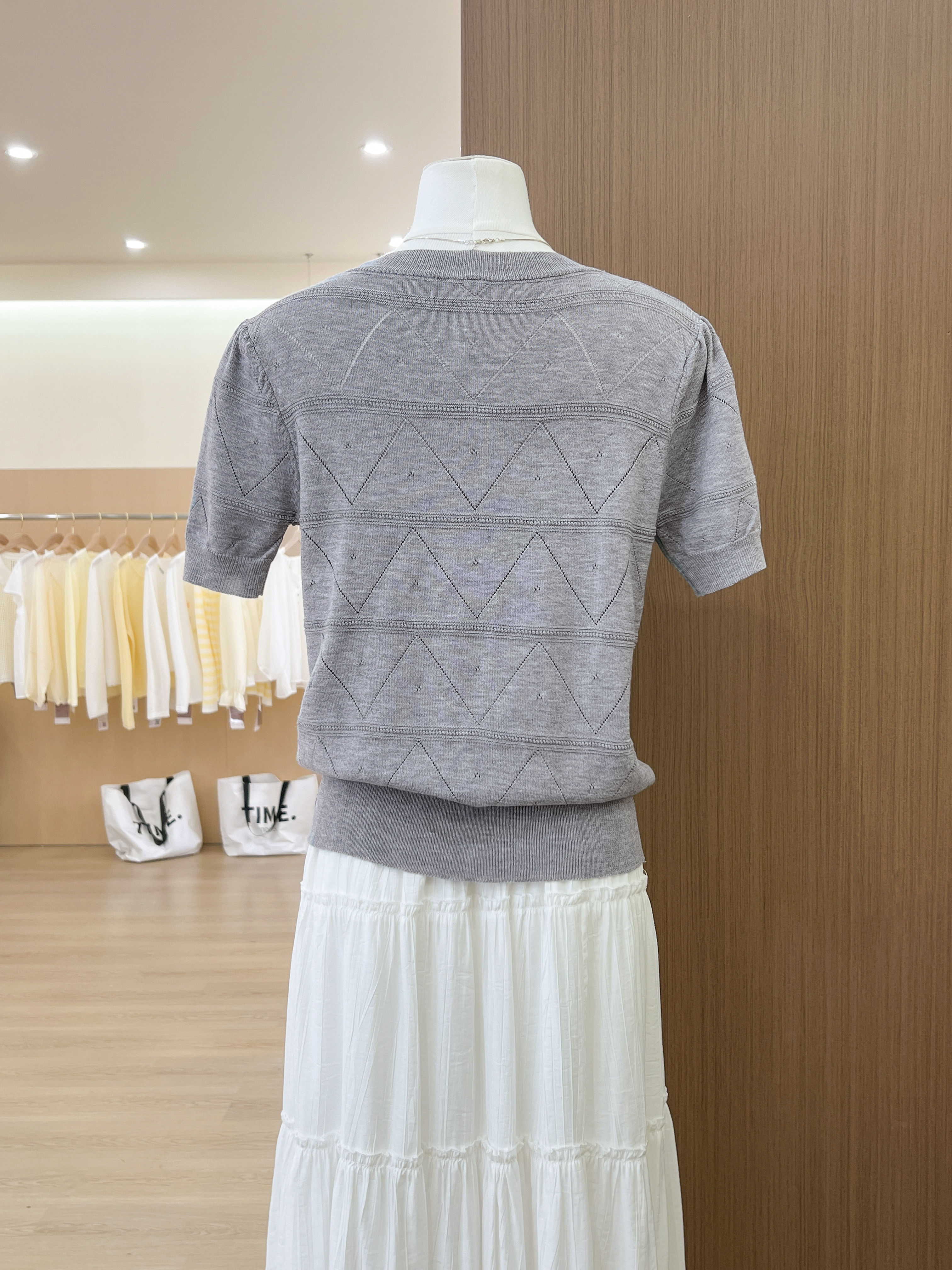 실사 프랑스식 회색 홀로우 아웃 니트 반팔 티셔츠 여성 여름 고급 센스 chic Chic 몸매 가꾸기 슬림해 보이는 맨위