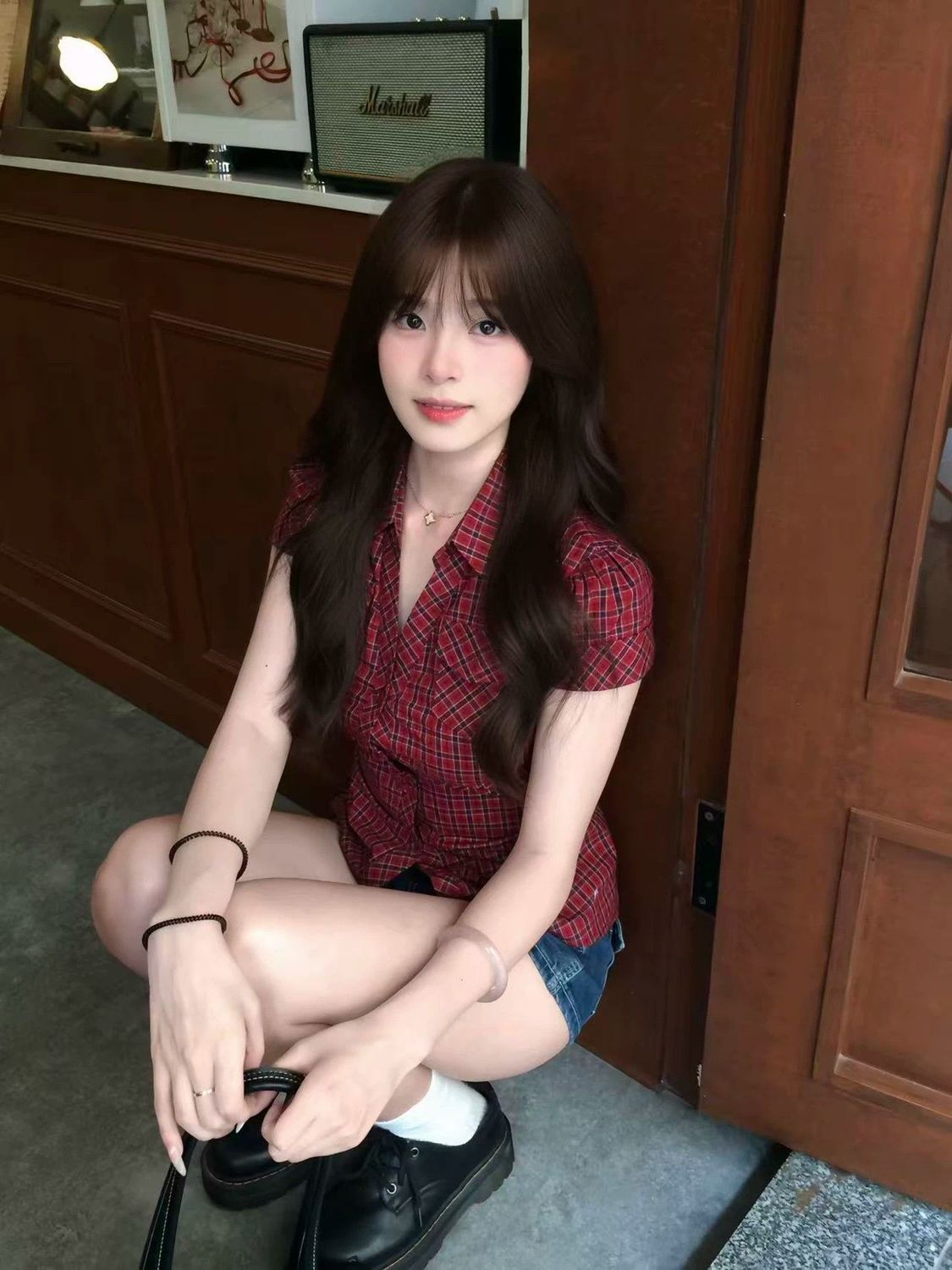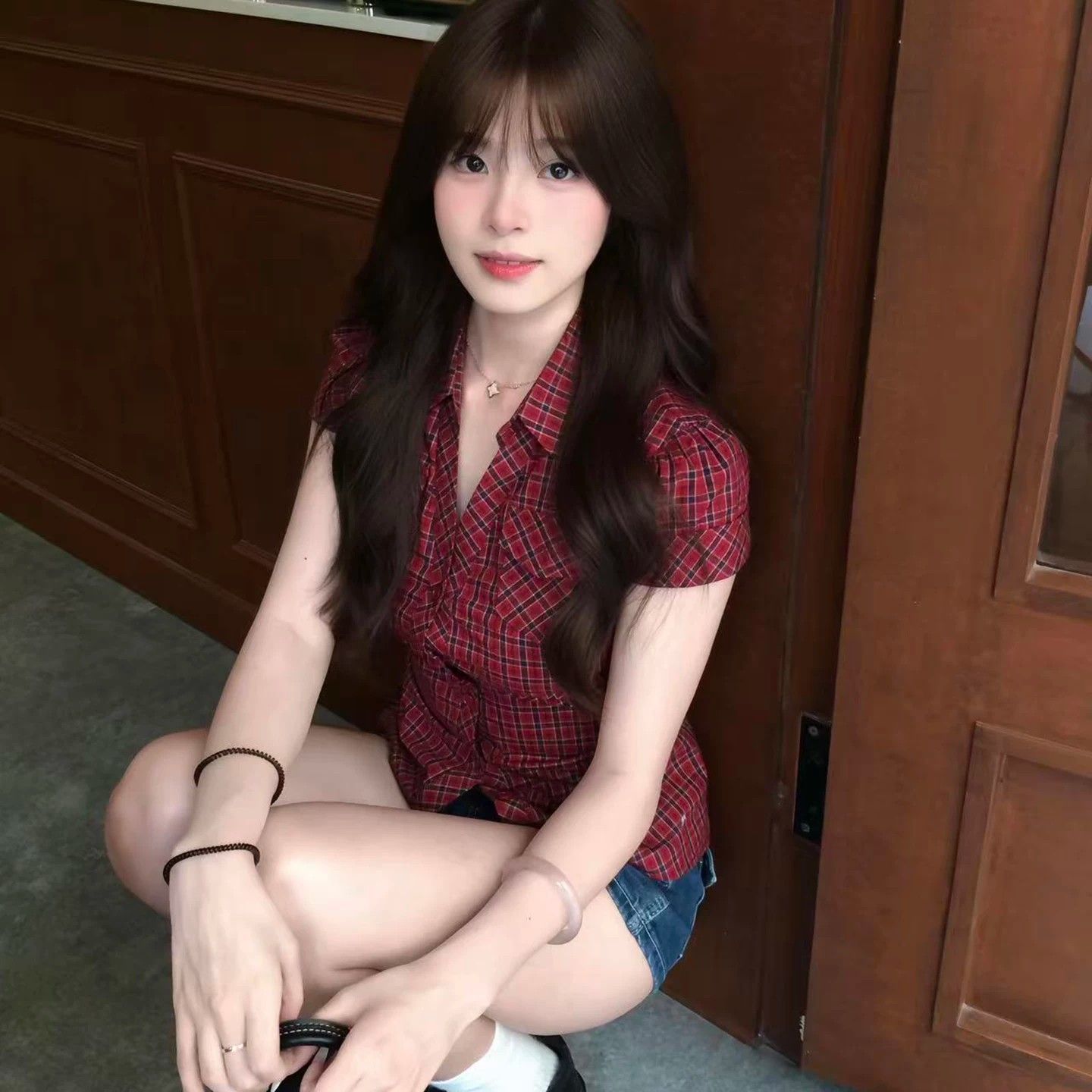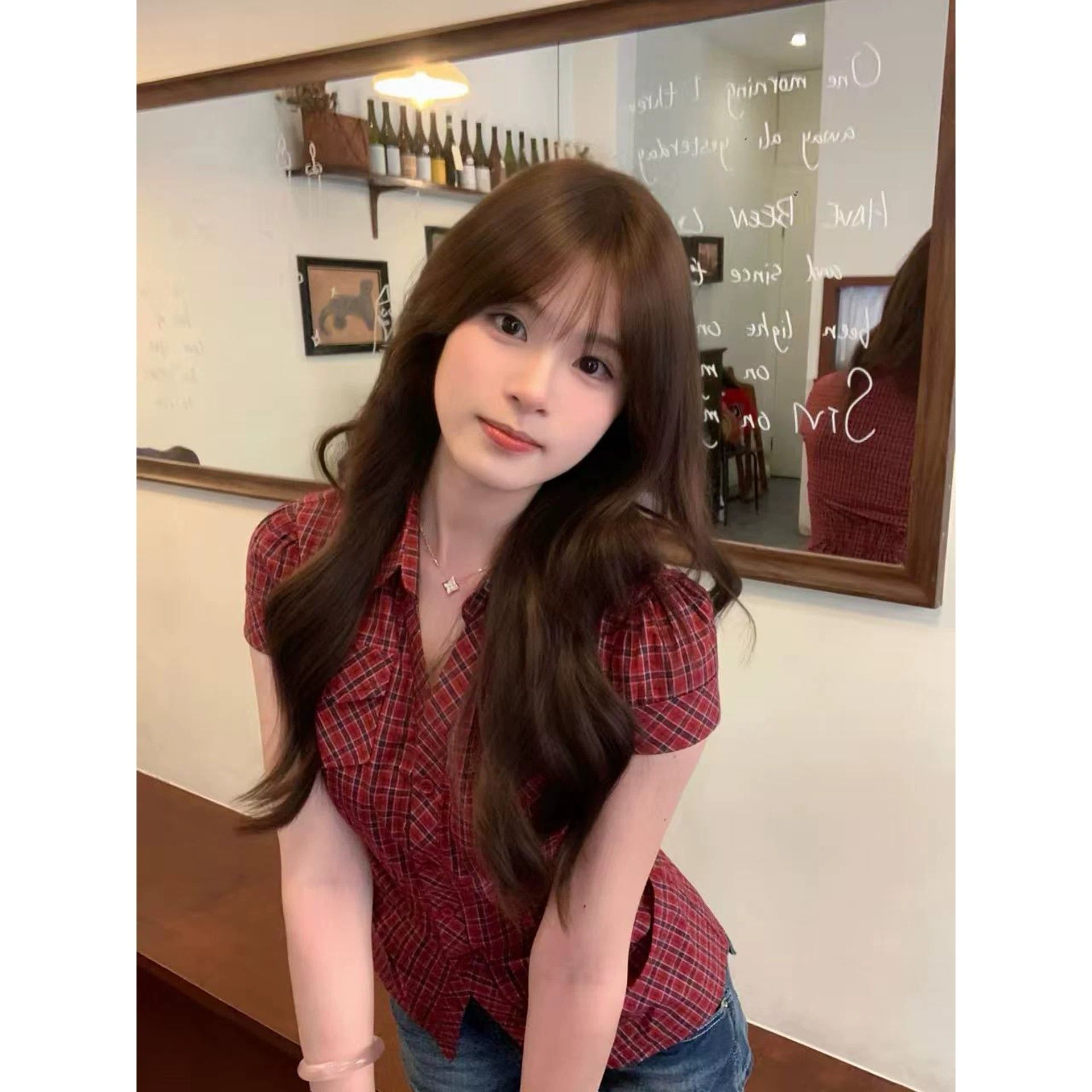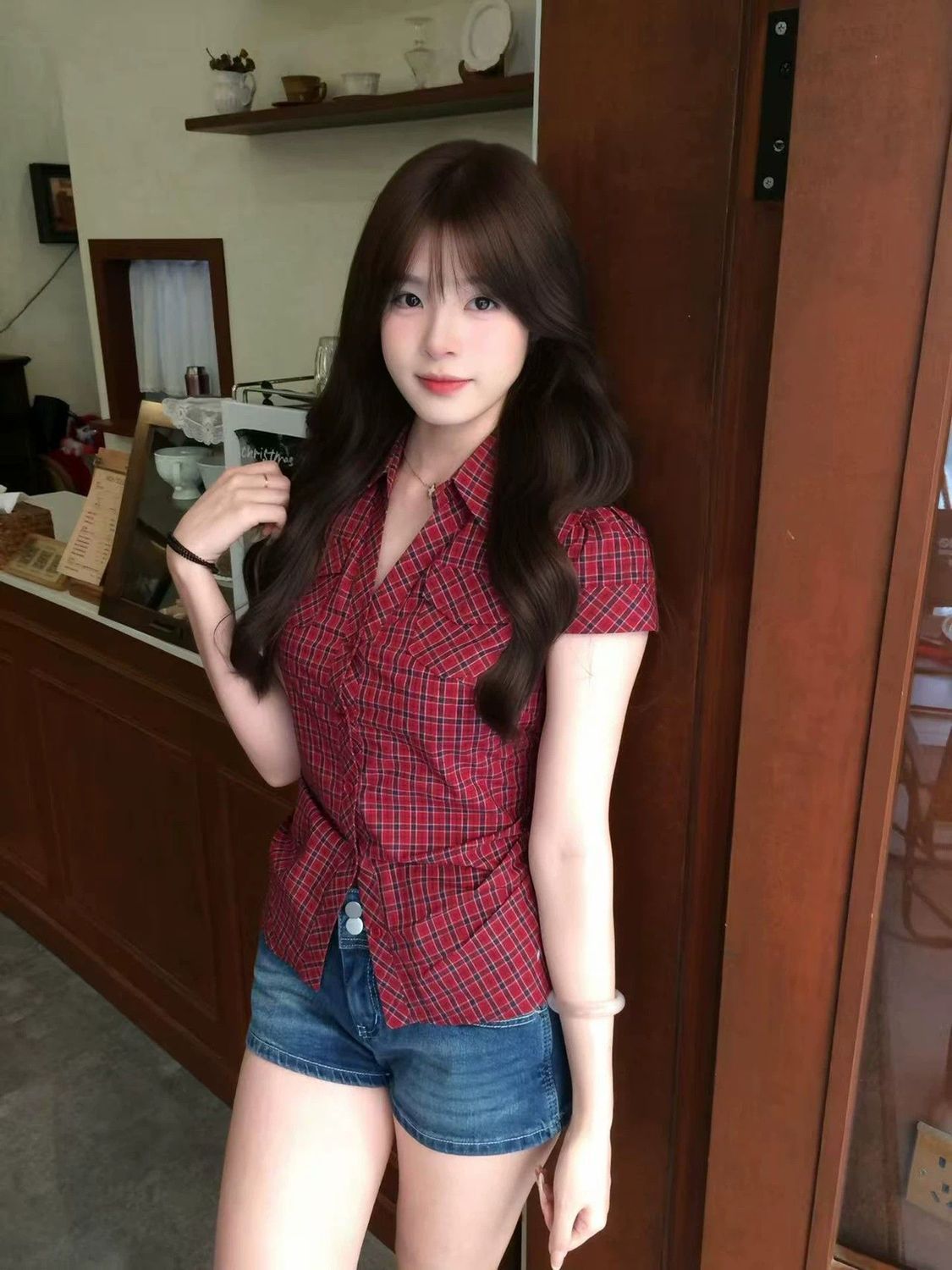 아메리칸 레트로 긍정적 인 어깨 한 부서 빨간색 셔츠 반팔 여름 몸매 가꾸기 슬림해 보이는 셔츠 맨위