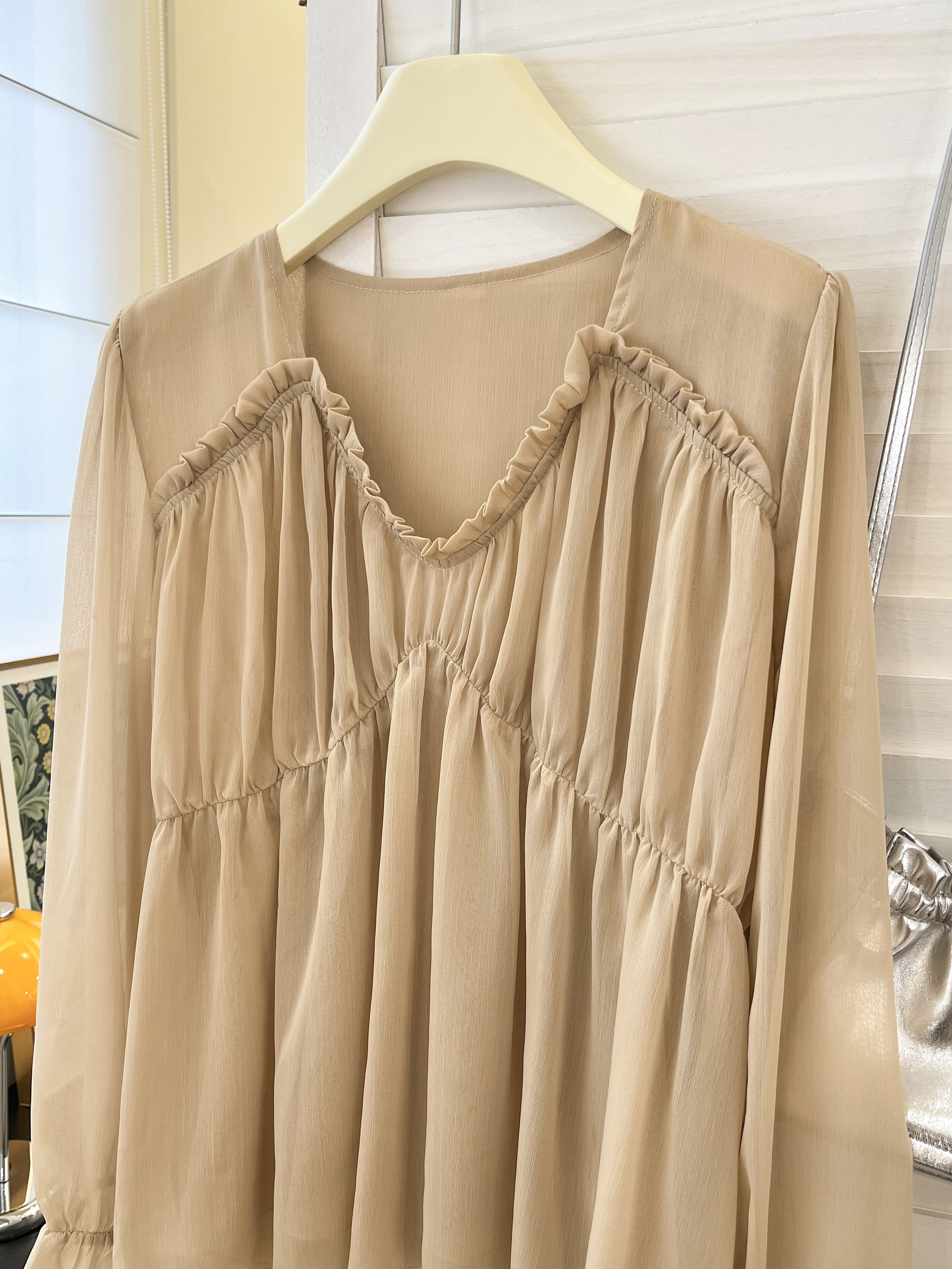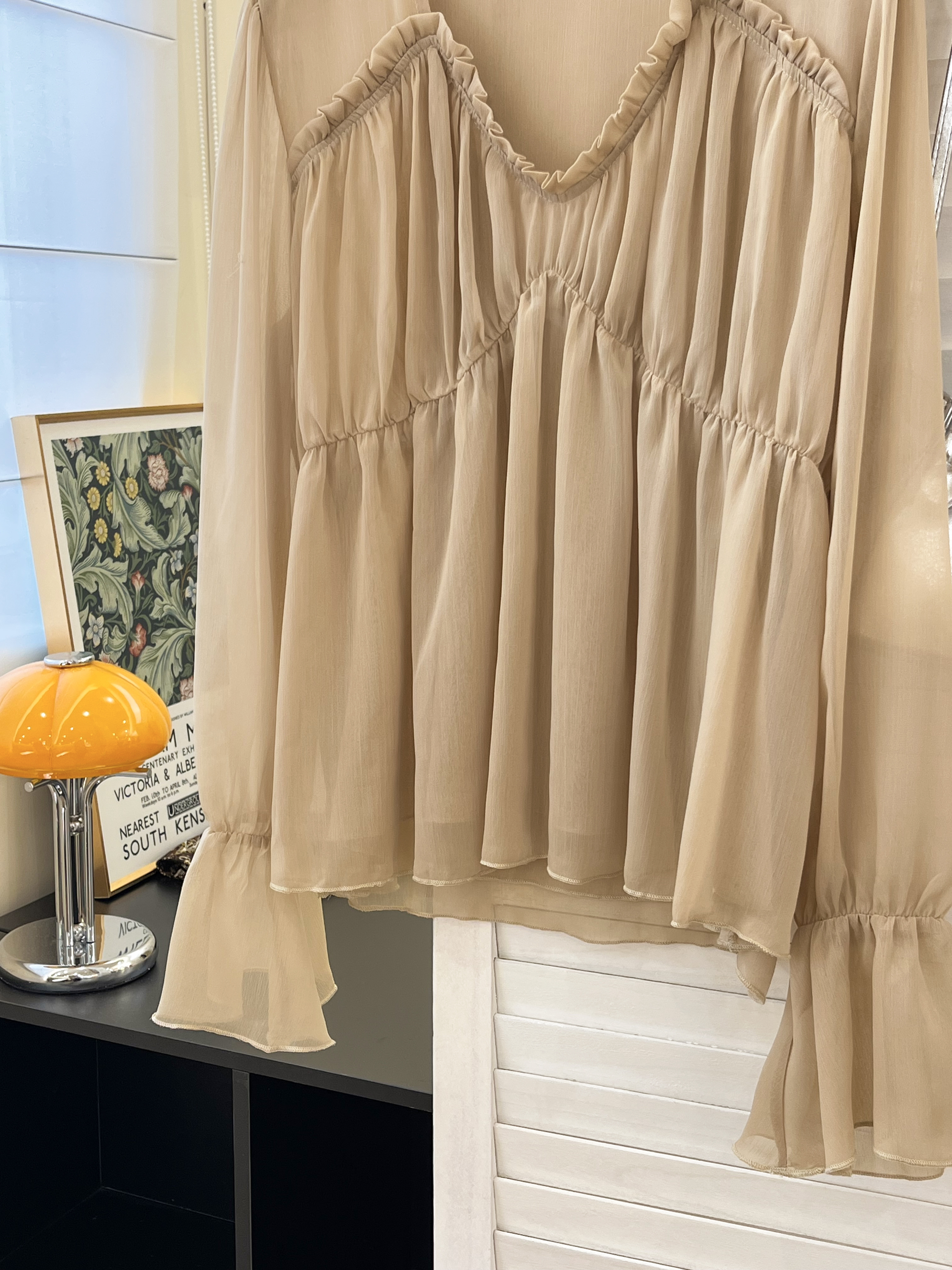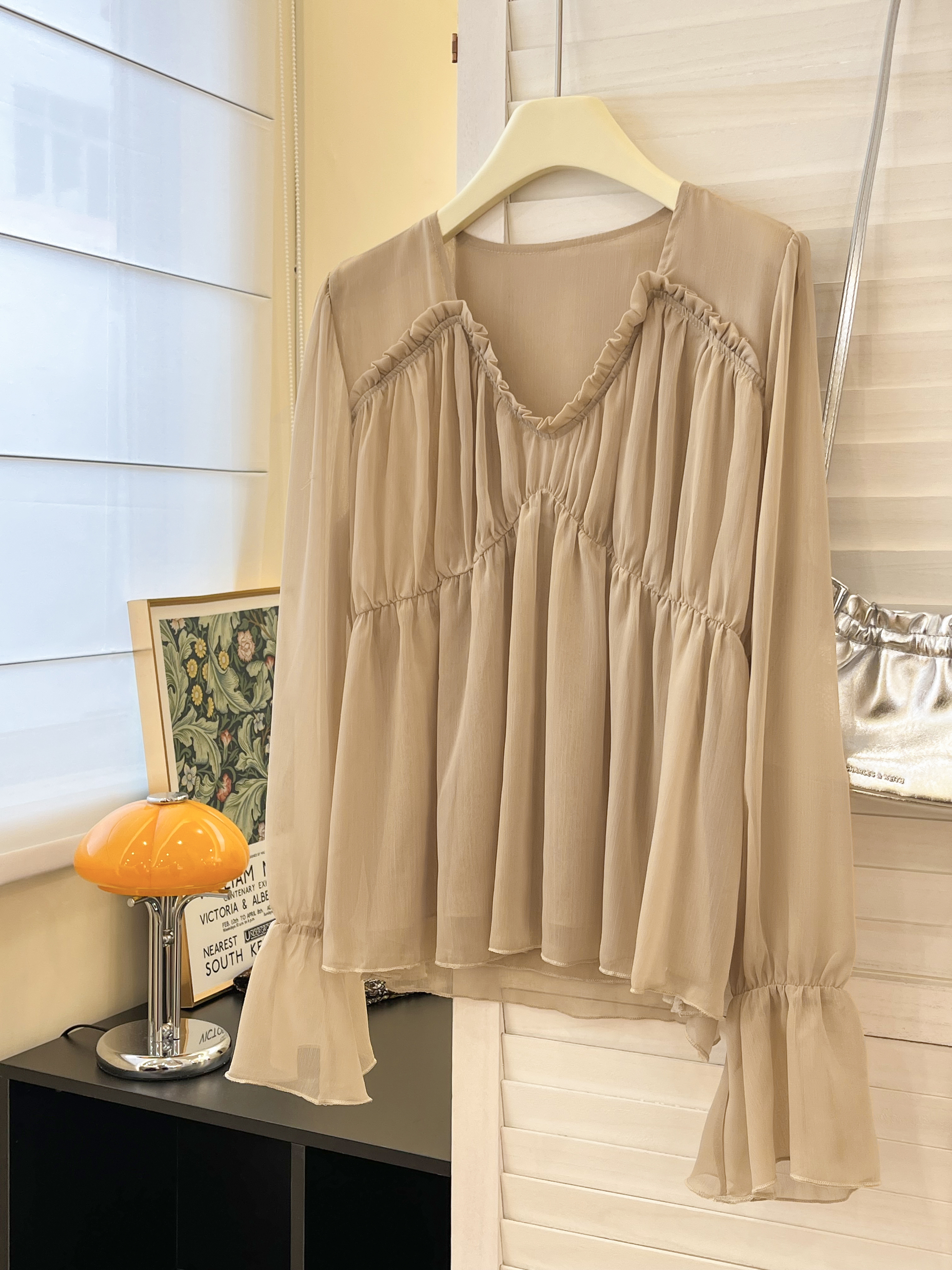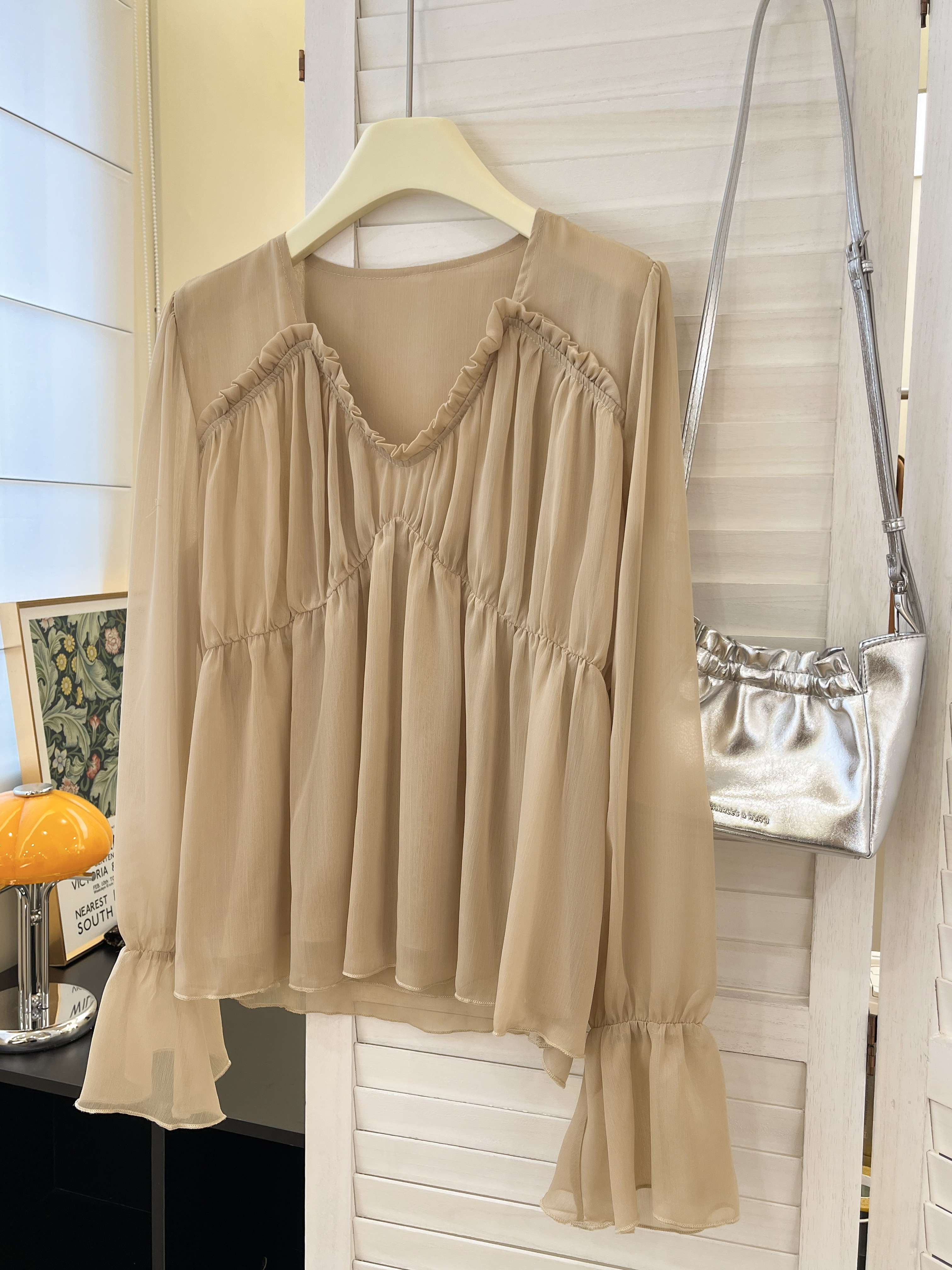실사 살구 색상 V넥 프릴 긴팔 티셔츠 기본 셔츠 여성 봄 여름 인사이드 가져 가라. 몸매 가꾸기 디자인 센스 쇼트 스타일 맨위