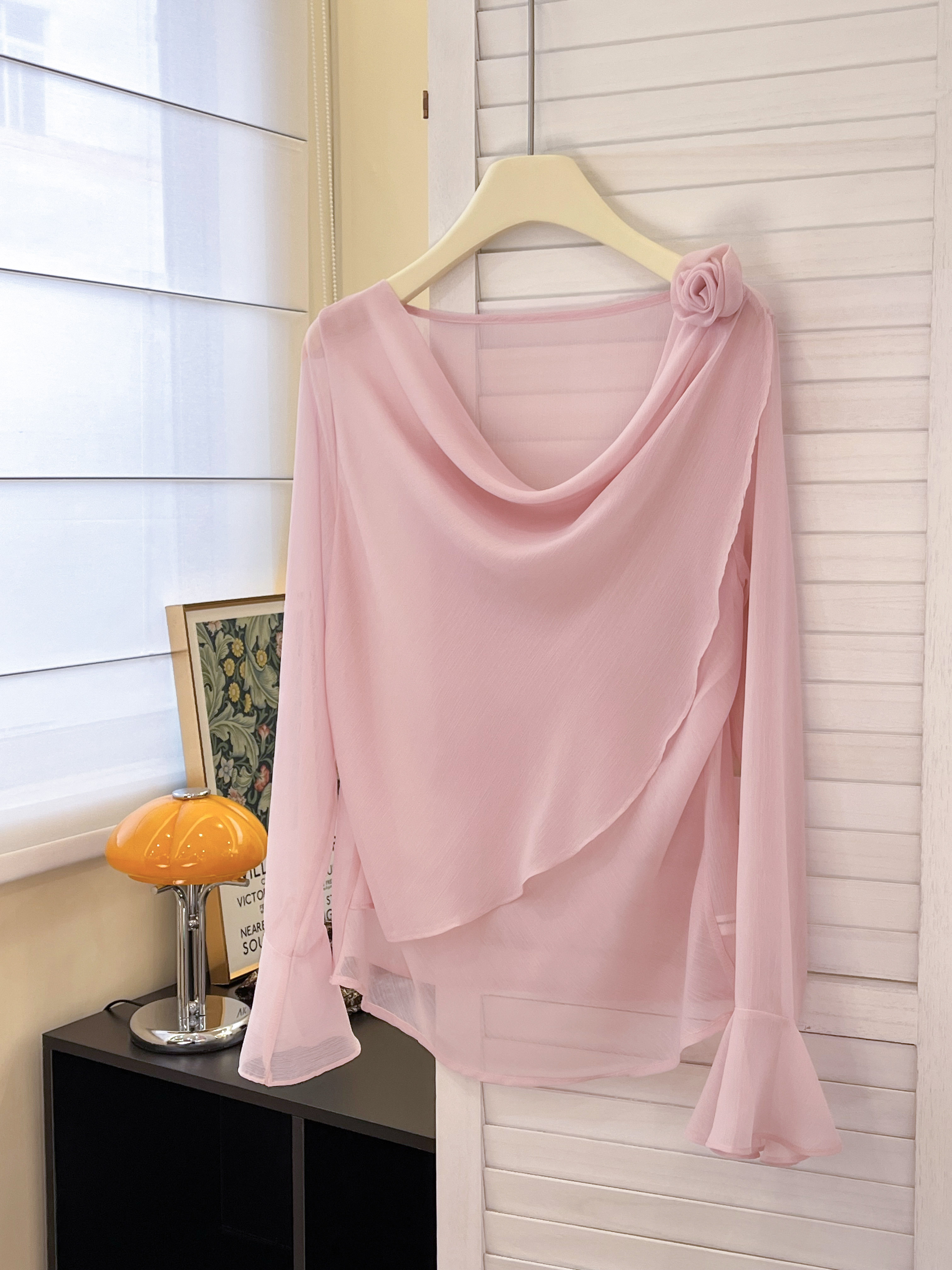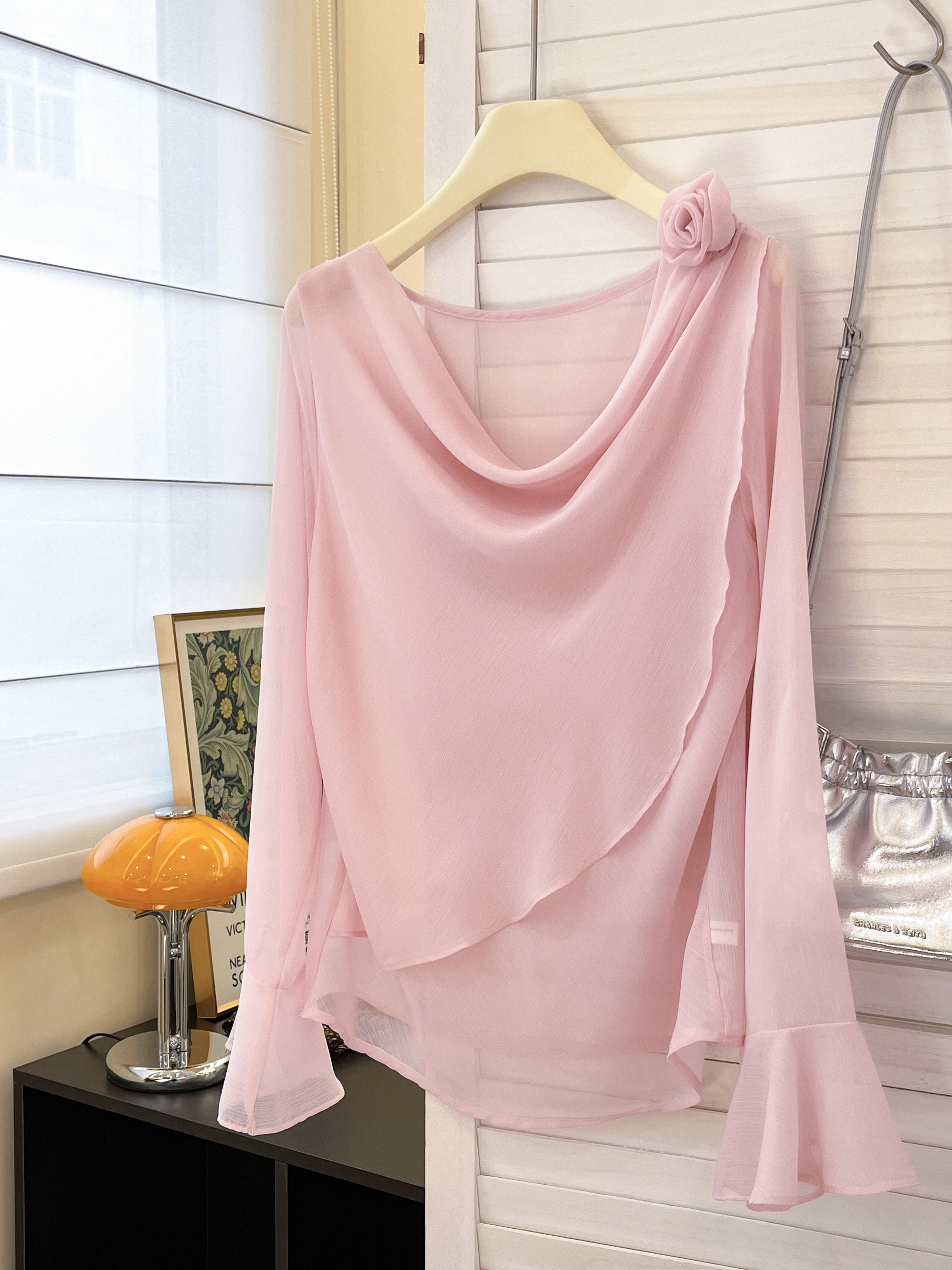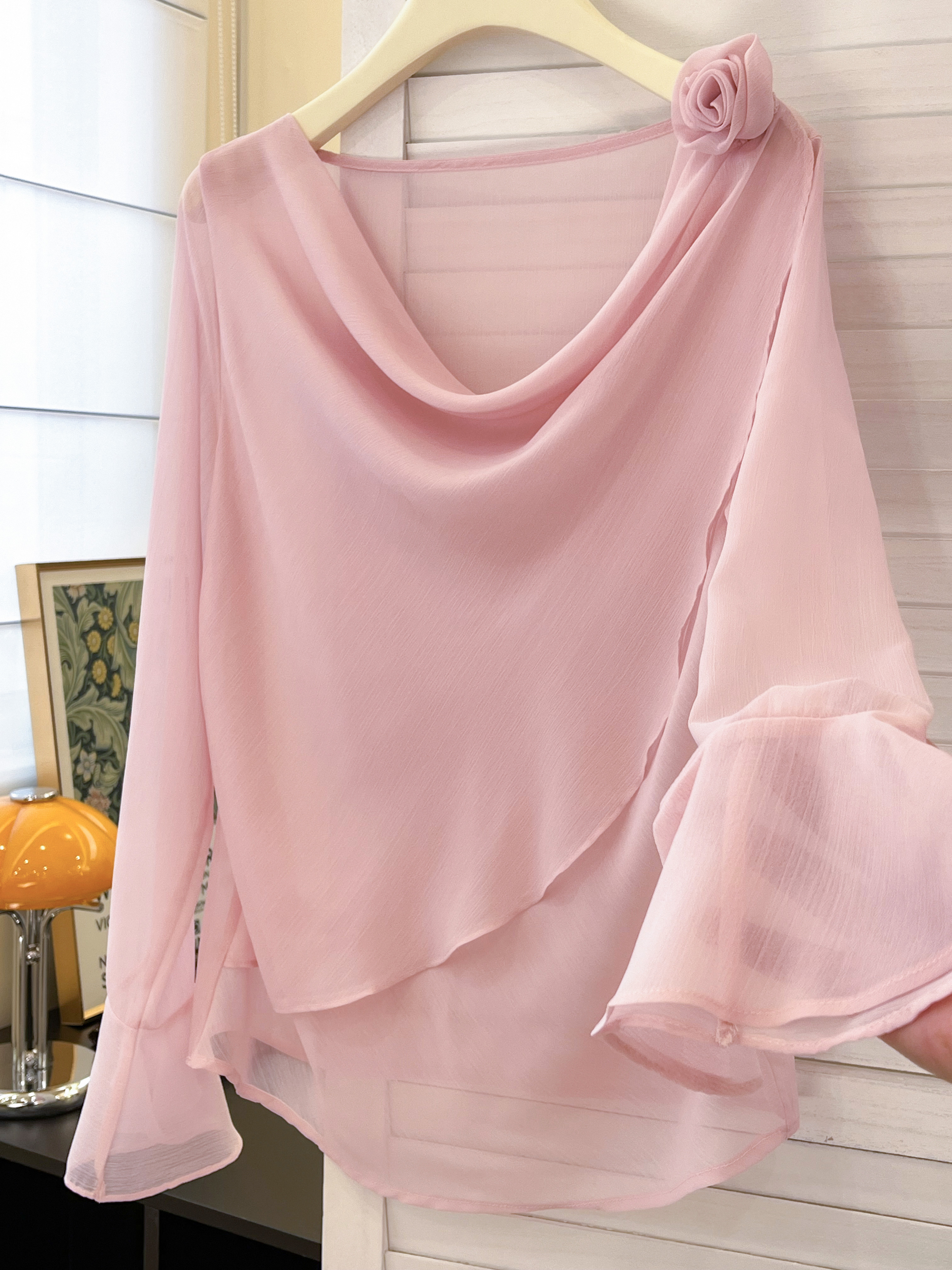 실사 부드러운 핑크색 3 차원 꽃 흔들다 칼라 맨위 여성 고유 한 아름다운 슈퍼 잘 생긴 나팔 소매 쉬폰 작은 셔츠