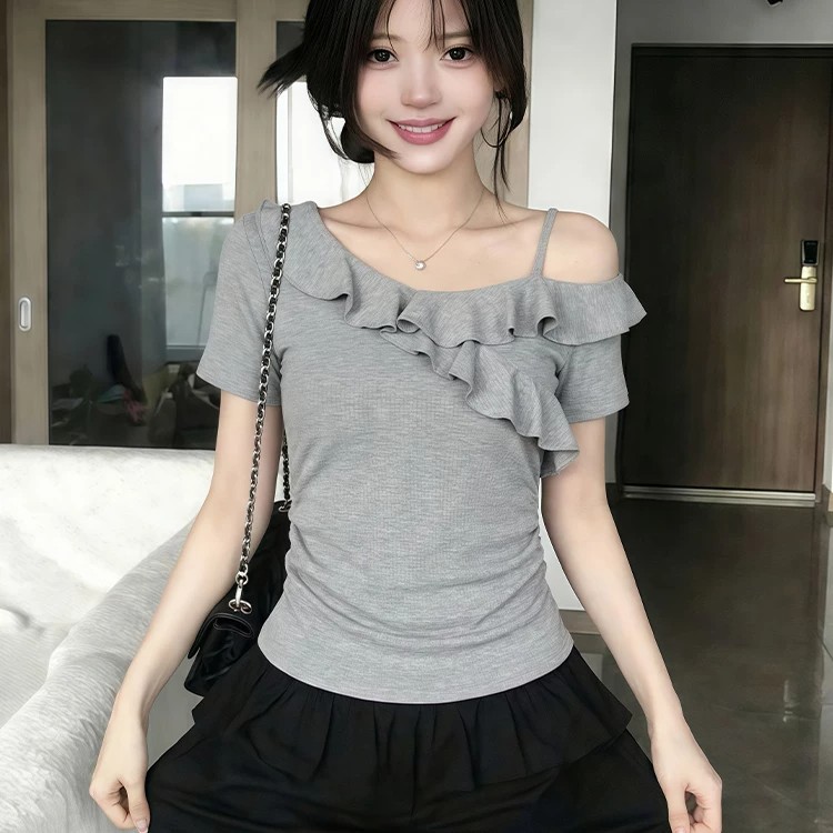 260 그램 사람들 면 회색 고급 센스 프릴 비스듬한 어깨 반팔 티셔츠 여성 여름 핫걸 오프숄더 아름다운 맨위